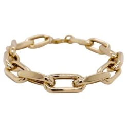 This fantastic 6 millimeter (mm) wide paperclip medium link chain was made for us in Italy with recycled 14 karat gold and finished beautifully to the high standards Italian jewelry is known for! This wonderful statement chain is made affordable by the lightweight design of the links. To make these same size links in solid 14 karat gold would make the weight and movement of the chain a very different experience and the price would be enormously higher. This classy chain is wonderful on any hand! The slightly flattened sides of the links keep the design strong and wearable, while the rounded ends of each link keep the bracelet movement fluid and supple. A touch of thoughtful design on this bracelet is how the loop for the clasp is soldered in place to make clasping and unclasping the bracelet a simpler maneuver. The brightly polished bracelet measures 7.5 inches long, with a smoothly rounded oval lobster claw clasp, and is stamped « 14KT » « ITALY ». We can make this bracelet for you in a wide range of lengths. Please reach out and we will provide a quote! The details for this wonderful medium link paperclip bracelet are listed below: