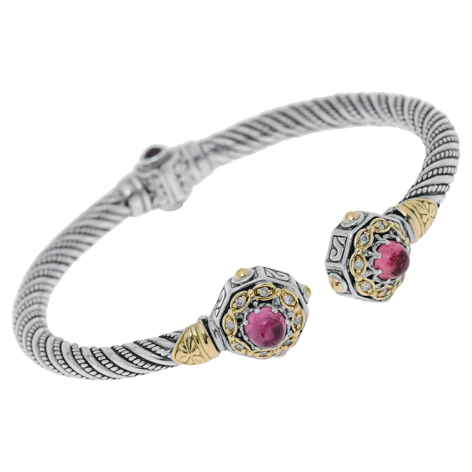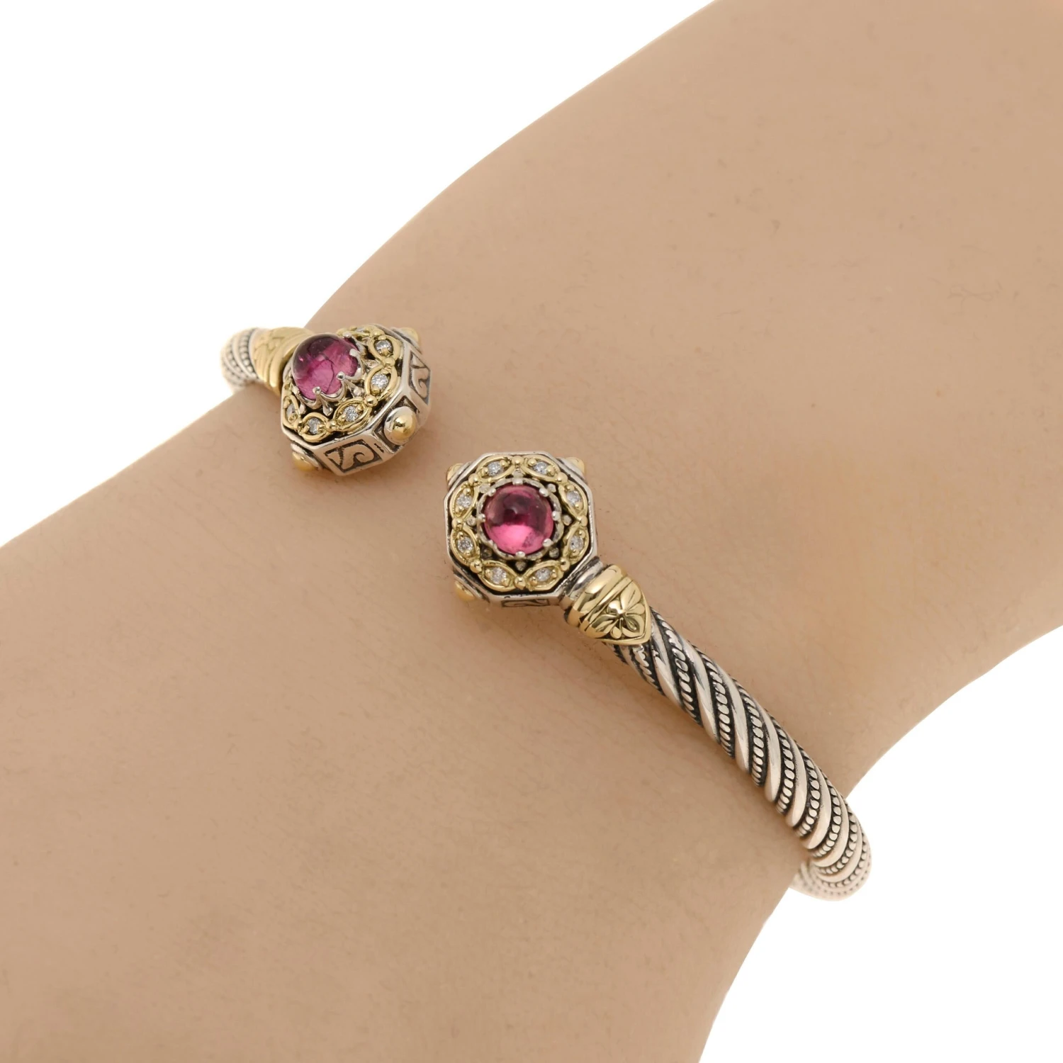 This charming Konstantino cuff bracelet features pink tourmaline and diamonds set in sterling silver with 18K yellow gold accents. The decoration size is 1/2” x 1/2”. The length is 6 inches. The weight is 26.2g.