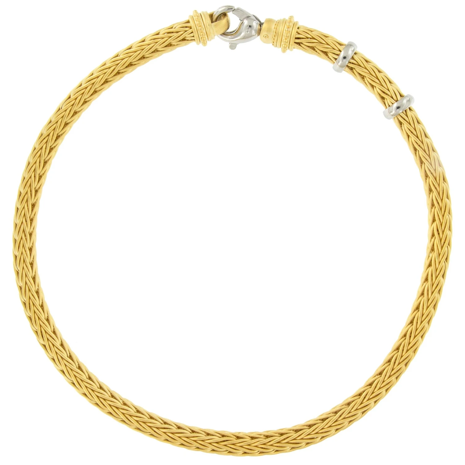 Rarely seen, this fabulous, heavy 18 karat yellow gold necklace is beautifully hand-fabricated (woven) in a wheat weave pattern. It is adorned with finials ornamented with granulation and Platinum accents. A spectacular example of goldsmith’s art, it has the chic understated style. This hand crafted necklace measures 17 inches in length with a heavy lobster clasp in Platinum. Comfortable to wear for day into night.