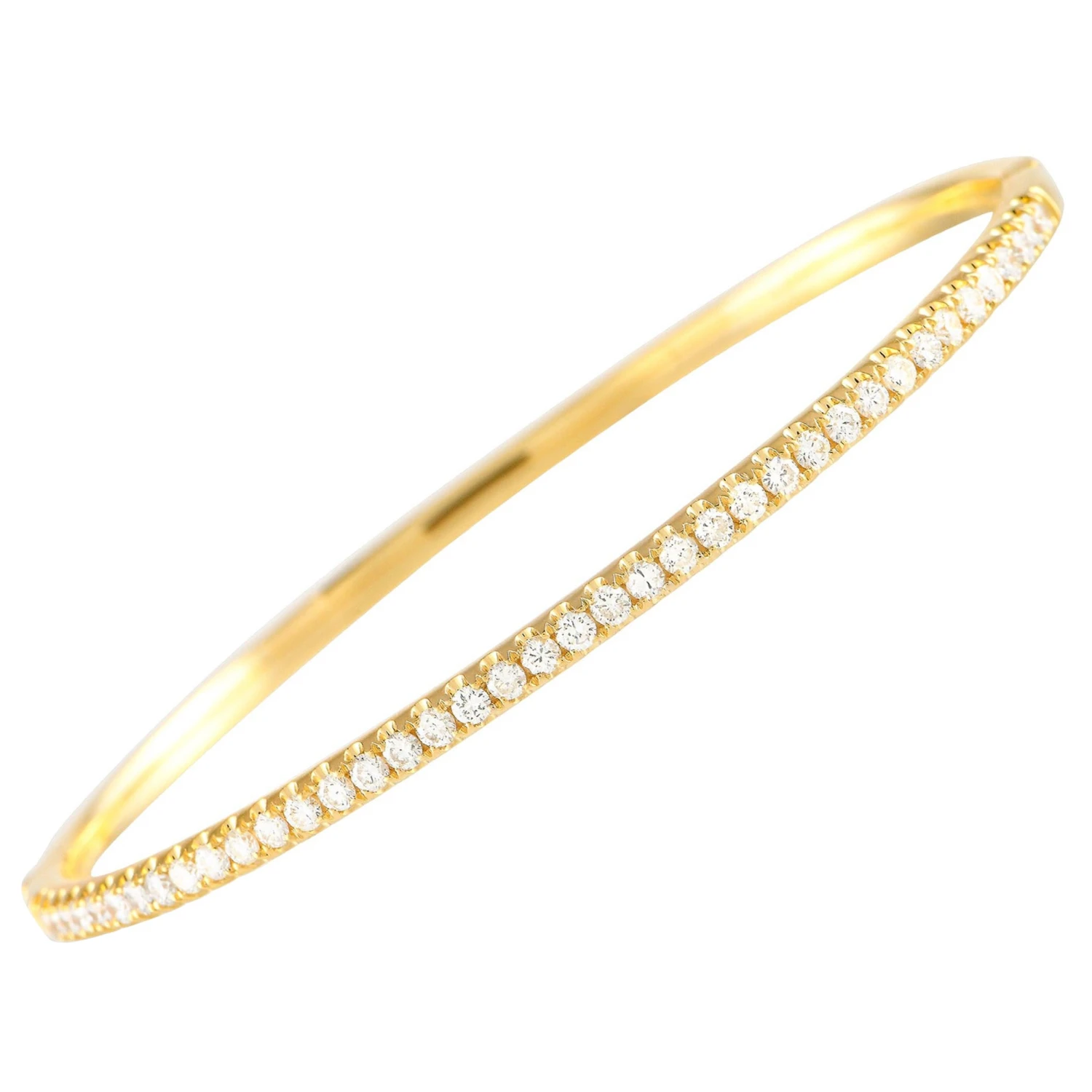 This sleek, refined bangle bracelet offers an easy way to add a touch of luxury to every day. A minimalist 18K Yellow Gold setting measuring 7″ wide beautifully showcases the series of sparkling diamonds, which together possess a total weight of 1.0 carats.