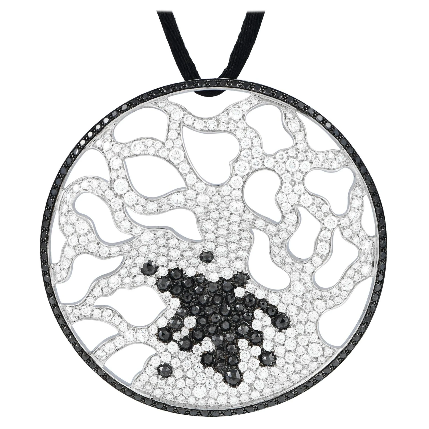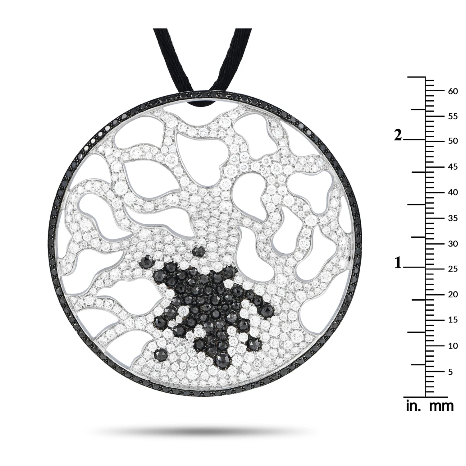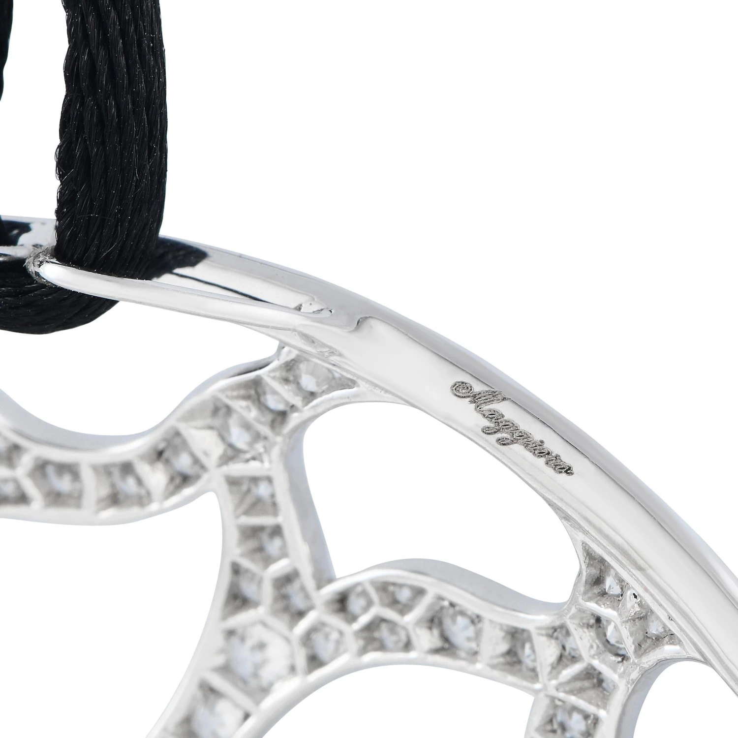 This pendant necklace from Maggioro’s Pave & Pearl Collection is opulent and shines with diamonds. The necklace has a black, silk cord from which hangs an 18K white gold pendant set with black and white diamonds.