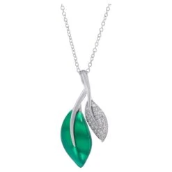 Mimi Milano 18K white gold pendant pendant features illuminating carved leaves with 0.2ct. tw. diamonds and Green Agate. The decoration size is 5/8″ x 1 1/4″. The length is 17″. The weight is 6.1g.