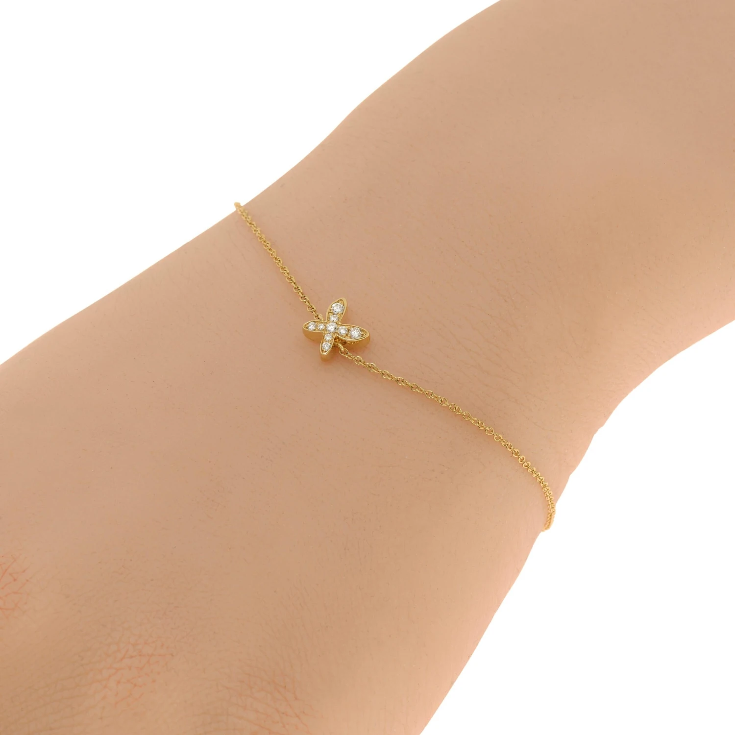Mimi Milano 18K yellow gold charm bracelet features 0.09ct. tw. diamonds set in a delicate butterfly design. The decoration size is 1/4″. The length is 7″. The weight is 2g.