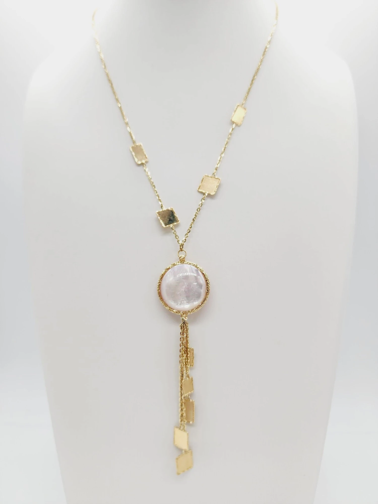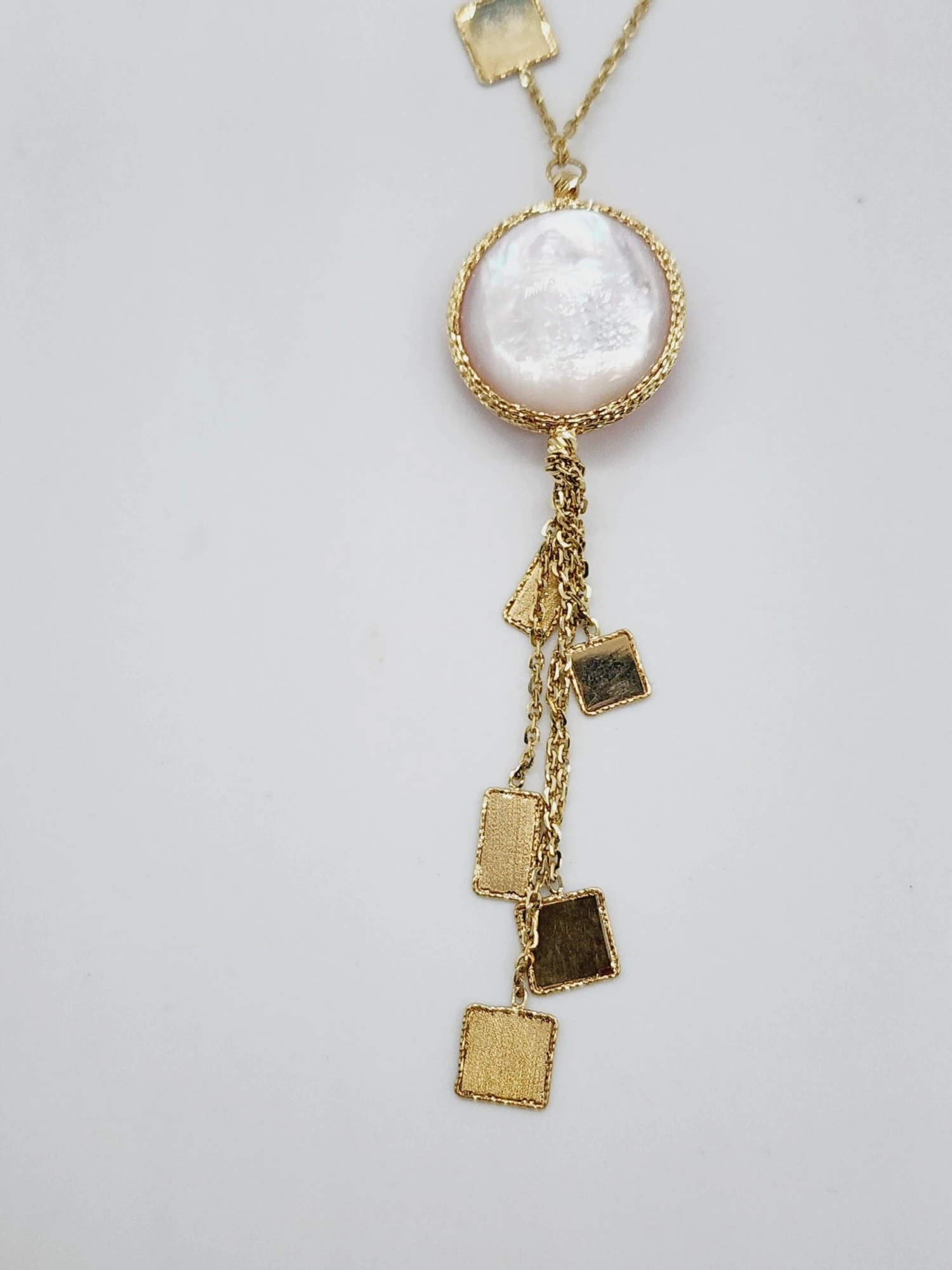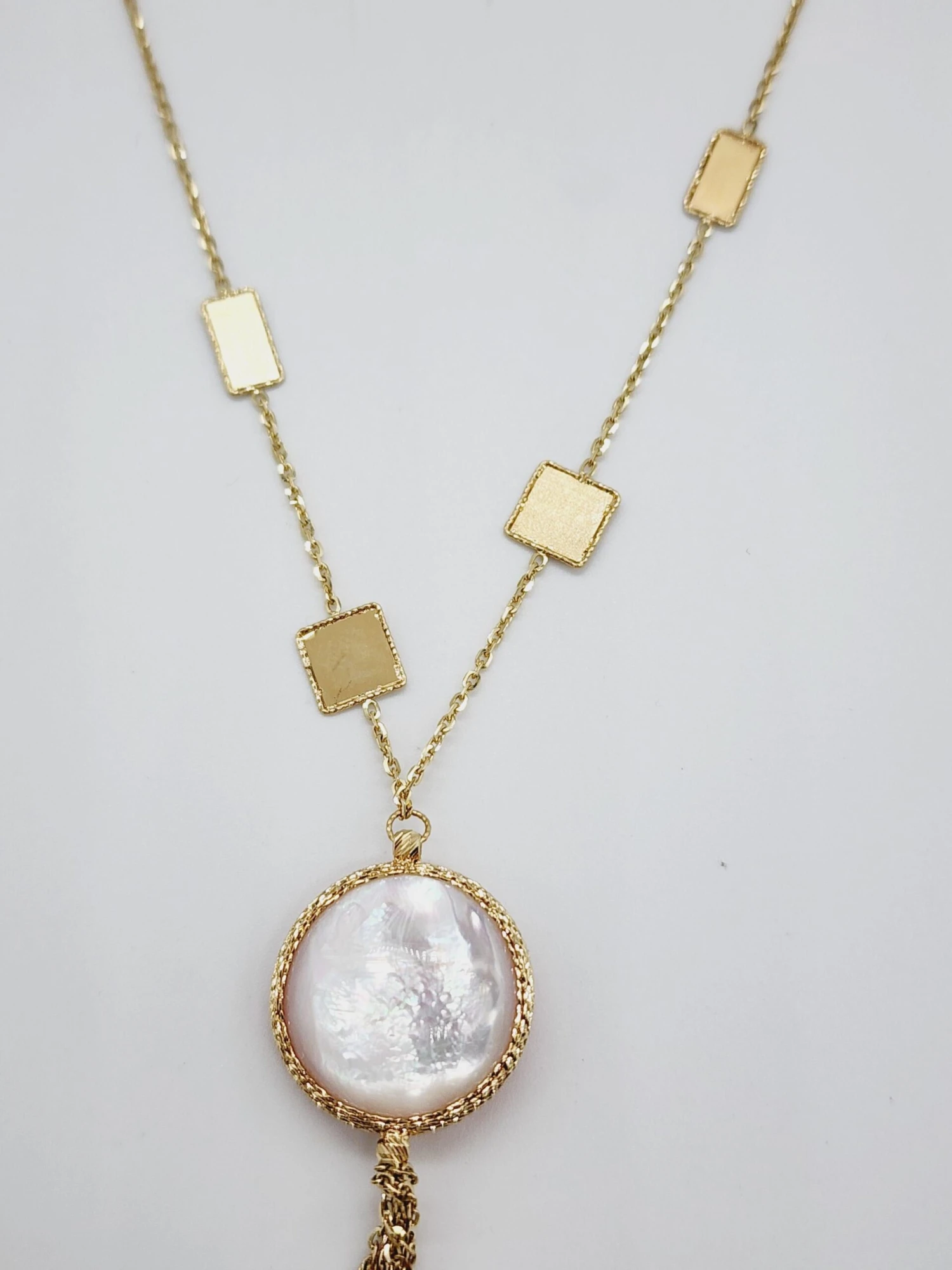 Mother of Pearl Yellow Gold Link Chain Necklace, Lobster closure. Length is 16 inches.