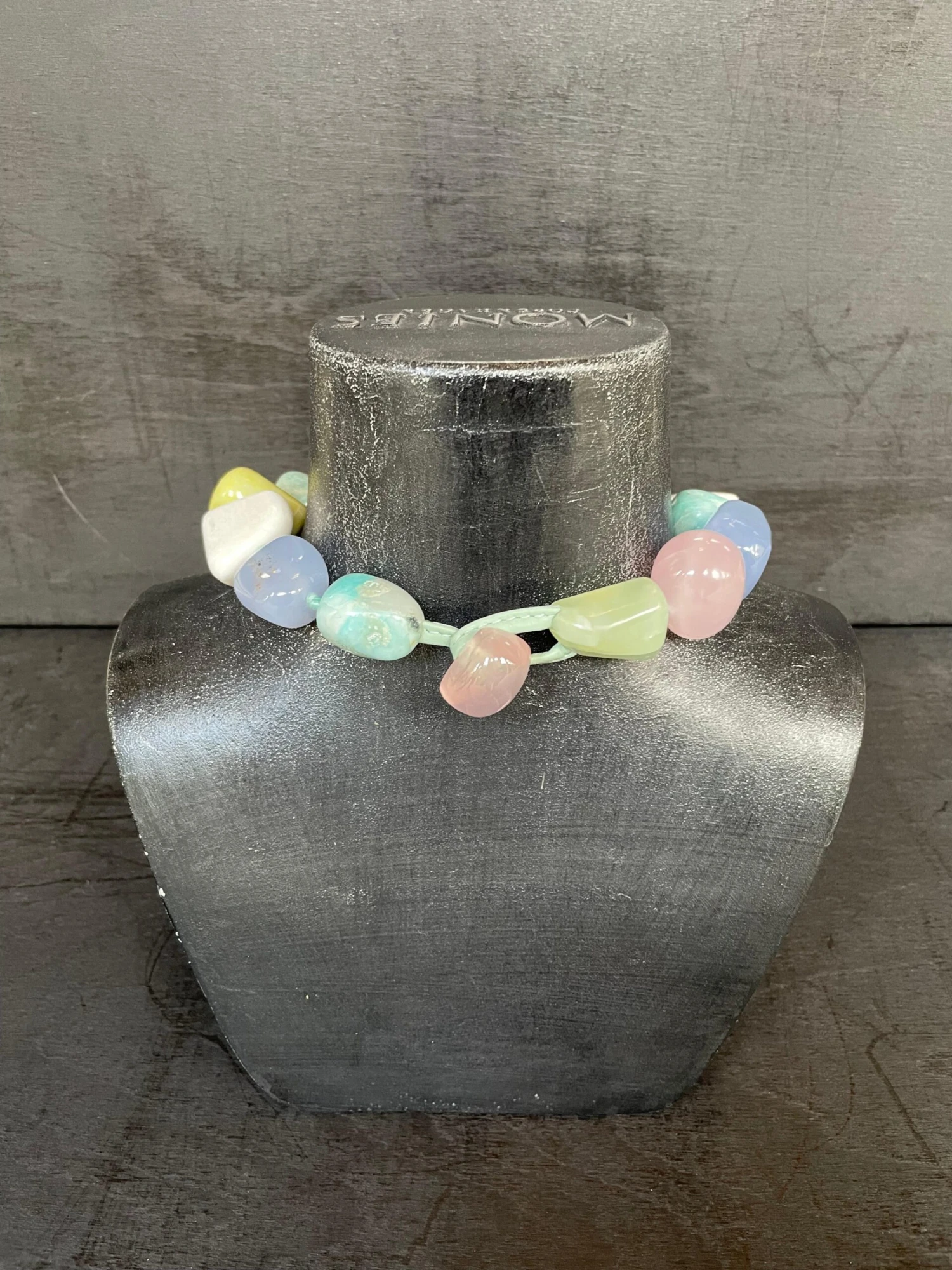 Made in Dolomite, Jade, Rose Quartz, Chalcedony, Amazonite and Prehnite with a leather clasp.