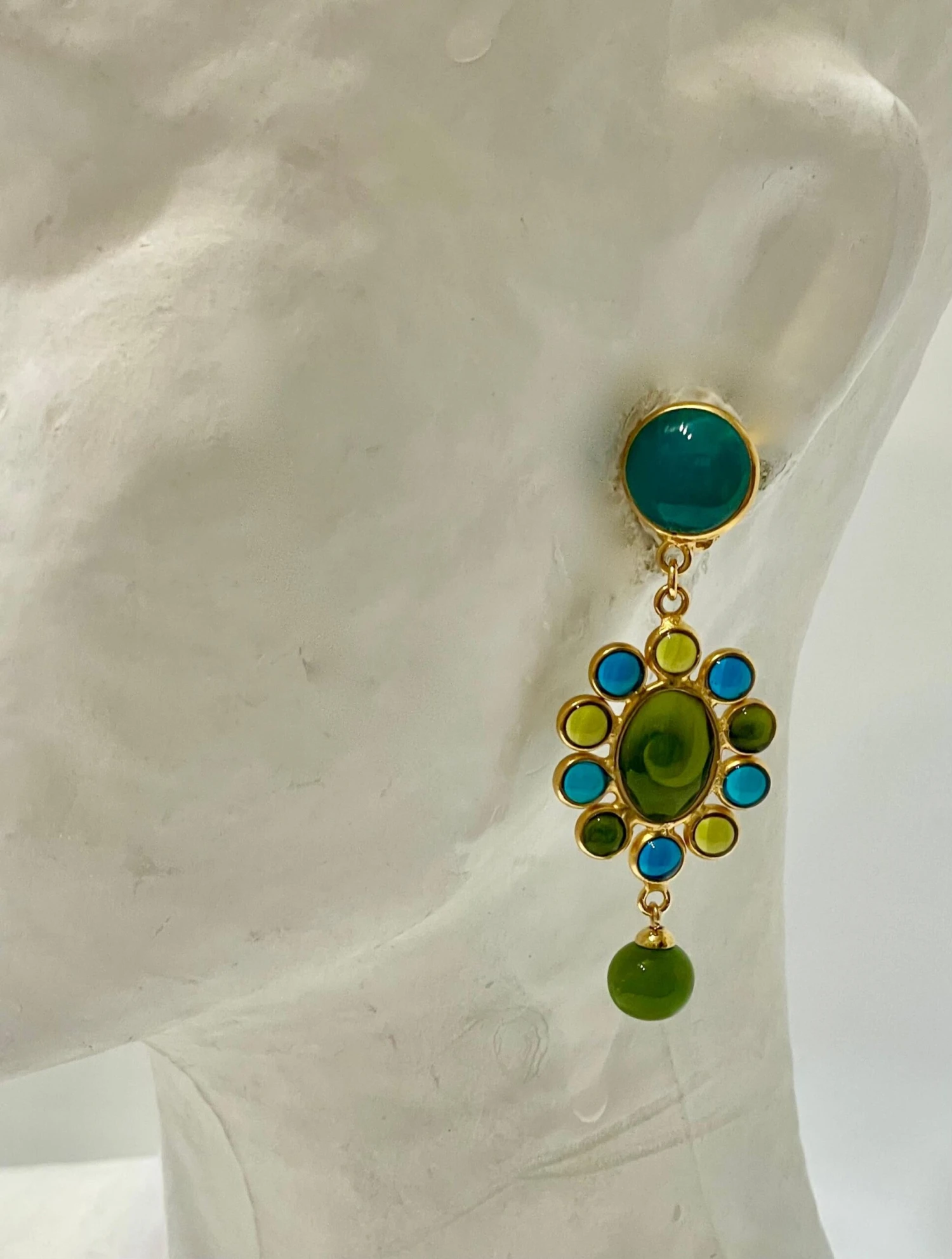The established business included a global clientele and boutique in Paris. After Montague took over, her most important clients were Nina Ricci and Franck & Fils. Early jewelry by Montague, according to Muller, “is recognizable in the abundant use of enamel and iridescent glass beads. » However, these pieces are unmarked and are often difficult to identify correctly. Montague continued to work the business through the 1950s and ’60s, earning accolades, including the Grand Prix des Creations de Bijouterie Fantaisie in 1961 and maintaining a loyal clientele.