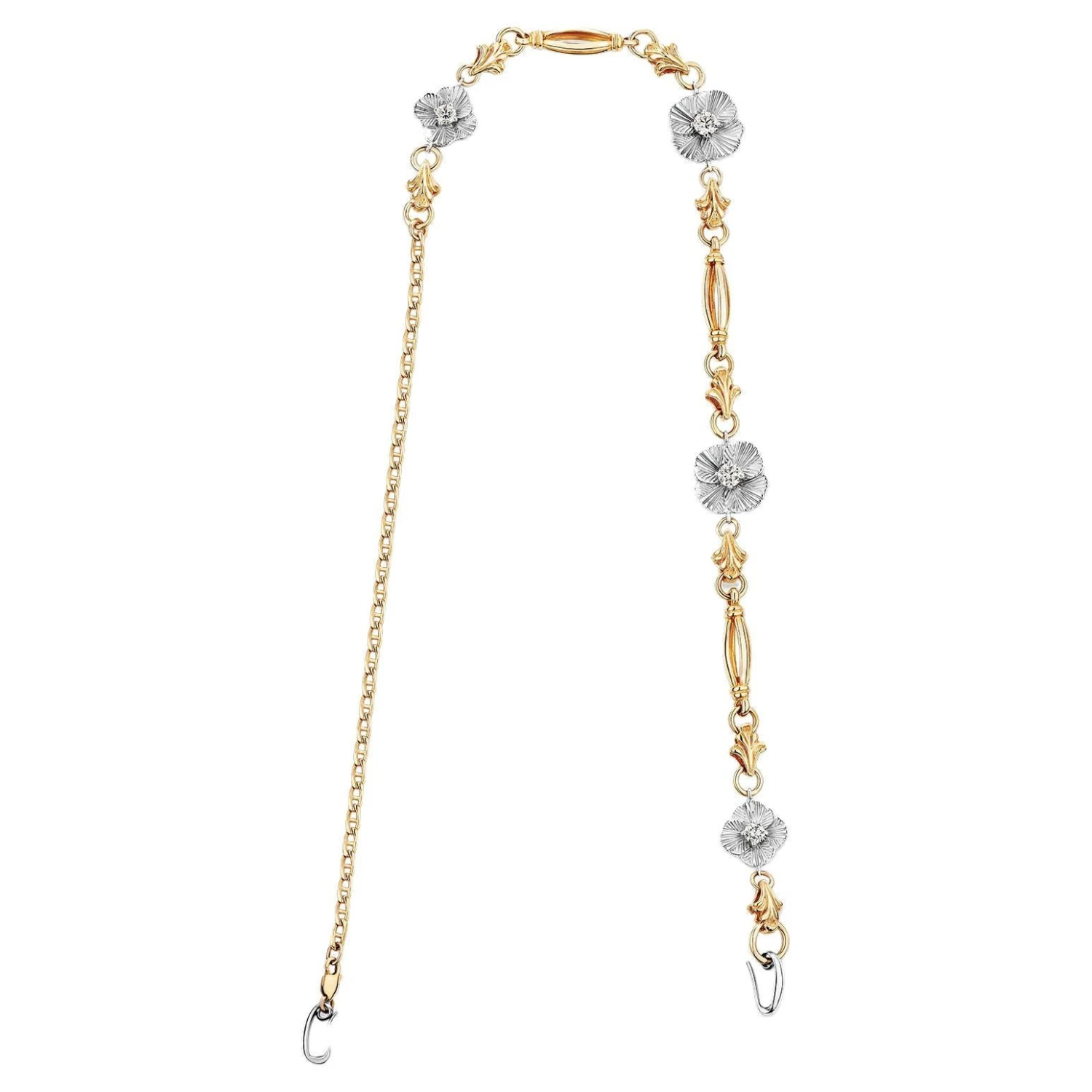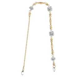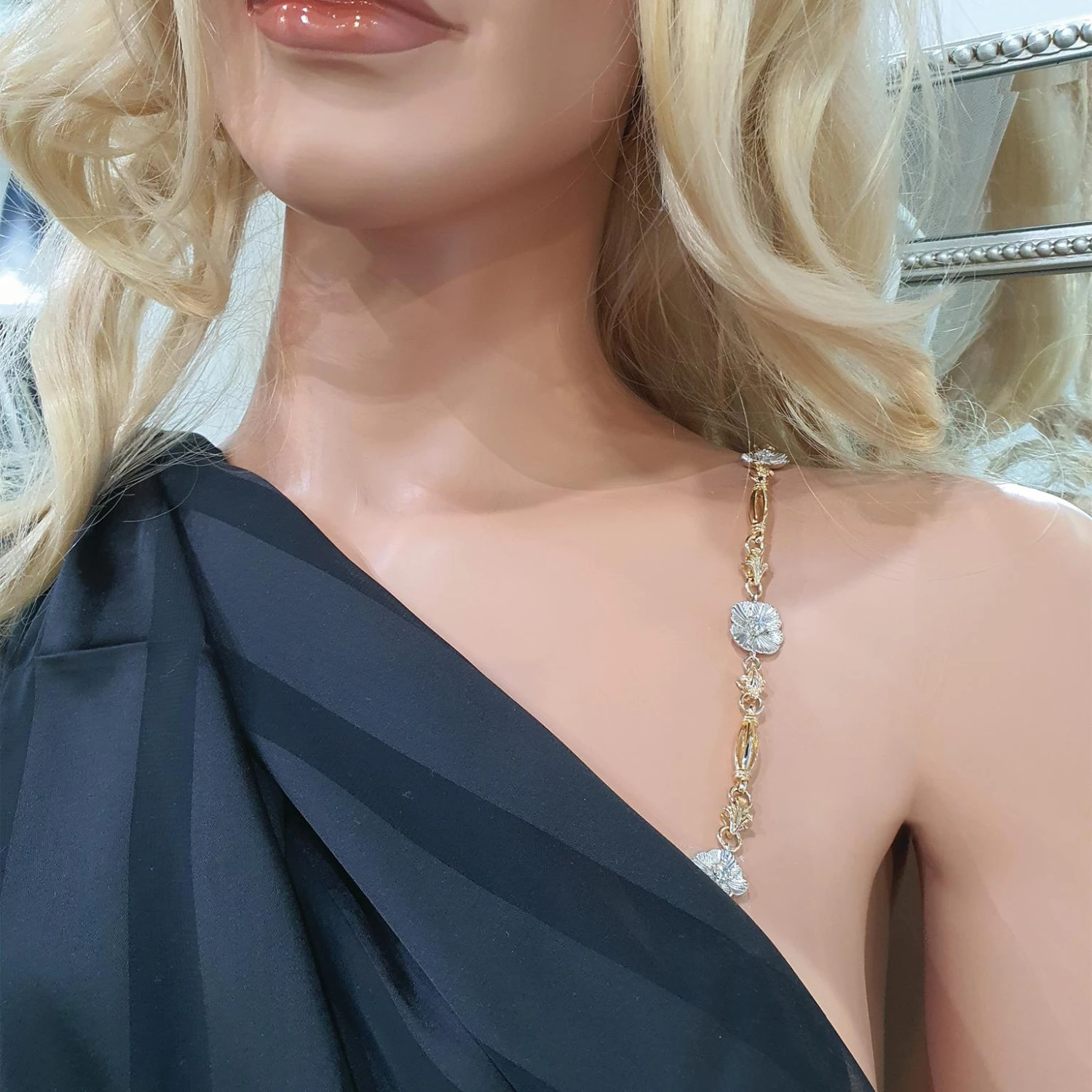 The rear section is finished with 9K anchor chain. The rear hook has a small gold “parrot” catch attached at the end which allows for length adjustment by simply moving the “parrot” catch up the anchor chain. The hook fittings on each end allow for easy attachment to a loop on the front and rear of a strapless dress or top.