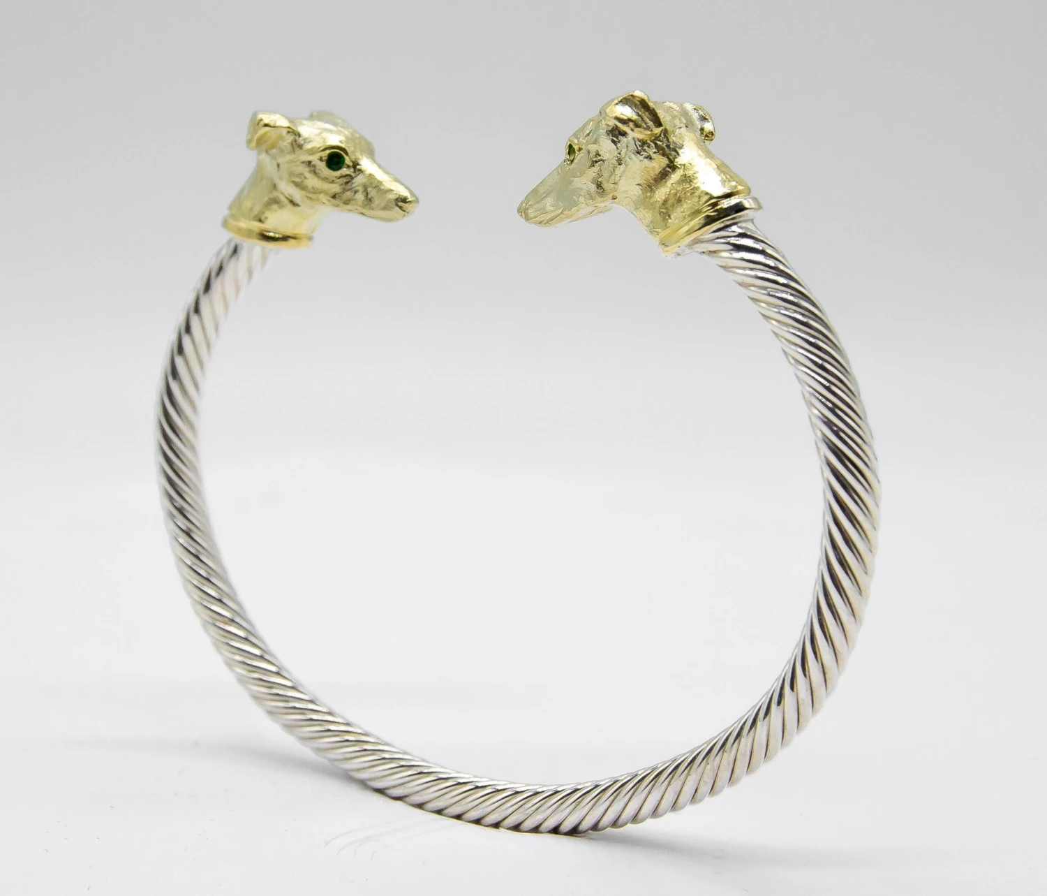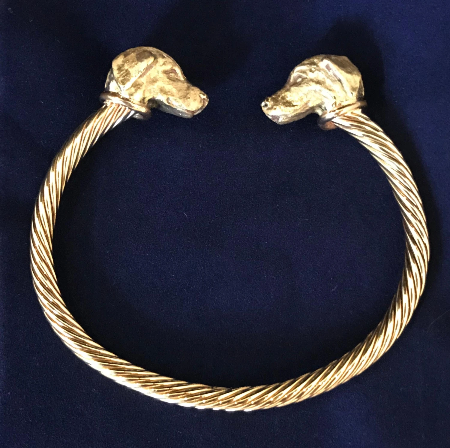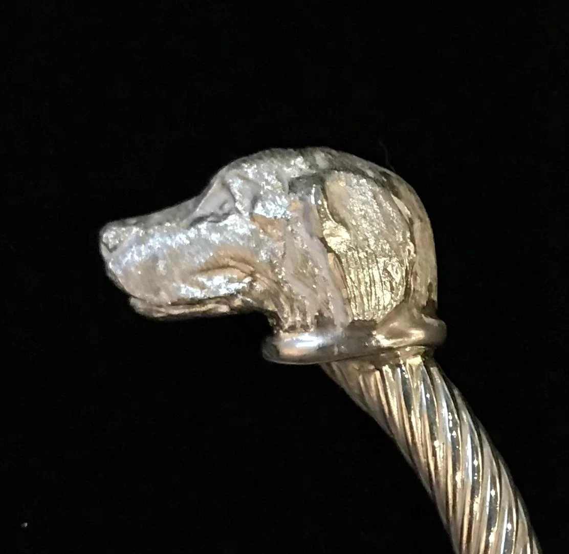 Intricately hand carved dog miniatures Labrador Retriever (details in photos) on a sterling silver twisted bangle are made by England’s Paul Eaton who is possibly the world’s best miniature sculptor of dogs and animals and a master gold/silversmith. Each bespoke dog bangle is made by hand. This Labrador Retriever bangle will easily tighten by squeezing together so that it rests securely and comfortably on the wrist. Because of the easy adjustments with the flexible bangle, the Labrador Retriever bangle fits a large wrist perfectly. Constant wearing of the sterling silver bangle usually means that no cleaning is necessary, although an occasional touch up with silver polish will make it shine. Paul Eaton’s animal jewelry can be customized with any breed or animal in Sterling Silver, 9ct, 18ct, or any combination of metal. Paul Eaton’s unique animal jewelry can also be adorned with stones. A few customization ideas are featured with the detailed photographs. Please inquire about any breeds of interest: we have many breeds in our inventory, previously carved sculptures, which are plentiful, will require 2 months to produce however new breeds may have a longer lead time, possibly up to a month longer. Paul Eaton (V.P. of the Royal Miniature Society and a member of the Miniature Artists of America) has exhibited at important Miniature Exhibitions around the world for decades obtaining many honorable rewards.