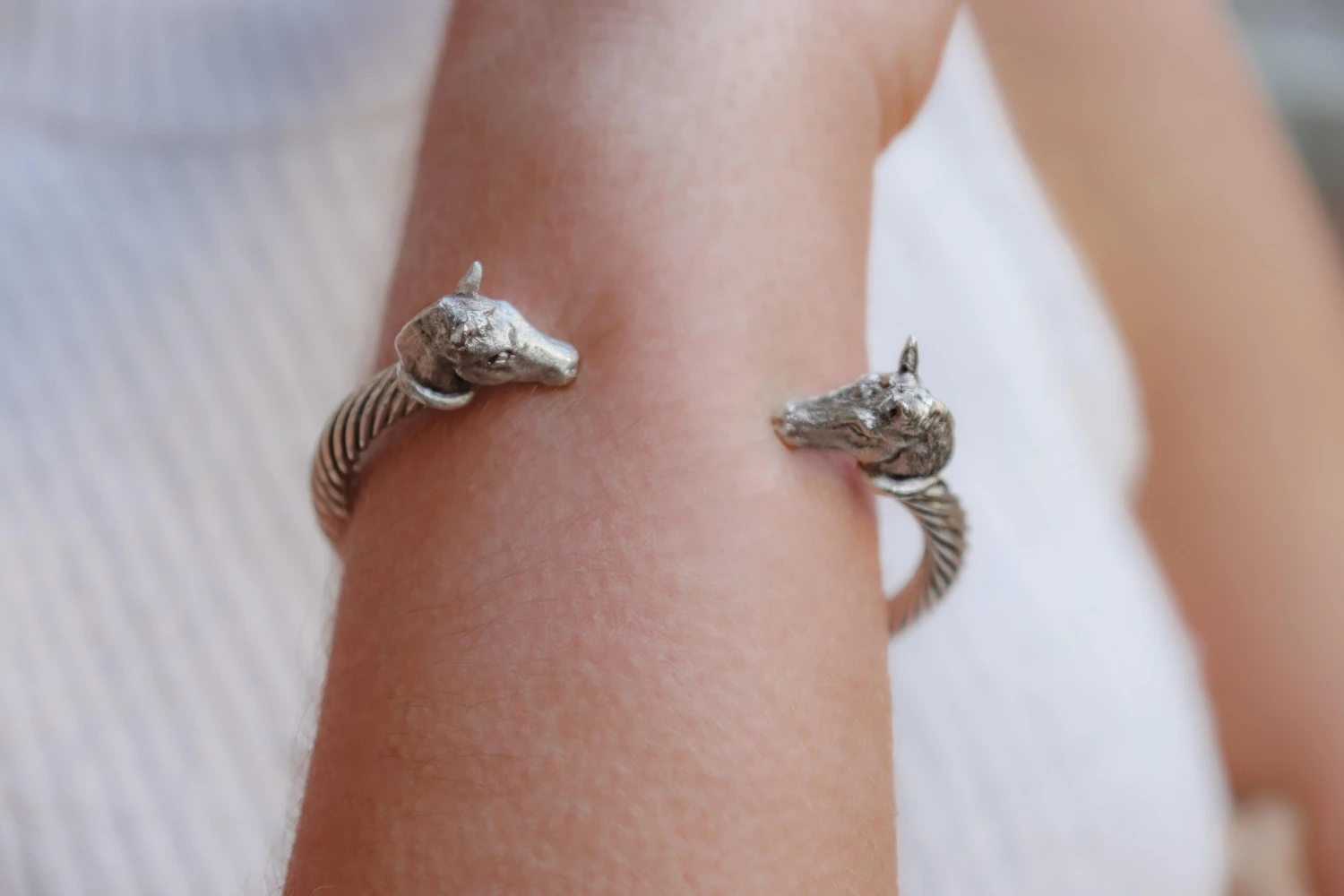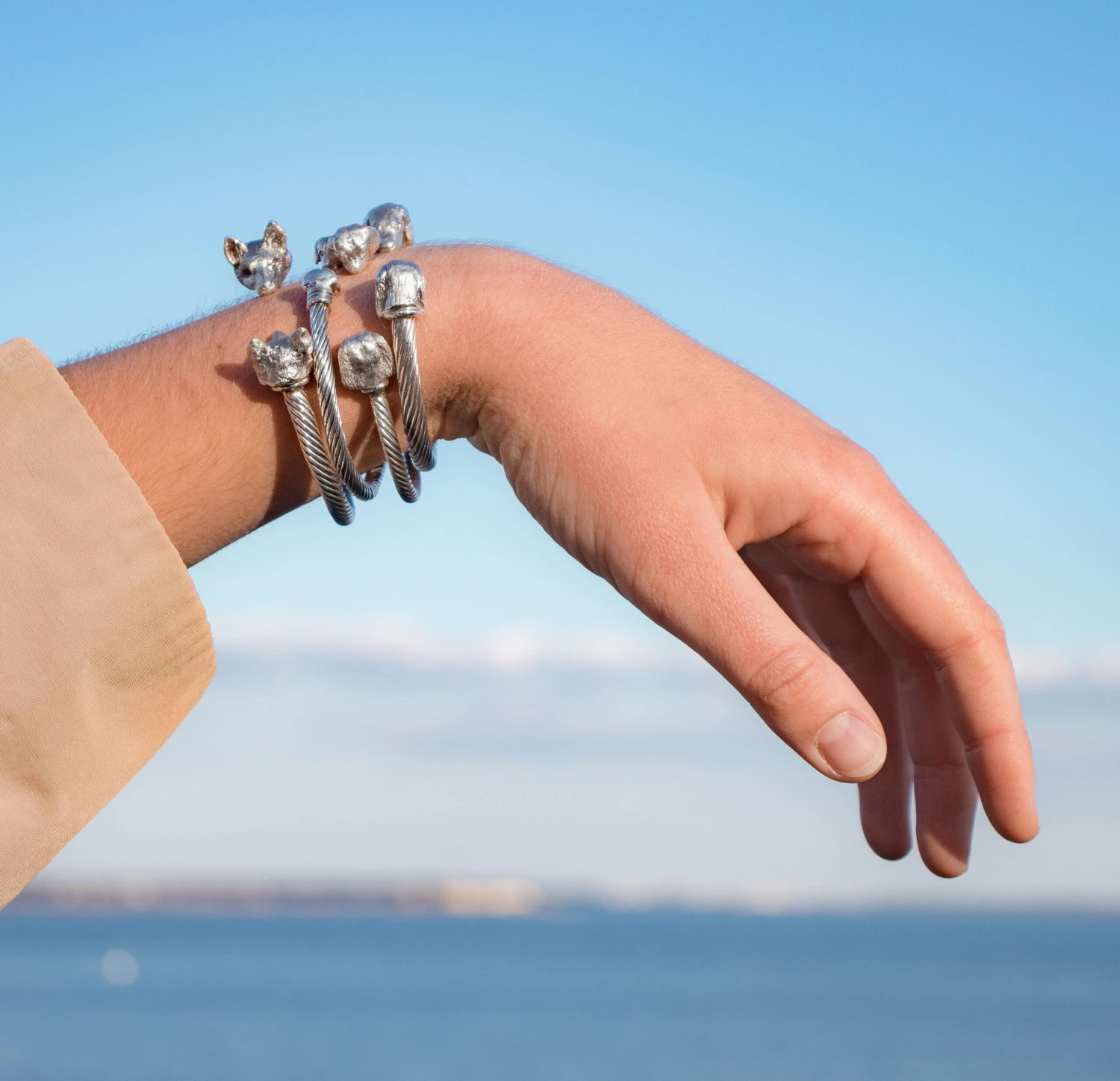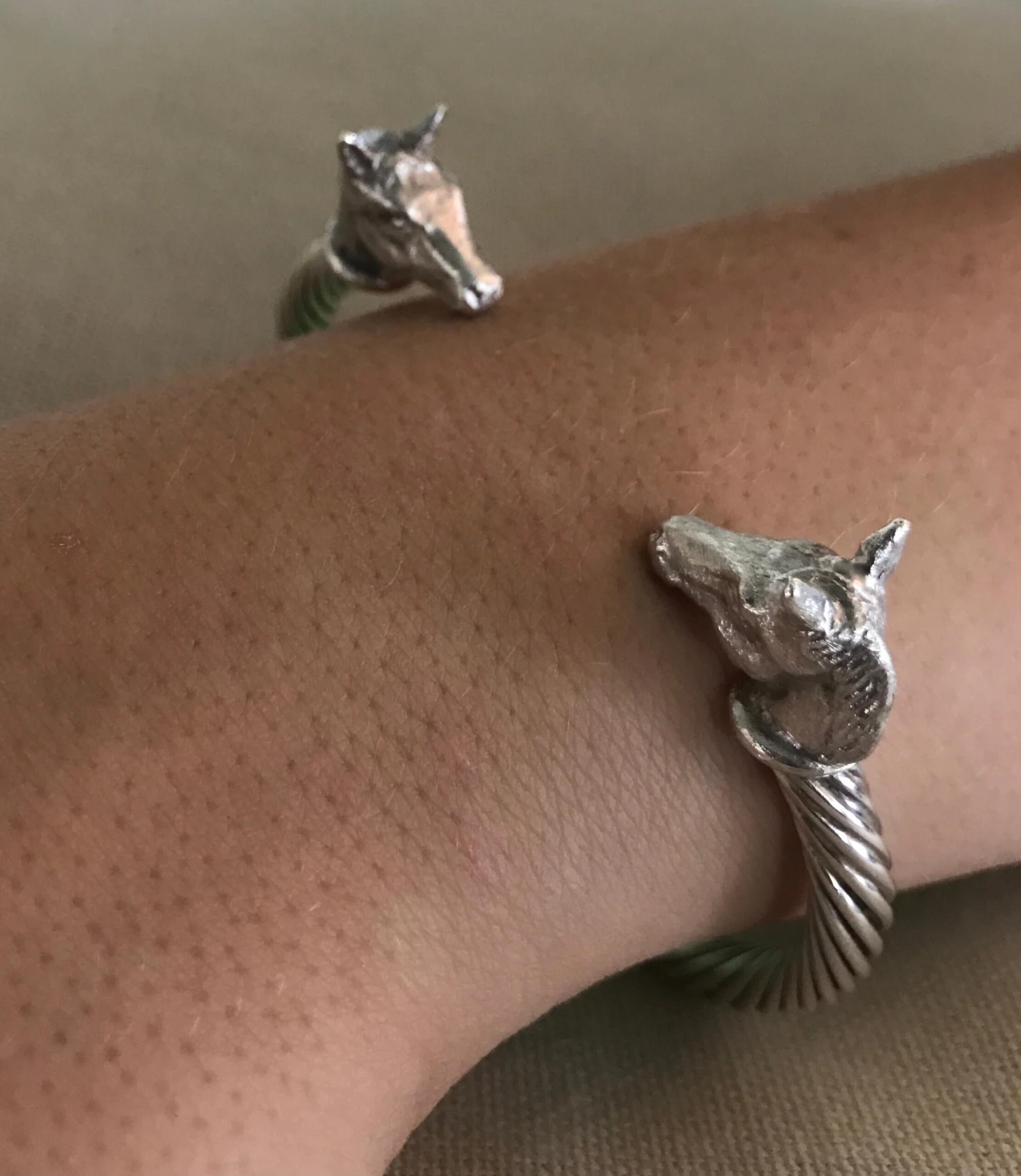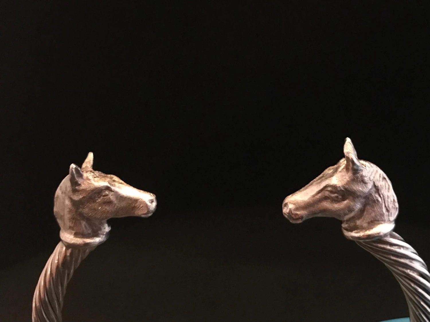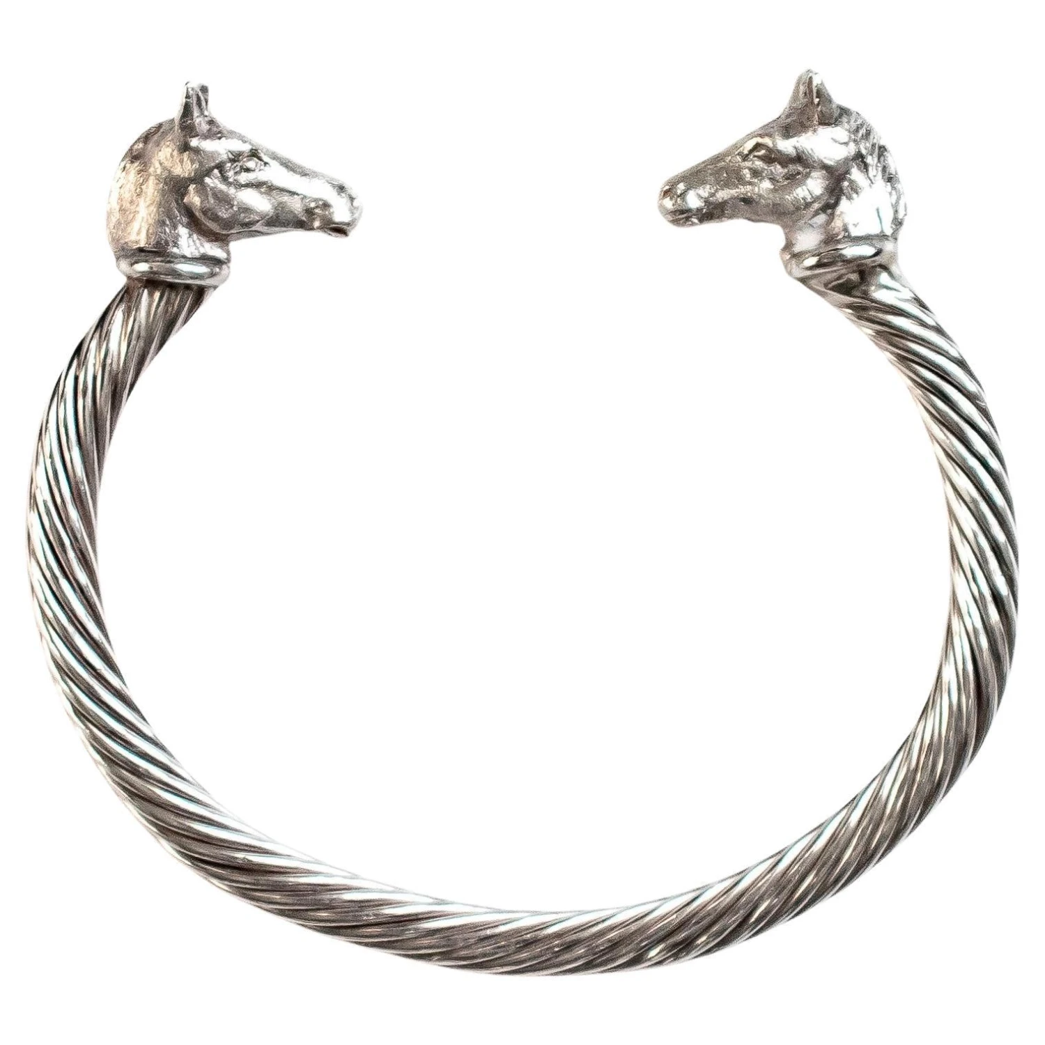 Intricately hand carved miniatures of Pony Heads (details in photos) on a sterling silver twisted bangle are made by England’s Paul Eaton who is possibly the world’s best miniature sculptor of dogs and animals and a master gold/silversmith. Each bespoke dog bangle is made by hand. This Pony bangle will easily tighten by squeezing together so that it rests securely and comfortably on the wrist. Because of the easy adjustments with the flexible bangle, the Pony bangle fits a medium to large wrist perfectly. Constant wearing of the sterling silver bangle usually means that no cleaning is necessary, although an occasional touch up with silver polish will make it shine. Paul Eaton’s animal jewelry can be customized with any breed or animal in Sterling Silver, 9ct, 18ct or any combination of metal. Paul Eaton’s unique animal jewelry can also be adorned with stones. A few customization ideas are featured with the detailed photographs. Please inquire about any breeds of interest: we have many breeds in our inventory, previously carved sculptures, which are plentiful, will require 2 months to produce however new breeds may have a longer lead time, possibly up to a month longer. Paul Eaton (V.P. of the Royal Miniature Society and a member of the Miniature Artists of America) has exhibited at important Miniature Exhibitions around the world for decades obtaining many honorable rewards.