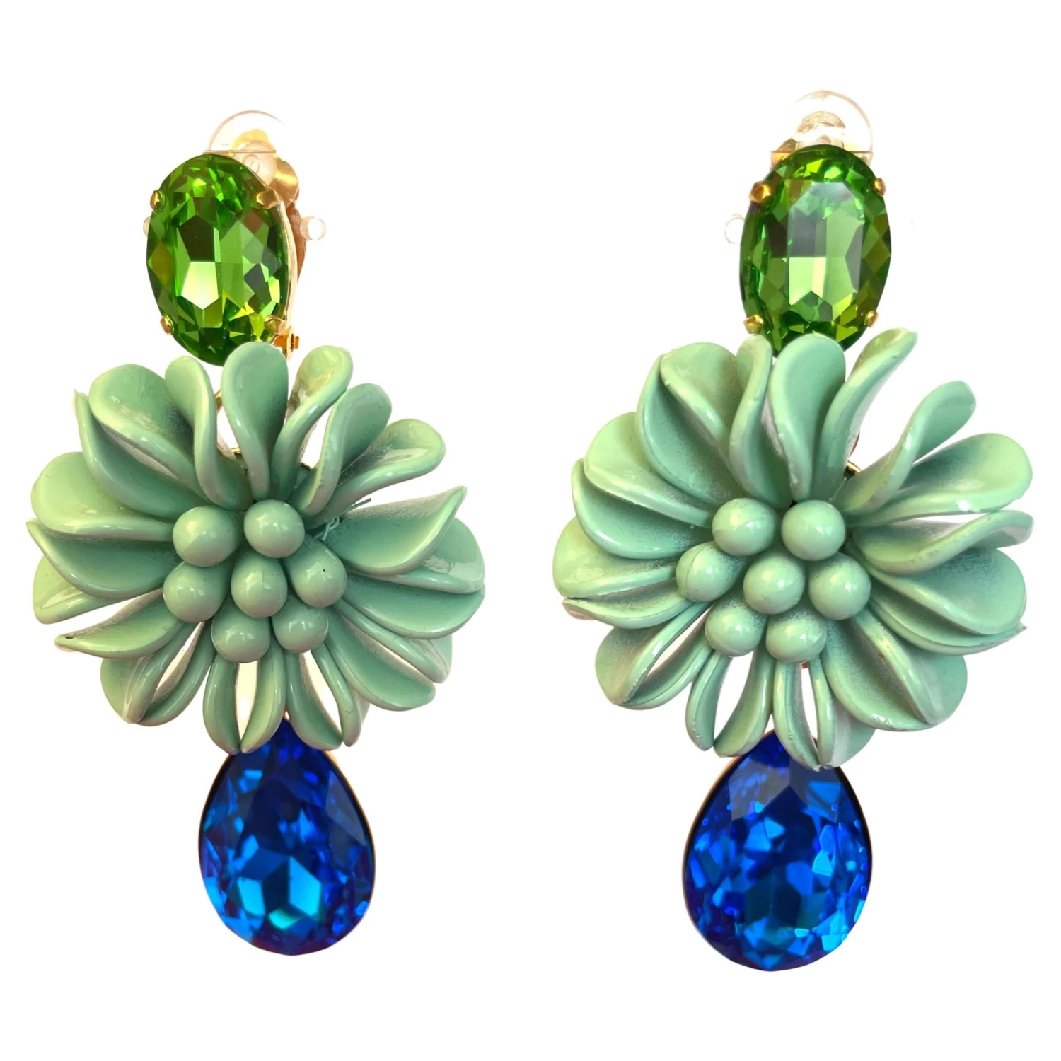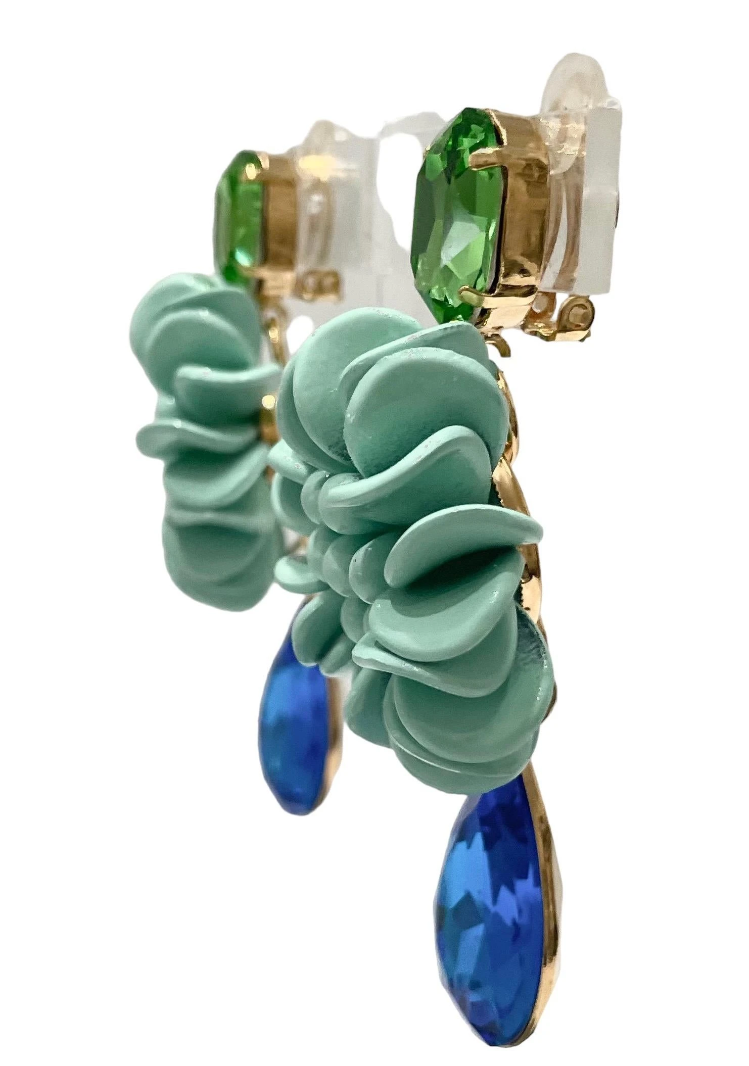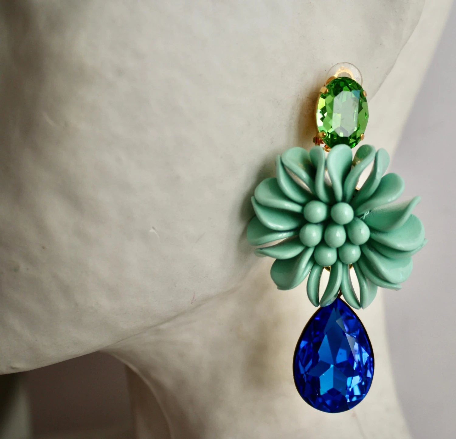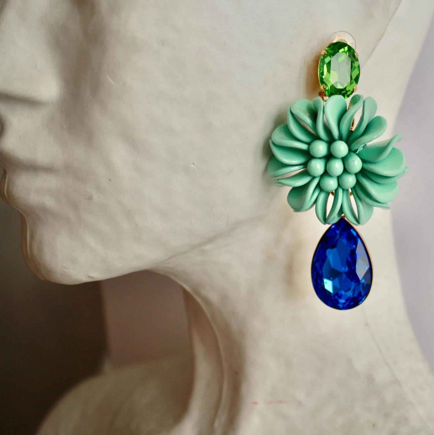 Statement earrings with Swarovski crystals and molded resin flower in aqua.
