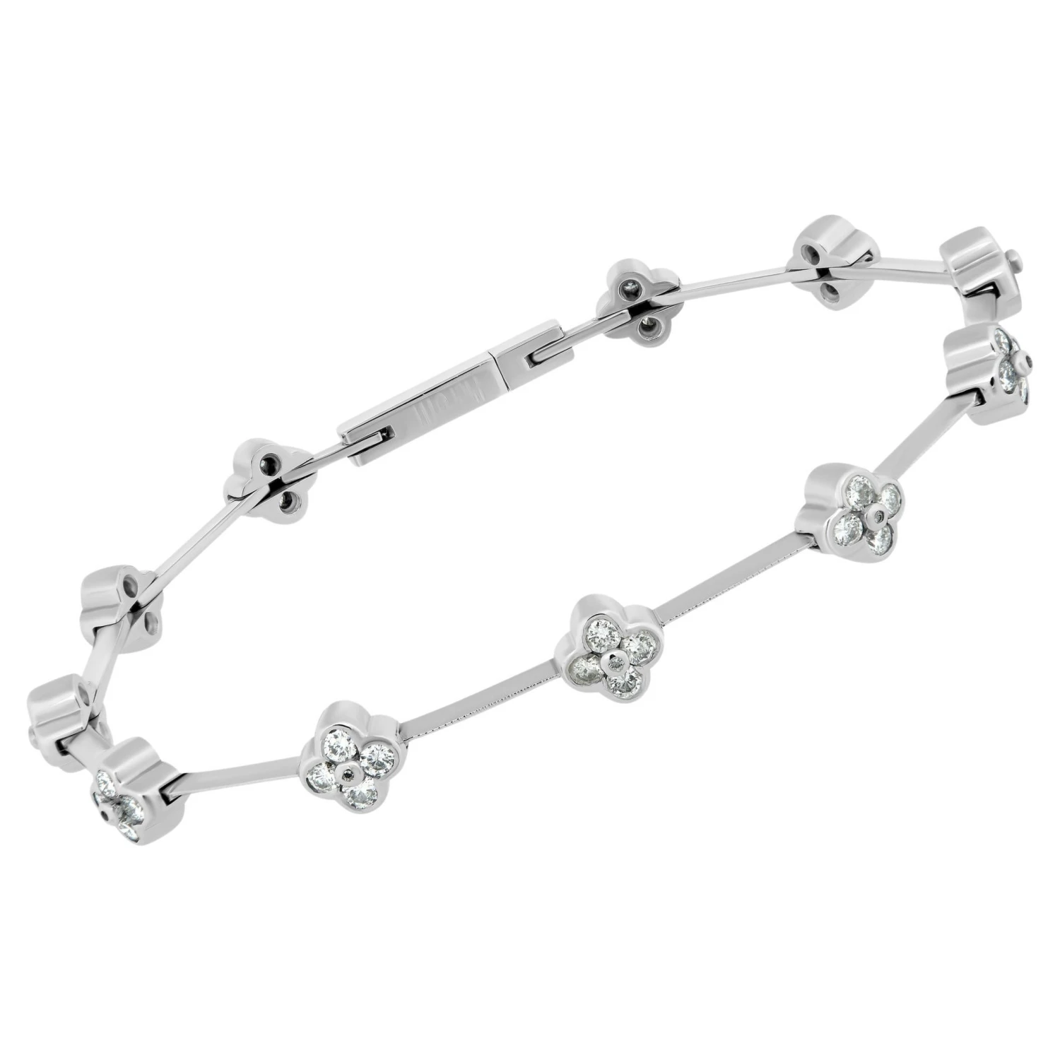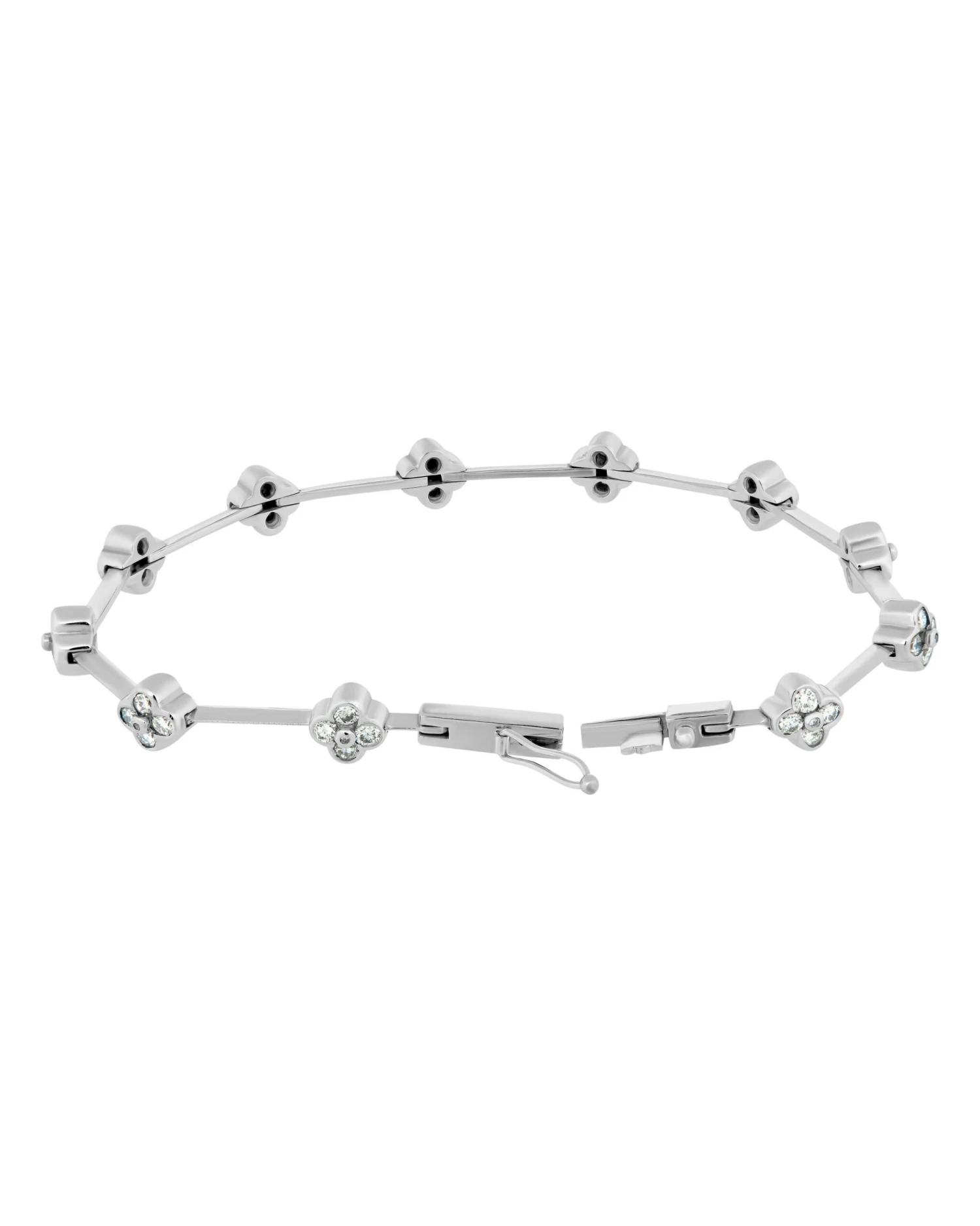 This timeless Piero Milano 18K White Gold Tennis Bracelet features radiant diamond flowers set in smooth 18K White Gold and adorned with a bezel set center 1.65ct. tw.. The Decoration Size is 6.35mm. The Length is 7.25 inches. The Weight is 12.7g. Diamond Color: G-H. Diamond Clarity: VS/SI.