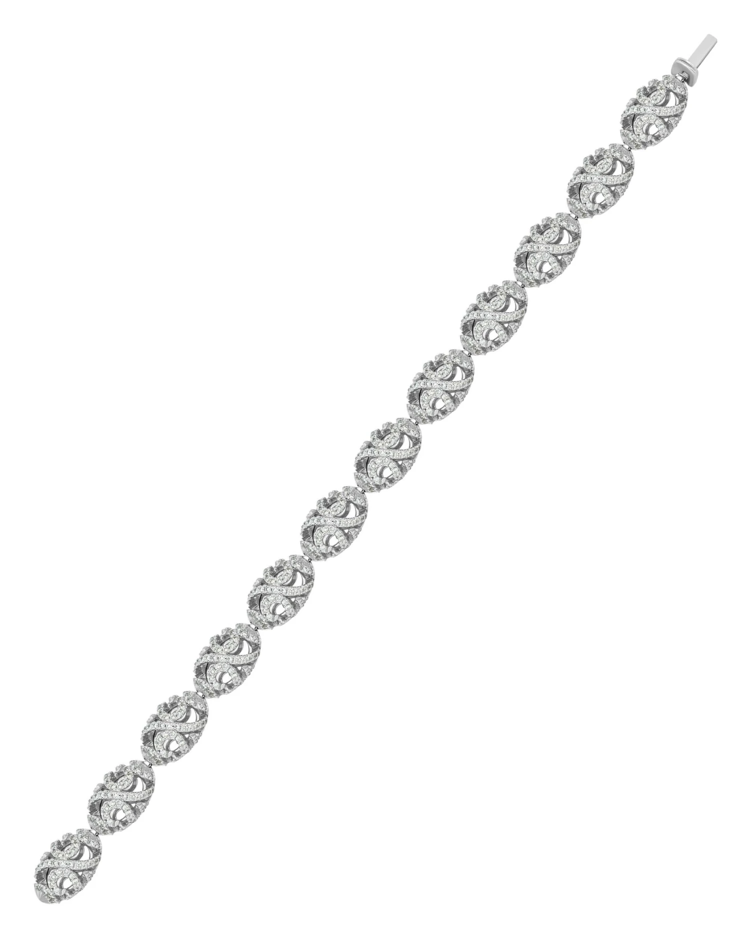 This elegant Piero Milano 18K White Gold Tennis Bracelet features shimmering diamond swirls 3.98ct. tw. enhancing carved links of 18K White Gold. The Thickness is 9.4mm. The Length is 7.25 inches. The Weight is 26.9g. Diamond Color: G-H. Diamond Clarity: VS/SI.