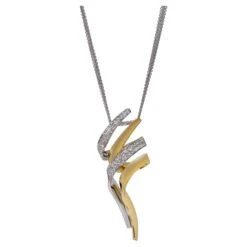 This eye-catching Piero Milano 18K Yellow Gold and 18k White Gold Pendant Necklace features a two tone design showcasing a White Gold swirl set with glistening diamonds 0.62ct. tw. gracefully intertwined with a smooth swirl of Yellow Gold. The Decoration Size is 19mm x 50.8mm. The Length is 16 inches. The Weight is 16.3g. Diamond Color: G-H. Diamond Clarity: VS/SI.