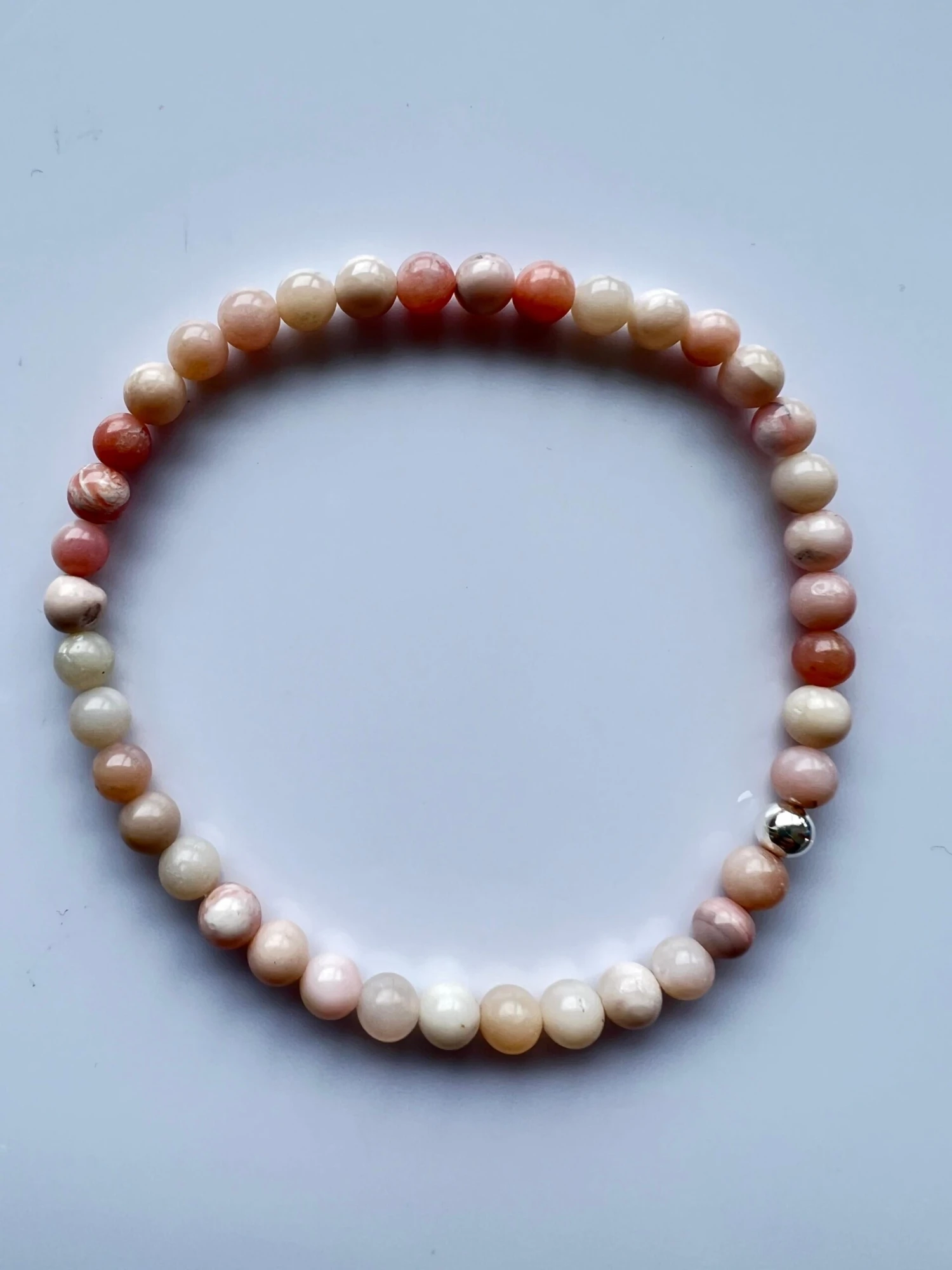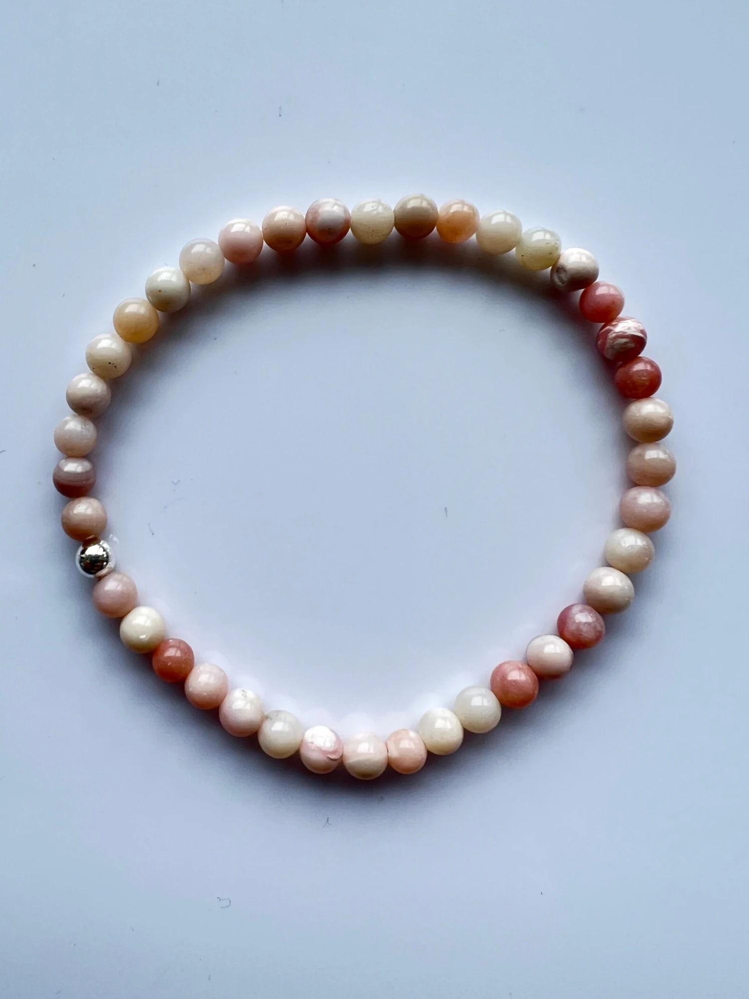 This bracelet, comfortably measuring 6.5 inches, is adorned with carefully selected pink opal beads. Often referred to as the « stone of renewal », pink opal has been cherished throughout history for its striking beauty and legendary powers to calm and revitalize the heart and emotions. It carries a soothing energy that helps alleviate fears, bolster hope, and uplift spirits. Its soft pink hue symbolizes love, compassion, and emotional healing, aligning perfectly with the energy of the Heart Chakra, promoting emotional balance, self-love, and forgiveness.