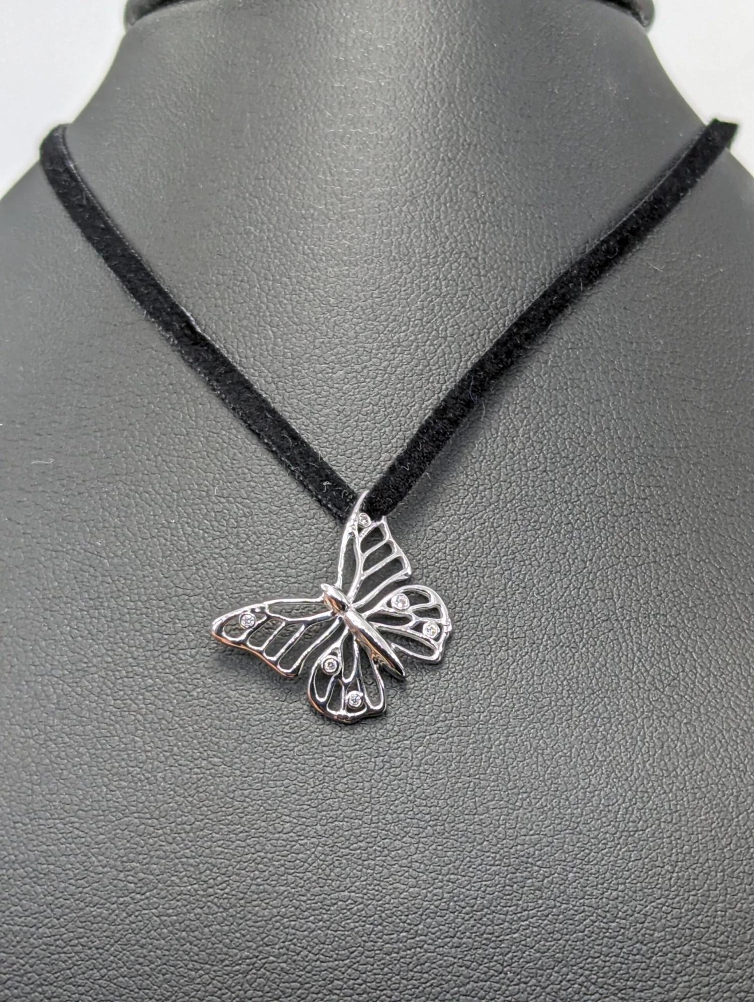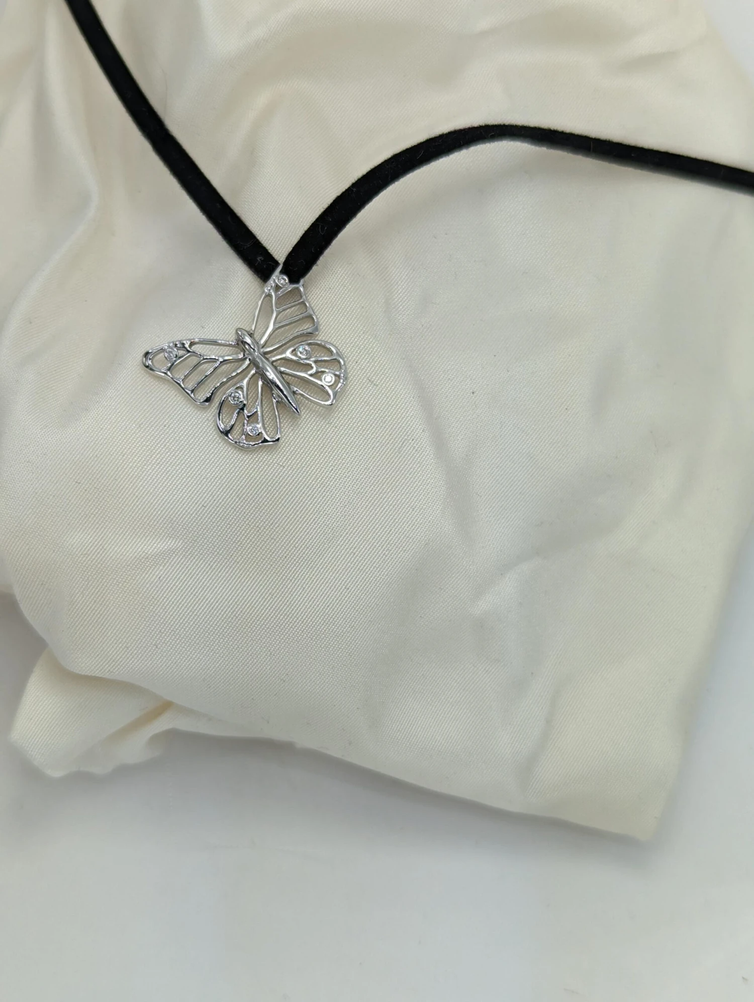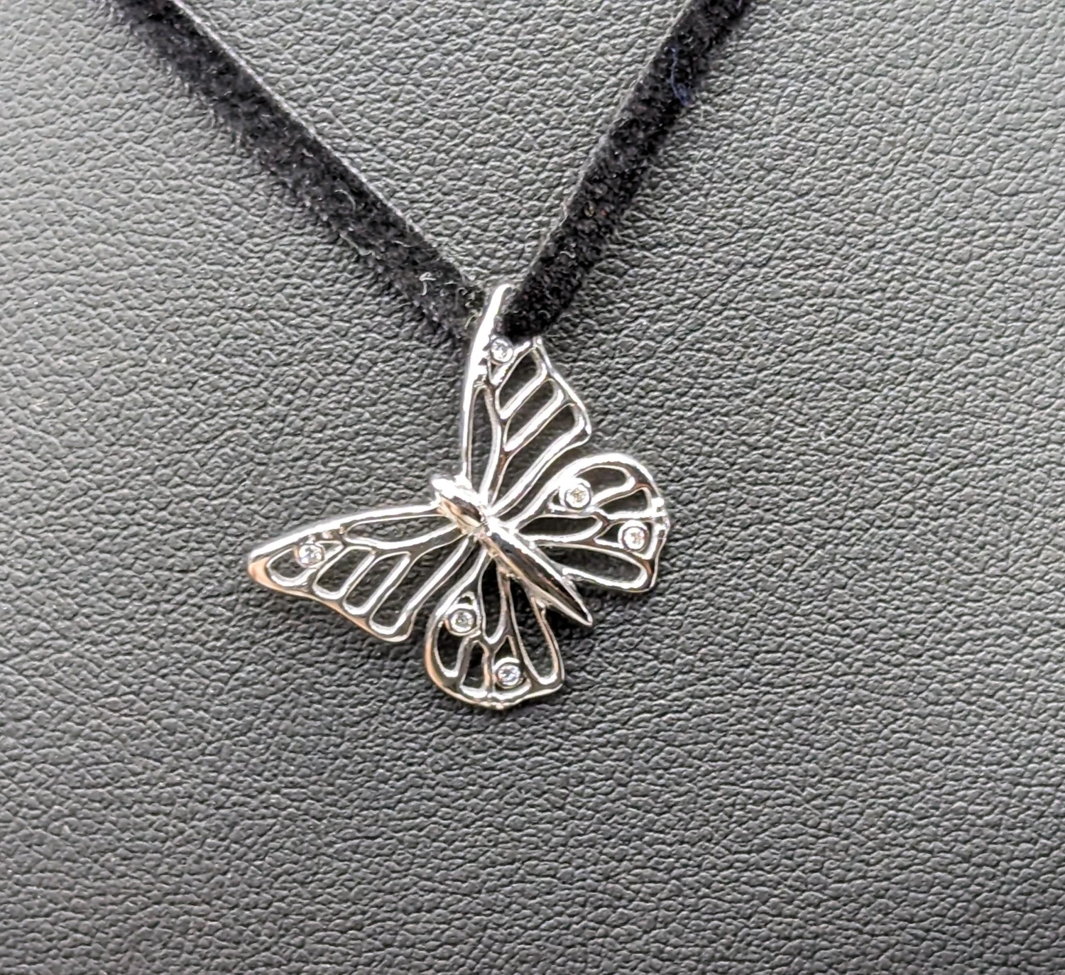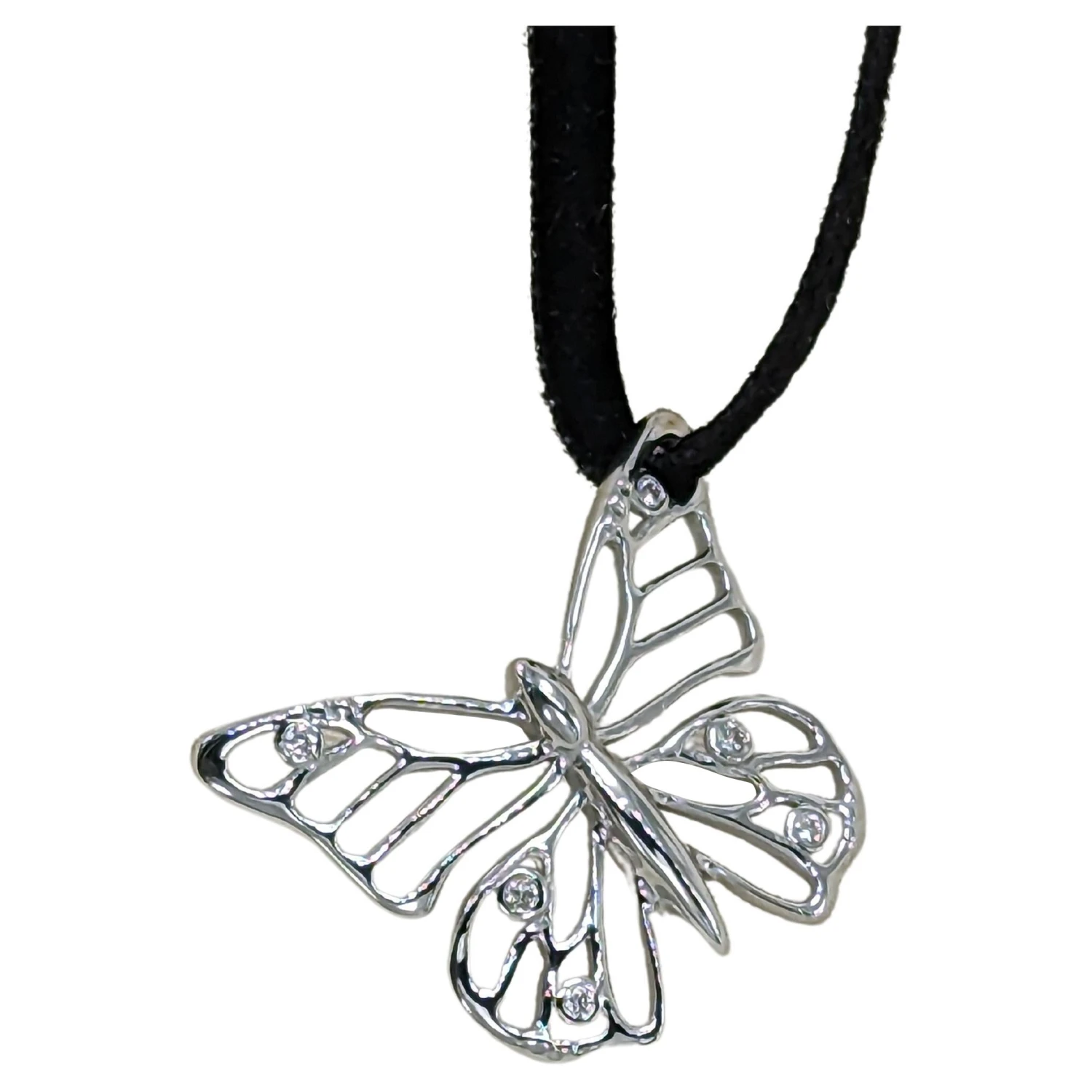 Platinum Petite Monarch Butterfly and GIA Diamonds Pendant Necklace, Tiffany Designer, Thomas Kurilla sculpted this butterfly pendant for the new Fall season. Butterflies have always captured the imagination of designers with their amazing patterns and abstract geometry. This has 6 GIA diamonds with .046 carat weight. It is 3/4 inch plus wide , or 20 mm. On a 32 inch long, 1/8 inch ultra suede flat cord. Bring the nature to the Urban cities in this delicately pierced butterfly. Made to order in NYC, please allow 4-5 weeks.