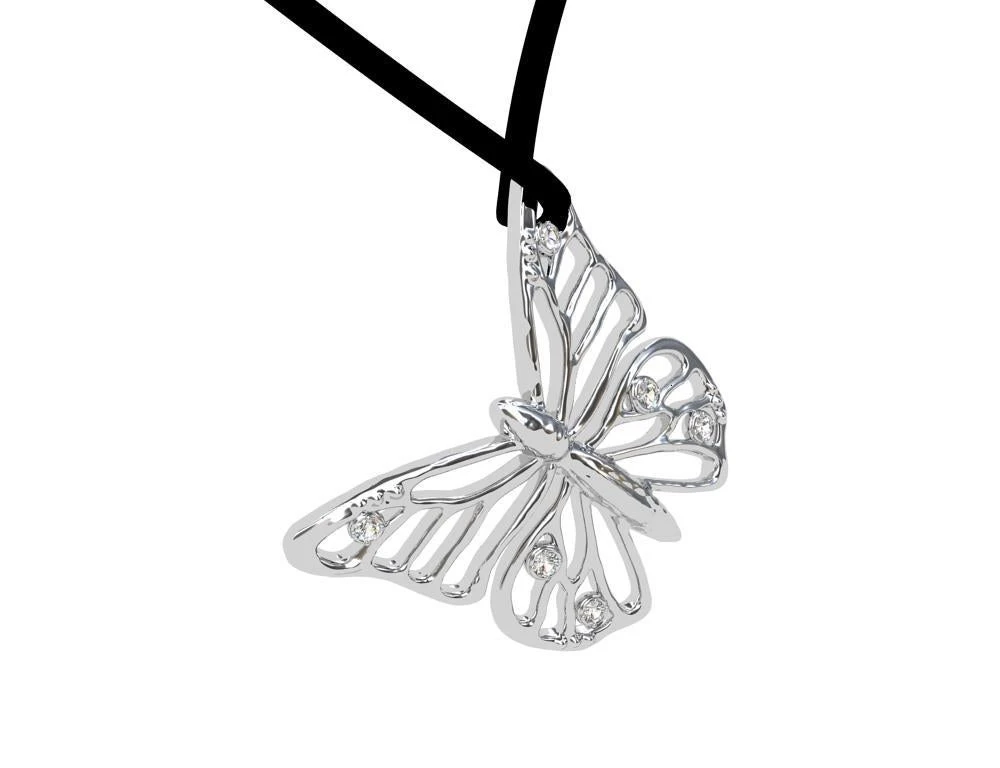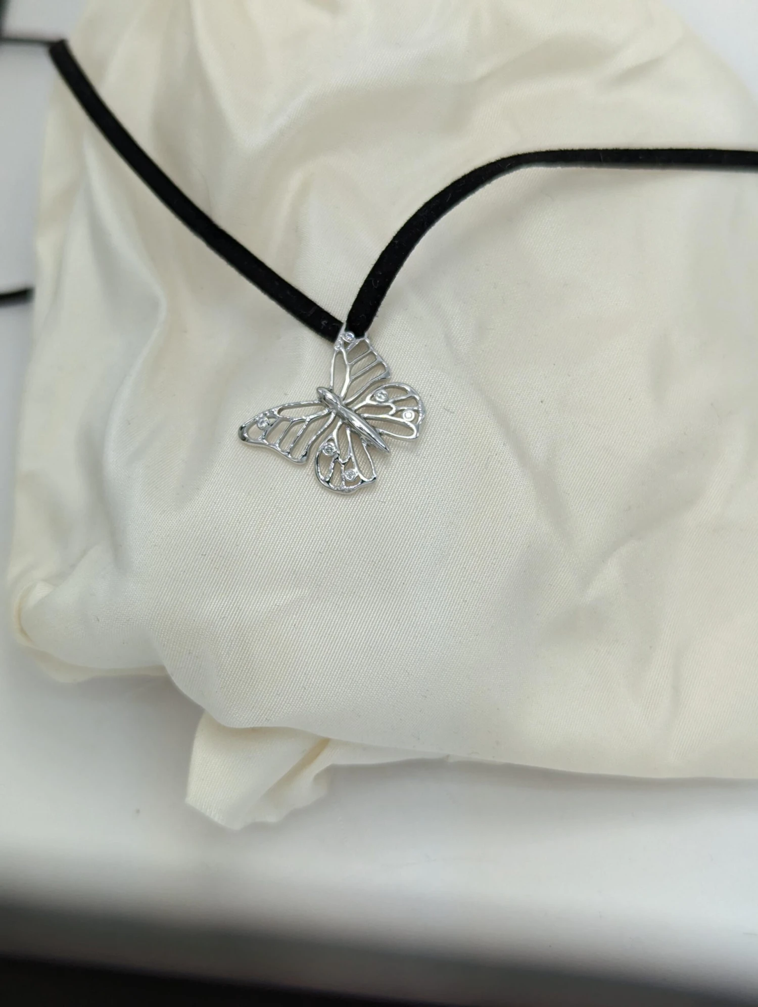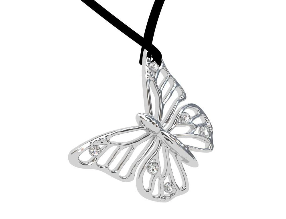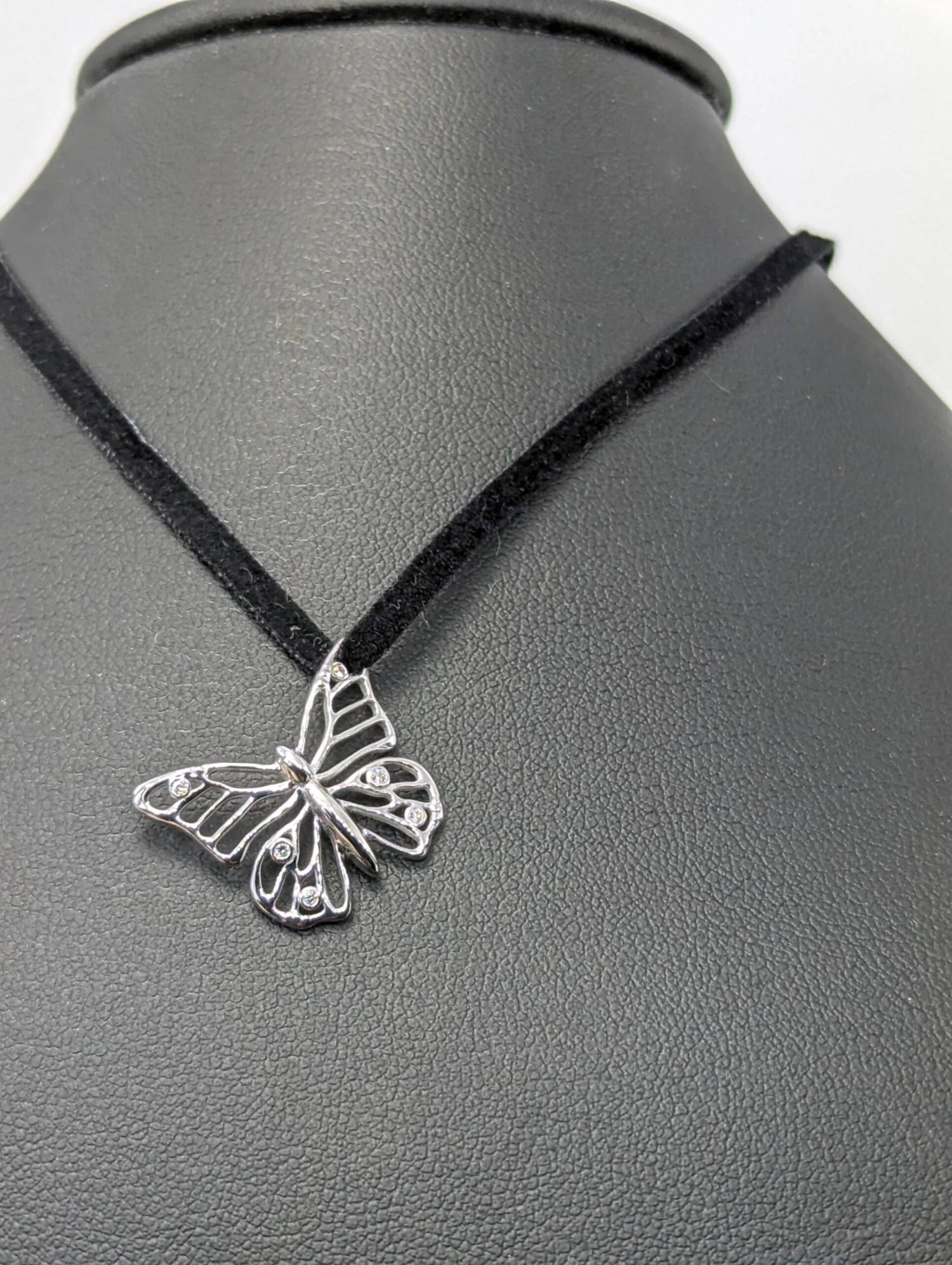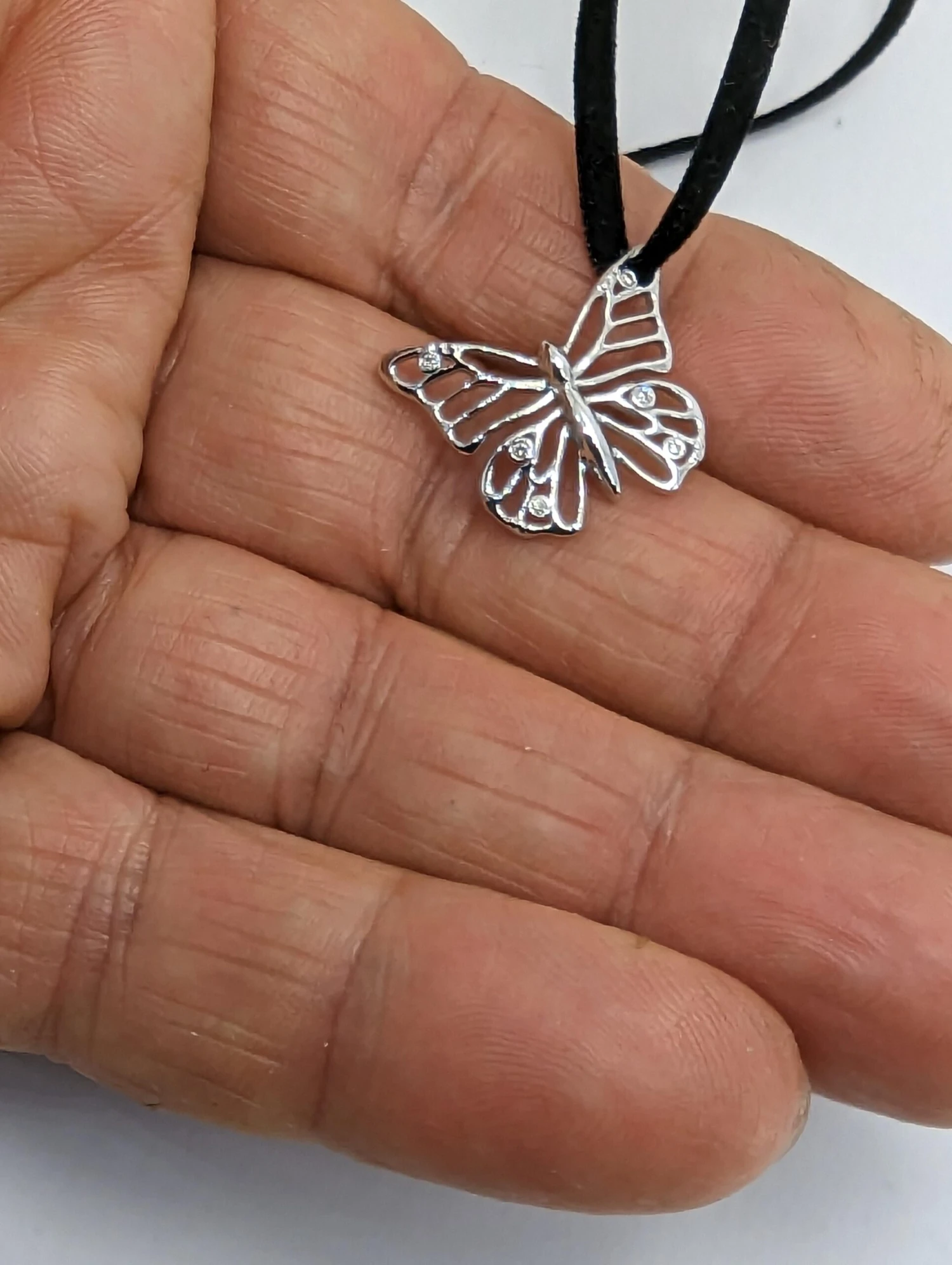 Platinum Petite Monarch Butterfly and GIA Diamonds Pendant Necklace, Tiffany Designer, Thomas Kurilla sculpted this butterfly pendant for the new Fall season. Butterflies have always captured the imagination of designers with their amazing patterns and abstract geometry. This has 6 GIA diamonds with .046 carat weight. It is 3/4 inch plus wide , or 20 mm. On a 32 inch long, 1/8 inch ultra suede flat cord. Bring the nature to the Urban cities in this delicately pierced butterfly. Made to order in NYC, please allow 4-5 weeks.