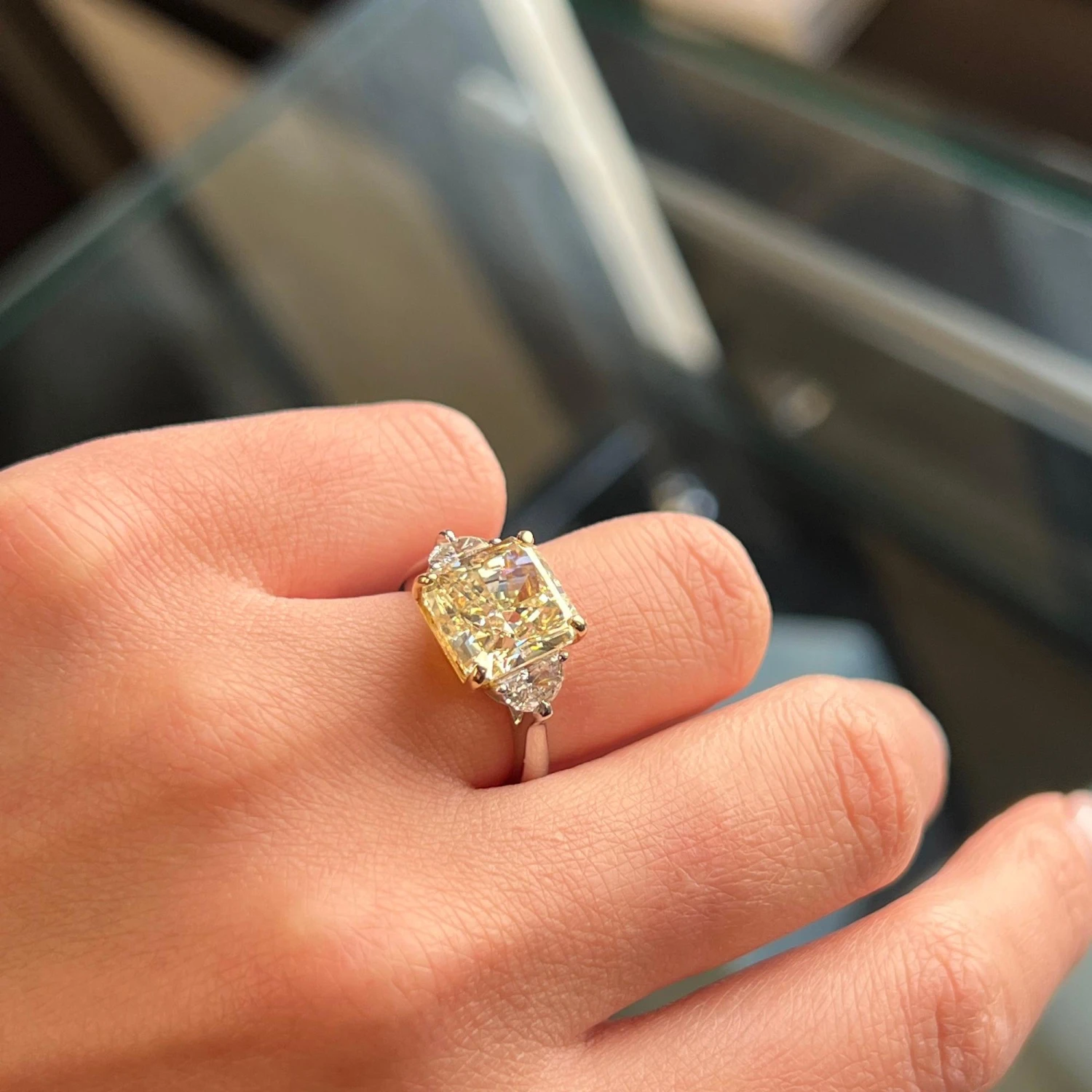 With a strong and stunning array of femininity and vibrant hues, this rare handmade three stone, fancy light yellow diamond ring is a remarkable addition to your jewelry collection. Crafted in platinum and the center stone shank in 18K yellow gold. This showstopper engagement ring is flanked by a center prong set light yellow diamond weighing 5.36 carats with 2 prong set half moon cut white diamonds weighing 0.54 carat. Total diamond weight: 5.90 carats. Light yellow diamond clarity: VS and XYZ color. White diamond quality: G color and VVS-VS clarity. Ring size: 5.5. Ring width: 3.2mm. Total weight: 8.80 grams. Comes with a presentable gift box and appraisal.