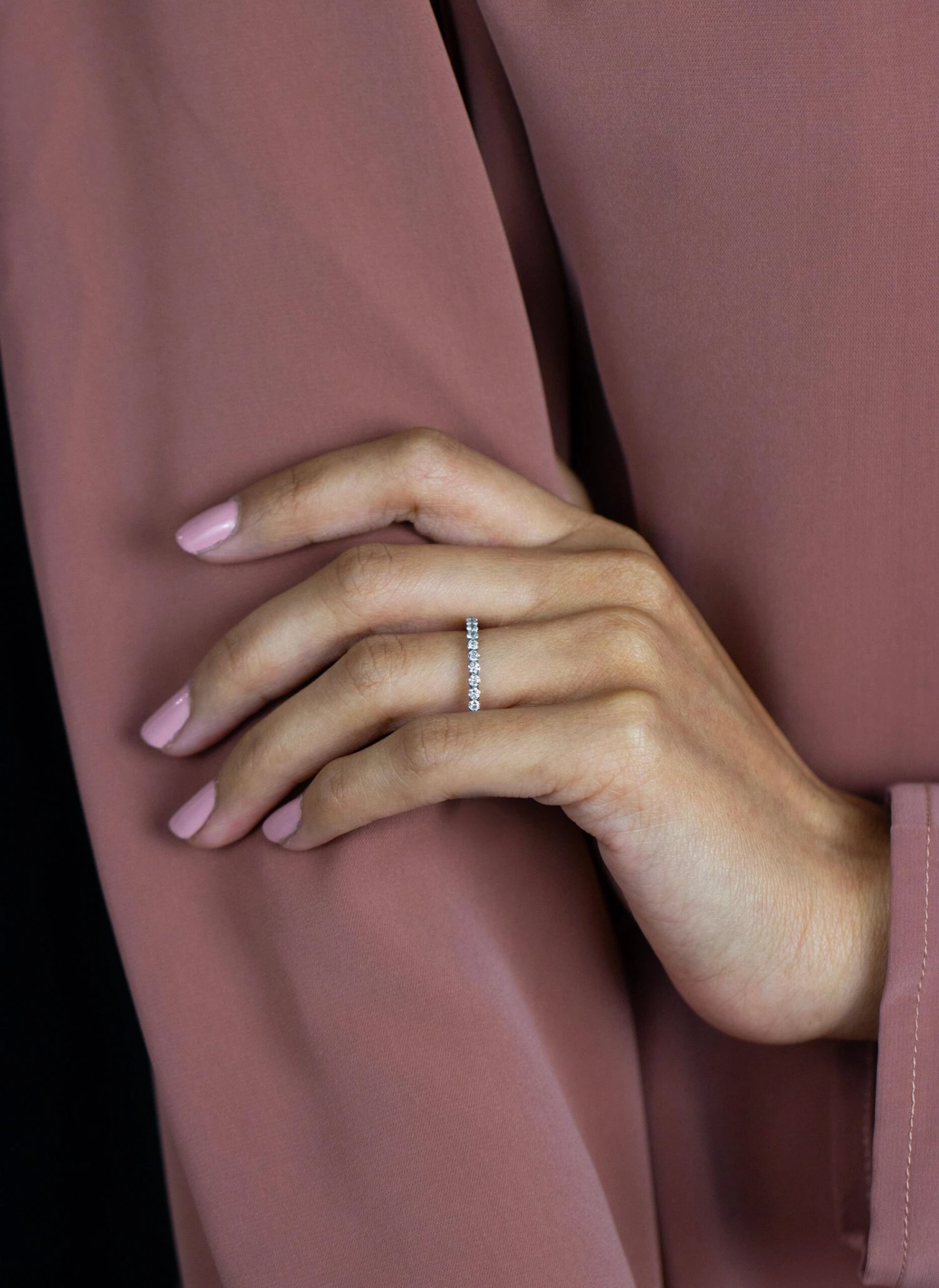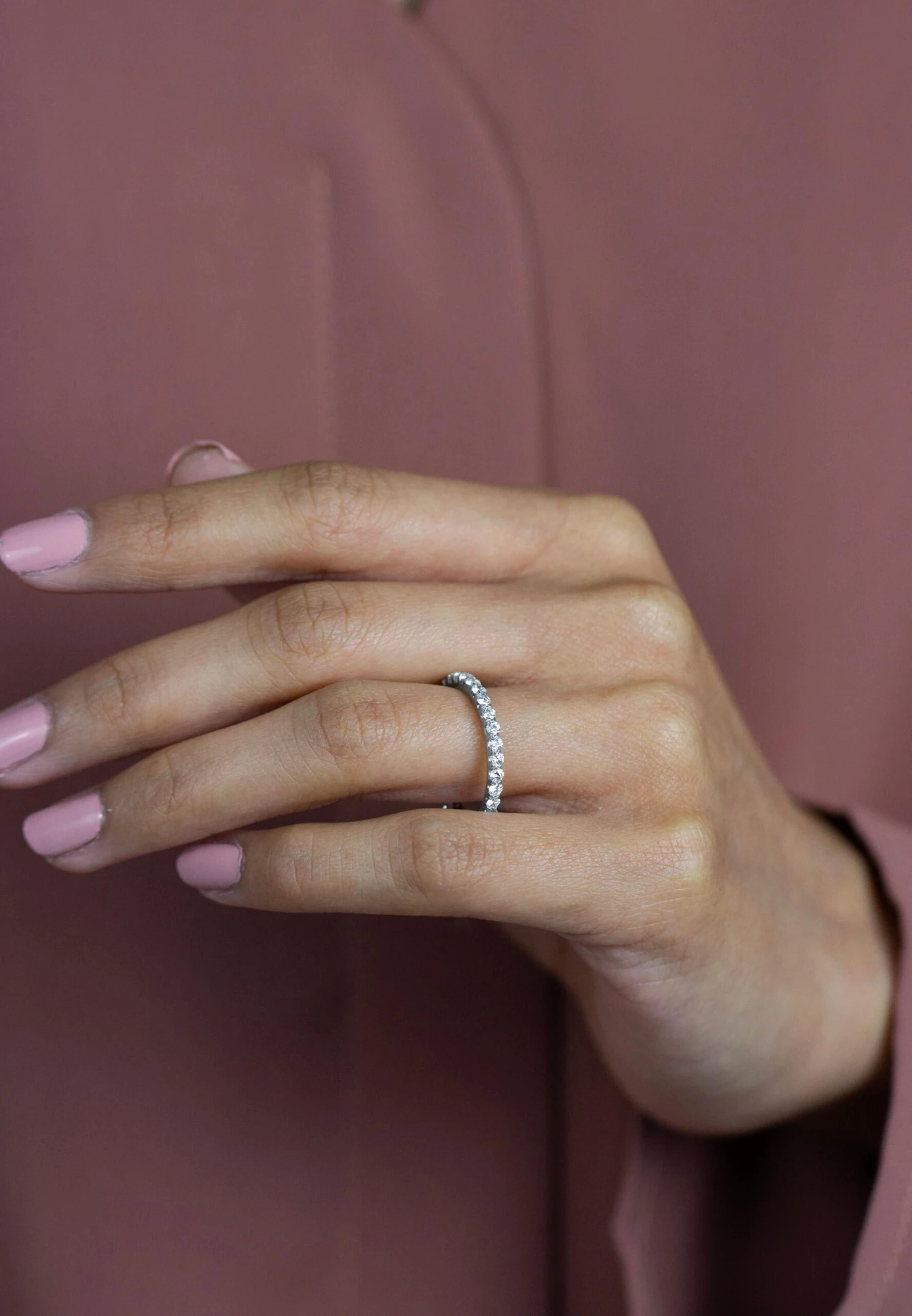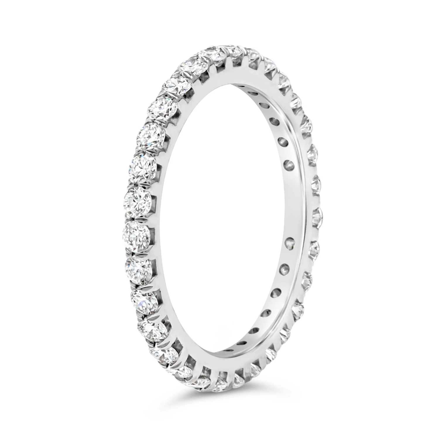 A classy and simple eternity wedding band showcasing a line of 31 brilliant round cut diamonds weighing 0.99 carats total, G color and VS in clarity, set in a four prong basket setting and French pave set. Finely made in platinum. Size 6.5 US resizable upon request.