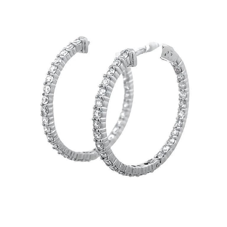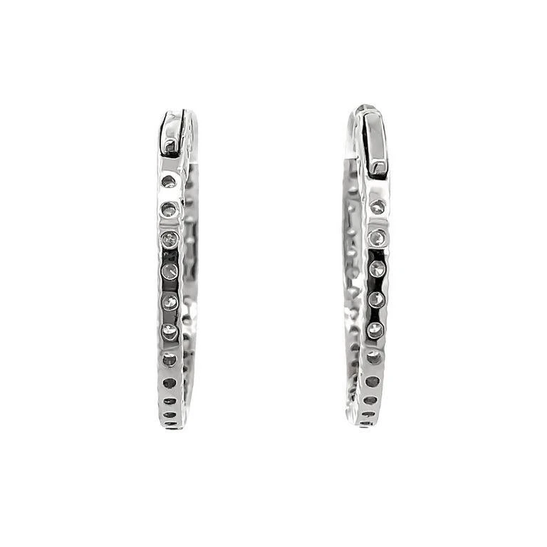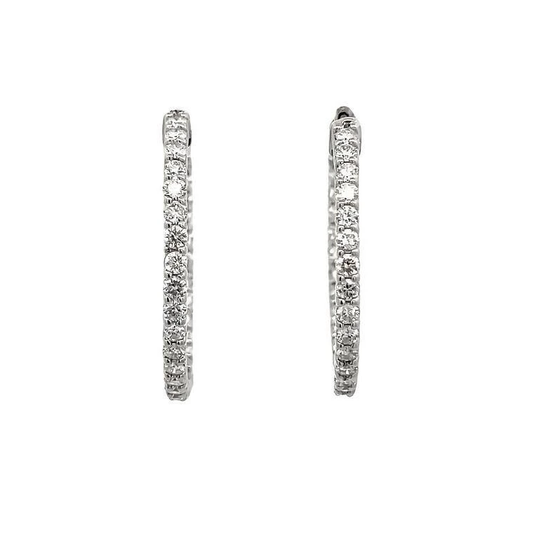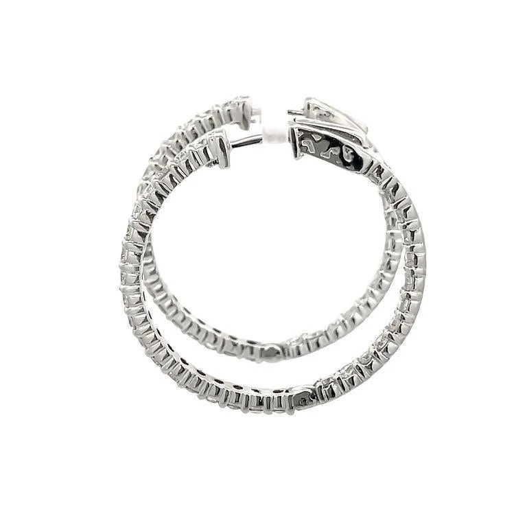 These earrings feature an endless inside-out round hoop design for sparkle from every angle. These earrings are made with white round diamonds and feature 60 stones, every stone is 0.05 pointers, these elegant hoop earrings have a total weight of 2.57CT and are set in polished 14K white gold. This fine jewelry piece can be customized according to your preferences, just let us know and we will create together the best jewelry for you.