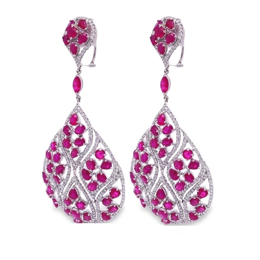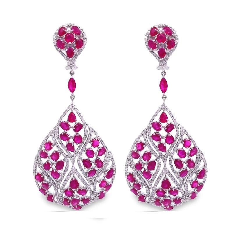 The focal point of these earrings is the vibrant and fiery rubies. The assortment of multi-shaped rubies creates a dynamic and eye-catching display, each gemstone showcasing its unique color and shape. The rich red hues of the rubies exude passion and elegance, making them a symbol of beauty and desire.
