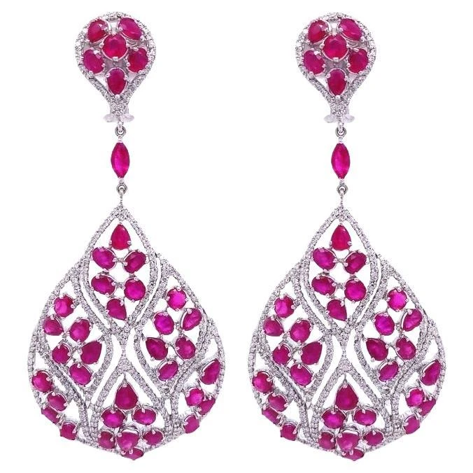 Introducing a captivating pair of Ruby and Diamond Earrings, exquisitely crafted in 18K White Gold. These earrings showcase the timeless allure of rubies, featuring a collection of multi-shaped rubies accented by sparkling diamonds.