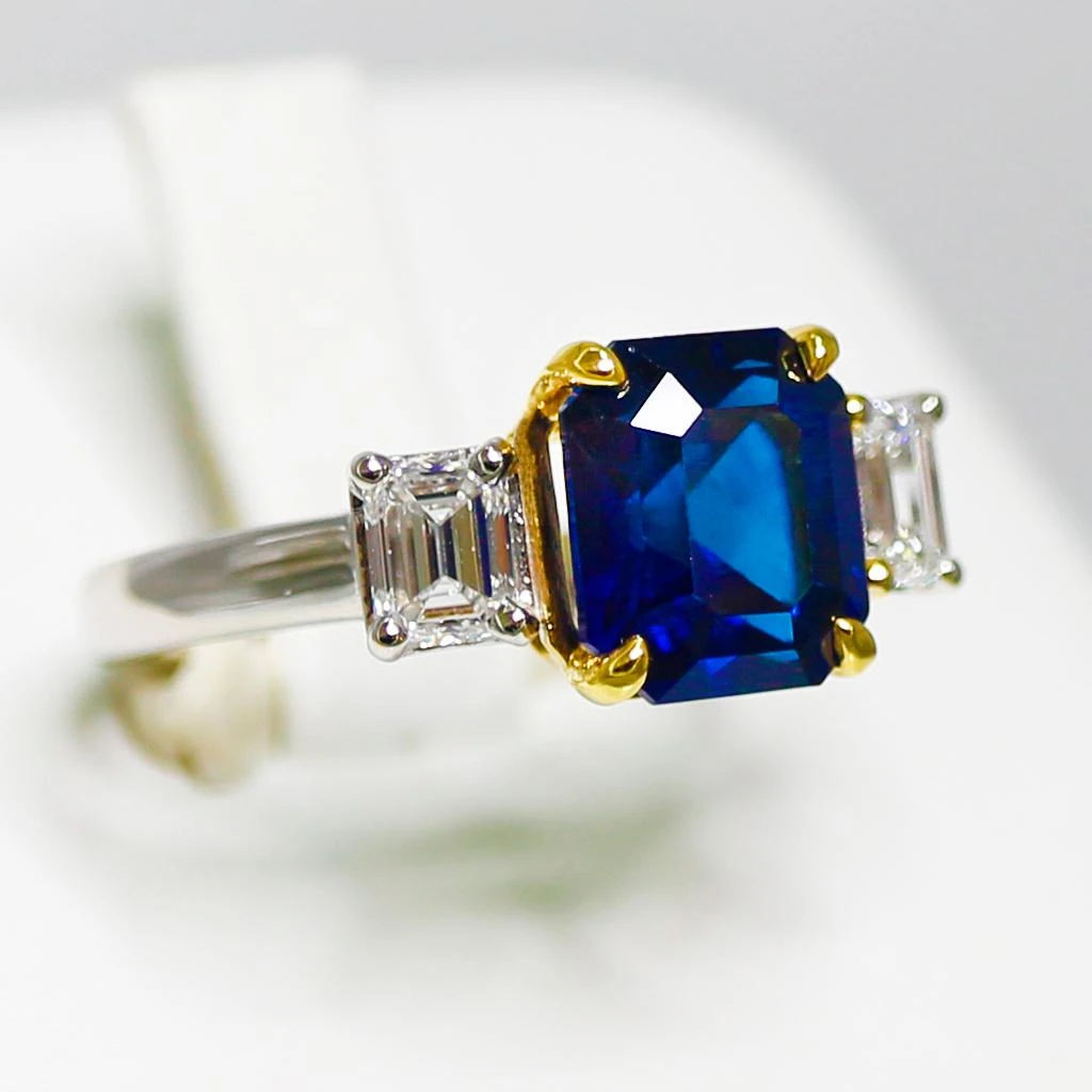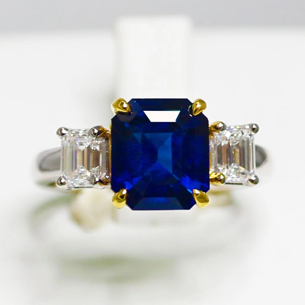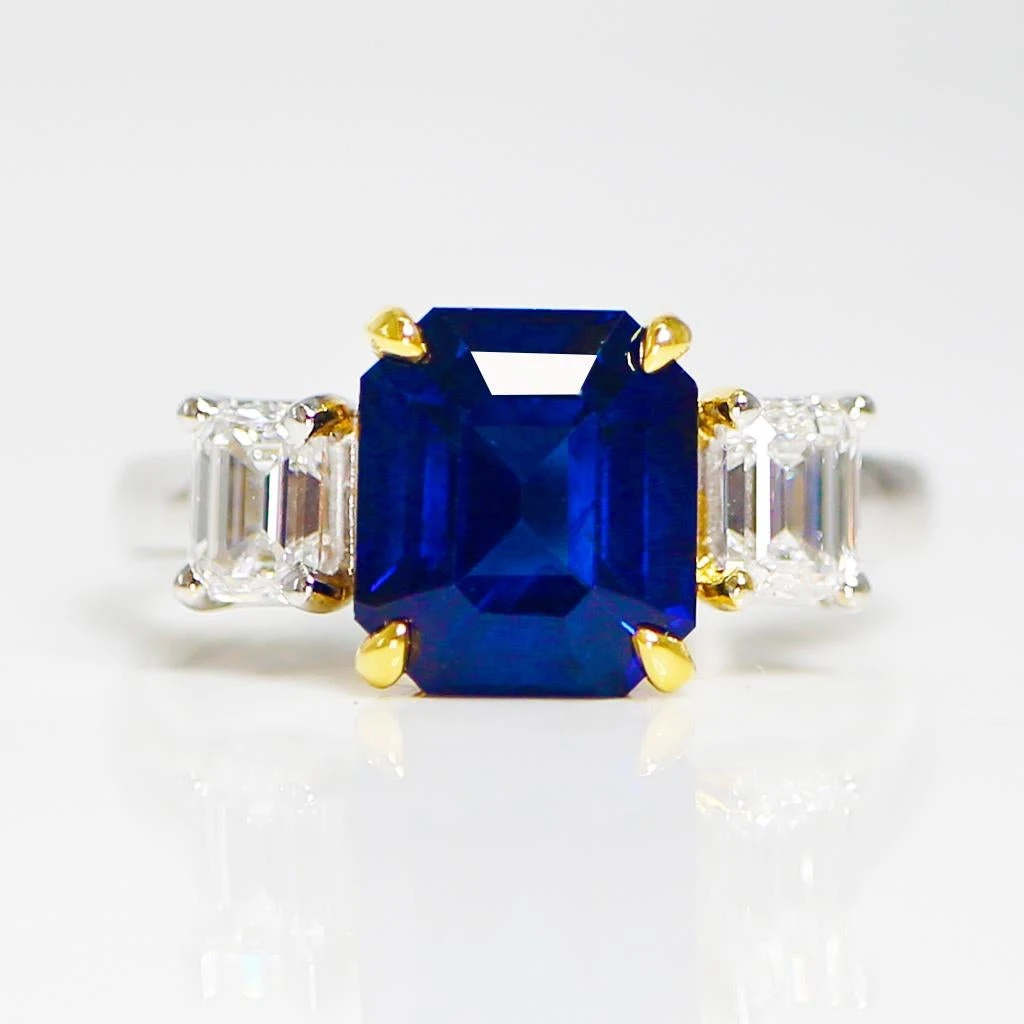 One Lotus natural vivid blue sapphire as the center stone weighing 3.56 ct set with 2 pieces of GIA-certified D VVS1 emerald cut diamond weighing 0.80 ct ( 0.40 x 2 pieces ) on the 18K dual color gold band.