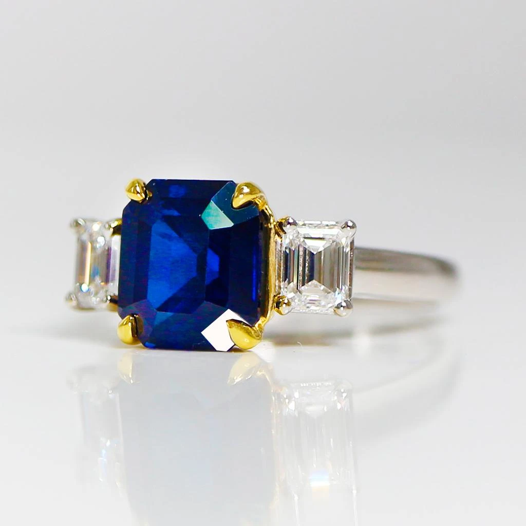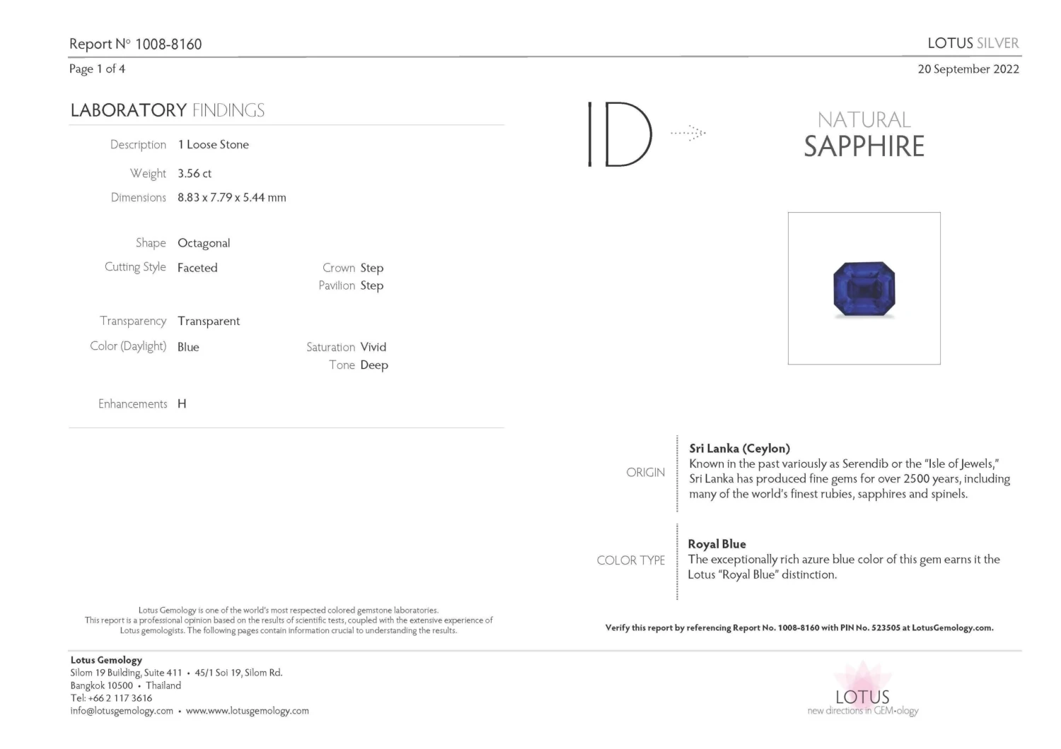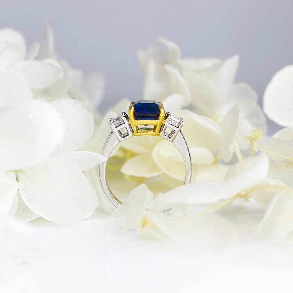 One Lotus natural vivid blue sapphire as the center stone weighing 3.56 ct set with 2 pieces of GIA-certified D VVS1 emerald cut diamond weighing 0.80 ct ( 0.40 x 2 pieces ) on the 18K dual color gold band.
