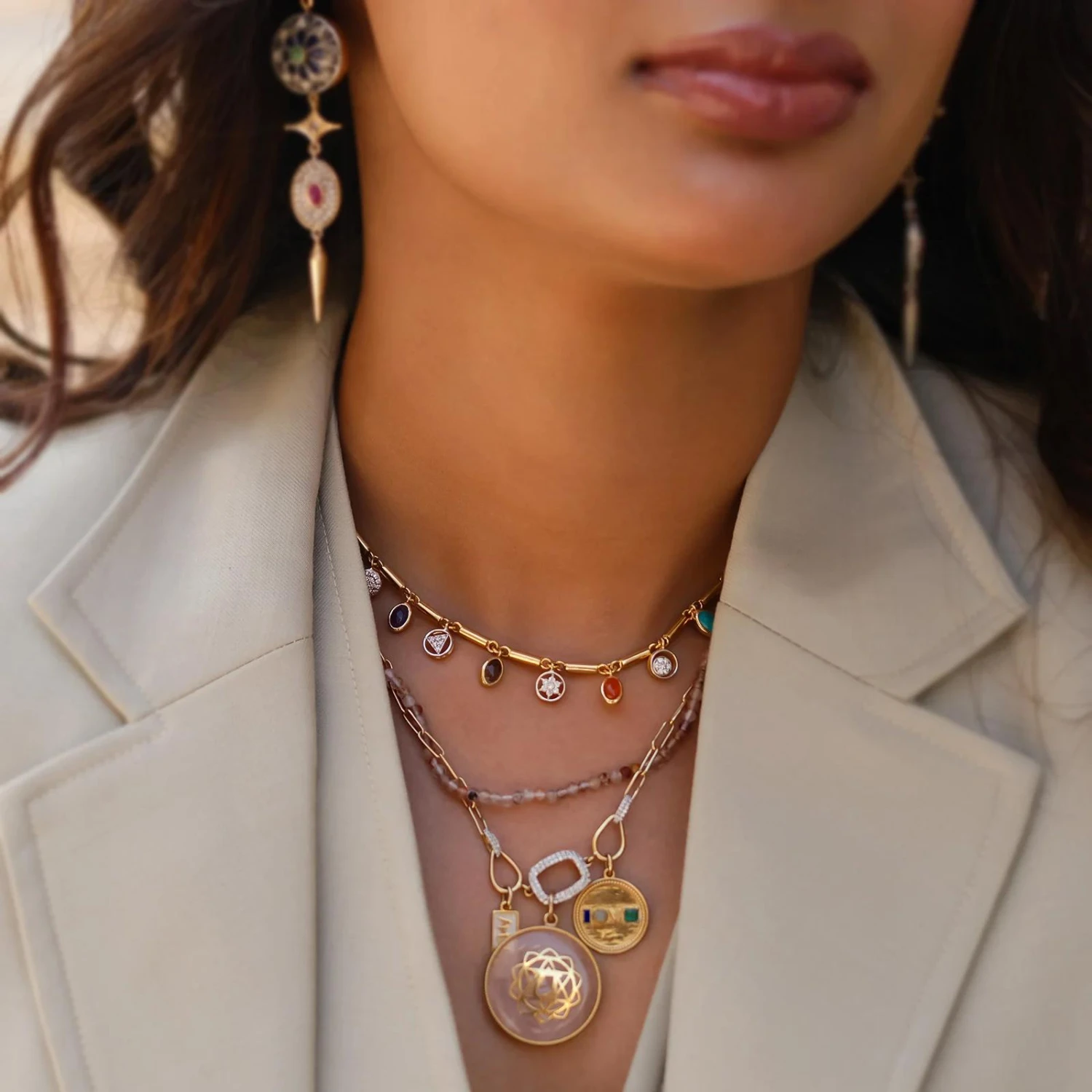 This elegant beauty is meticulously handcrafted with elements signifying one of the 7 chakras. A complex and ancient system that originated in India, the Sanskrit word chakra means wheel and represents the central energy systems of our body. Worked in gold, along with diamonds, the intricate detailing adds to the aesthetic value of this symbolic piece.
