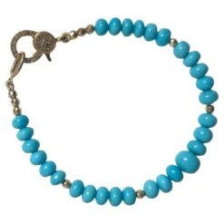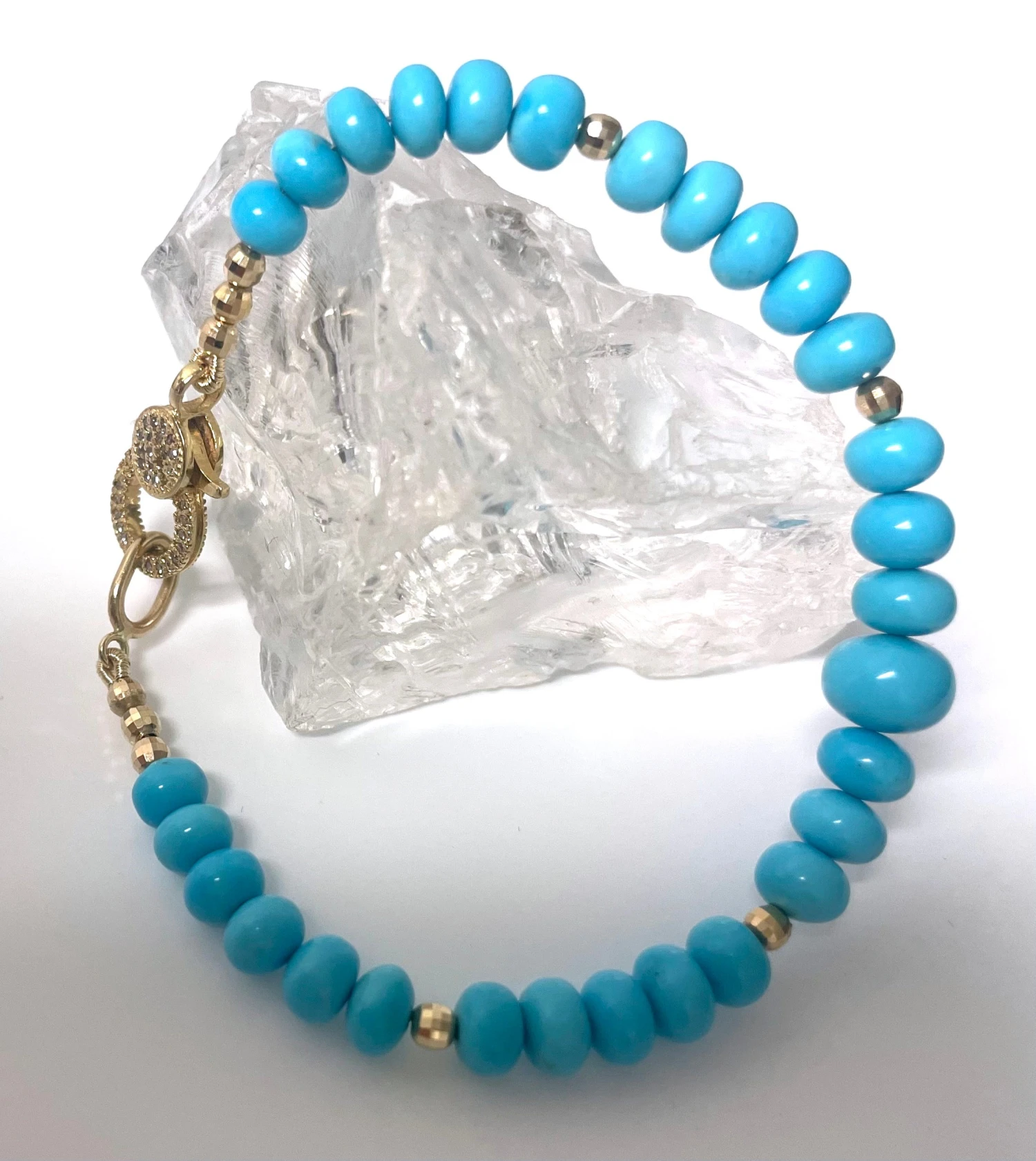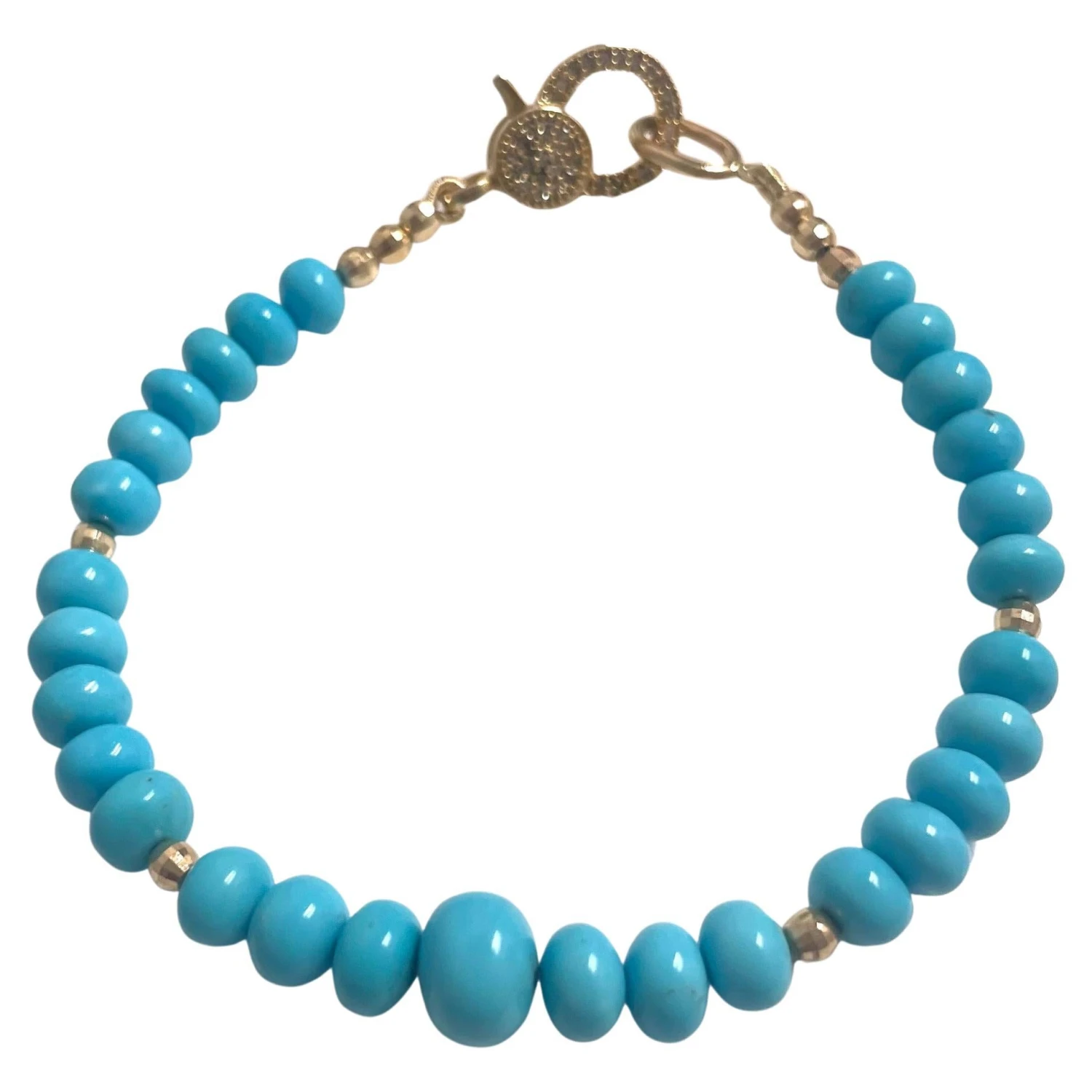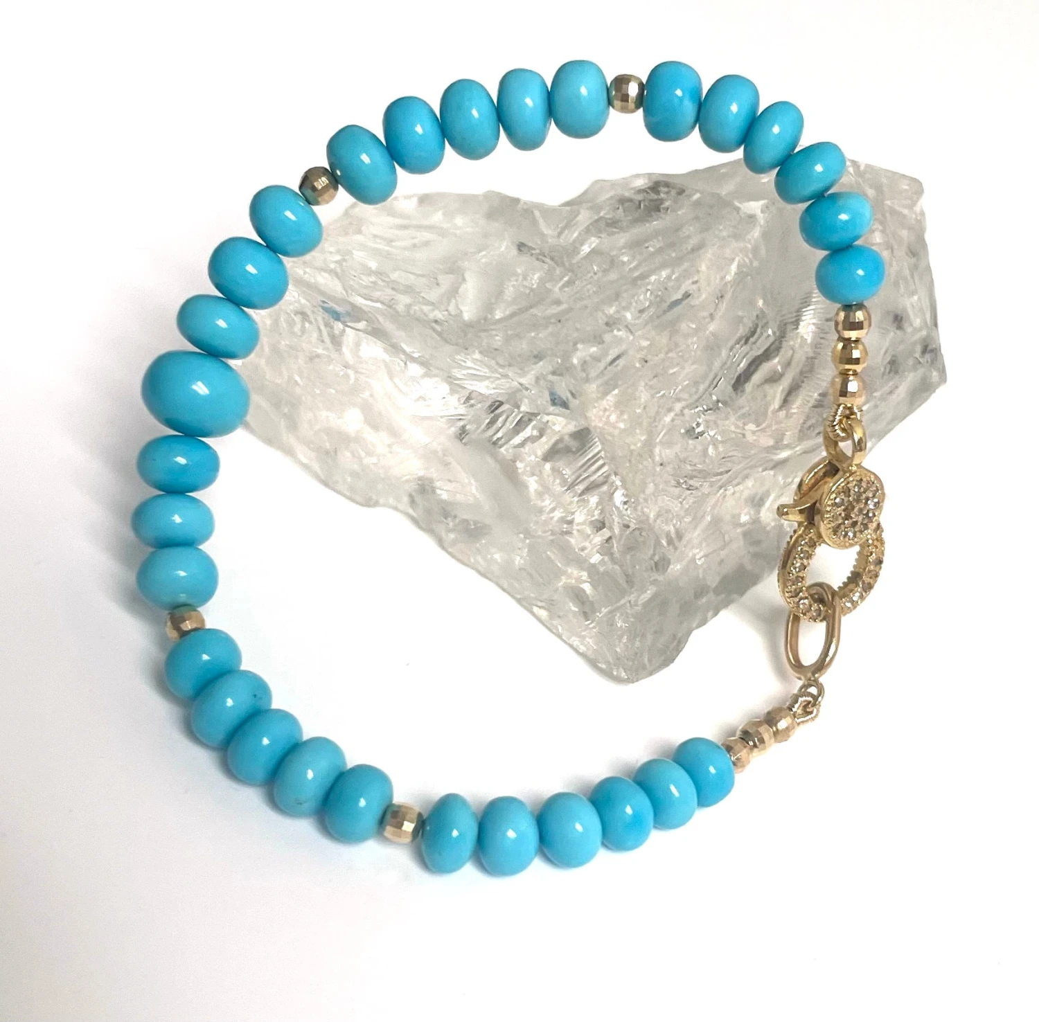 Beautiful, vibrant Sleeping Beauty turquoise with a pave diamond clasp, accented with small yellow gold faceted balls.