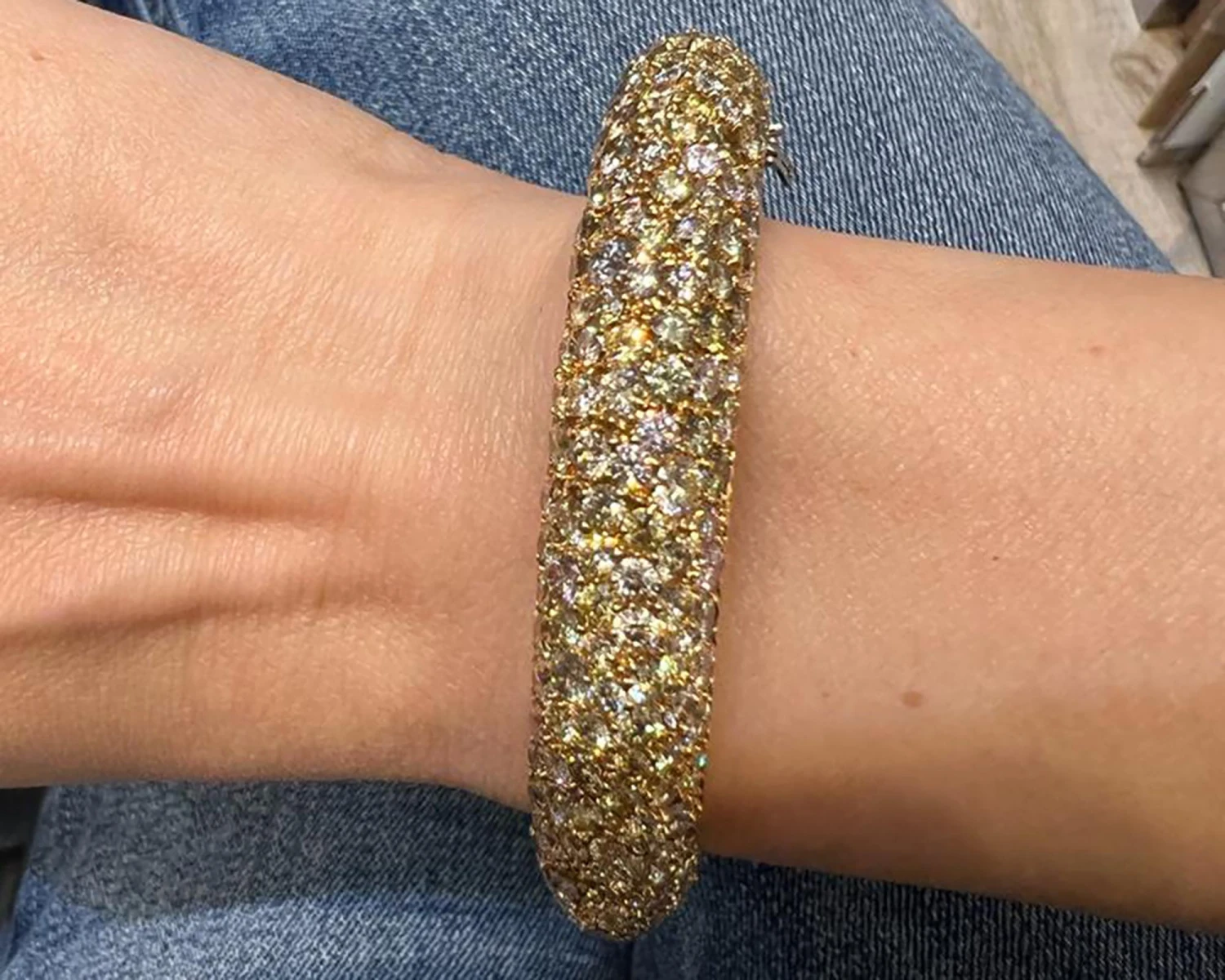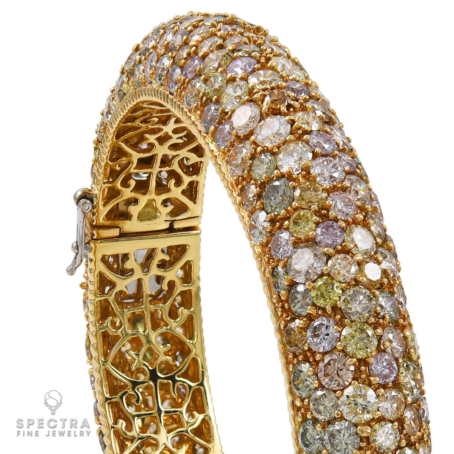Inner circumference measures approx. 6.7” (17 cm). Multicolor diamond weight approx. 32.63 carats total. Overall weight approx. 55.88 grams, made in 18k yellow gold. Circa 2021.