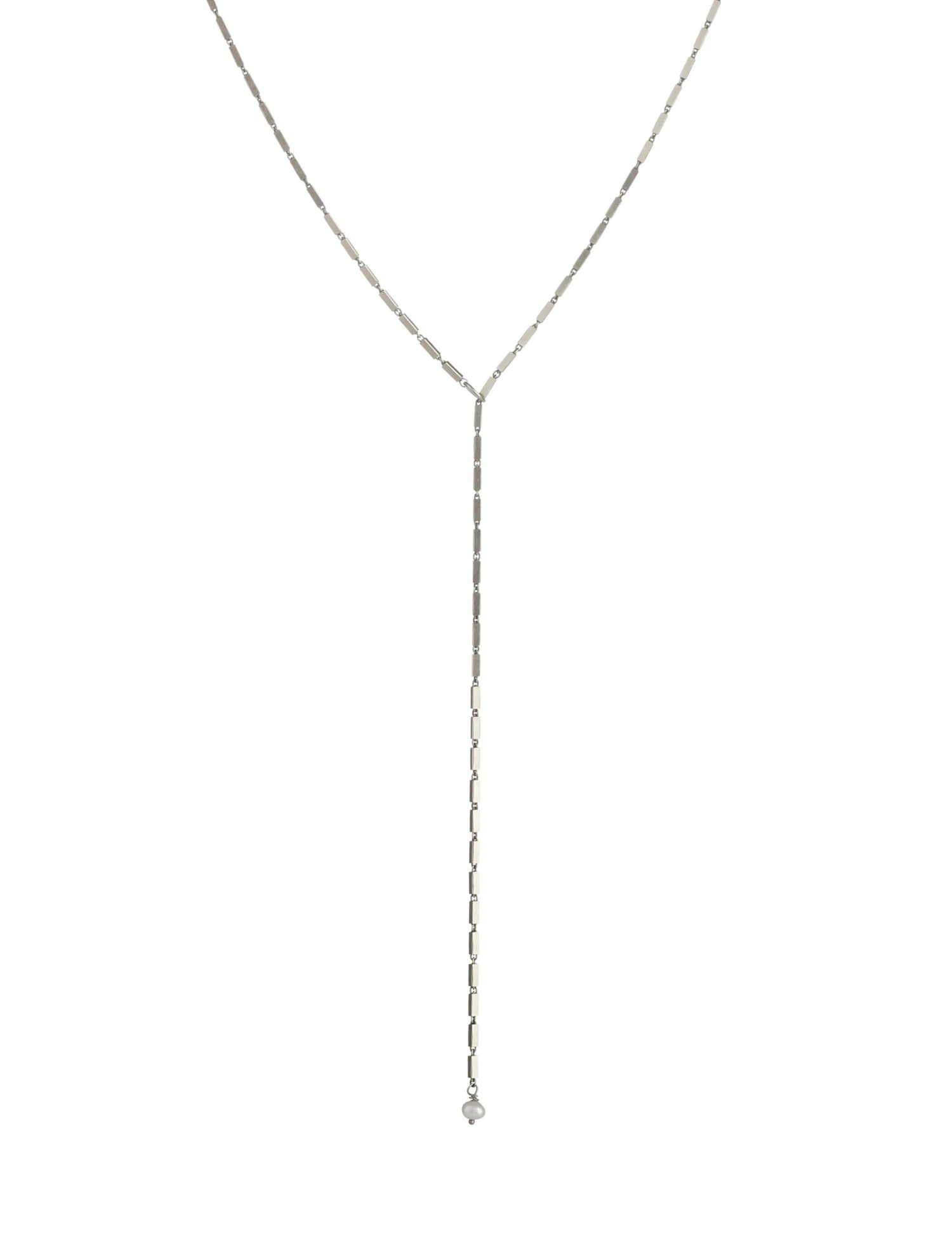 70cm timeless sterling silver chain that consists of rectangular motifs linked to each with a pearl ending . This piece is adjustable and can be worn as a lariat and as a necklace. Suits all types of styles and occasions. Every piece is handmade by local skilled Greek craftsmen.