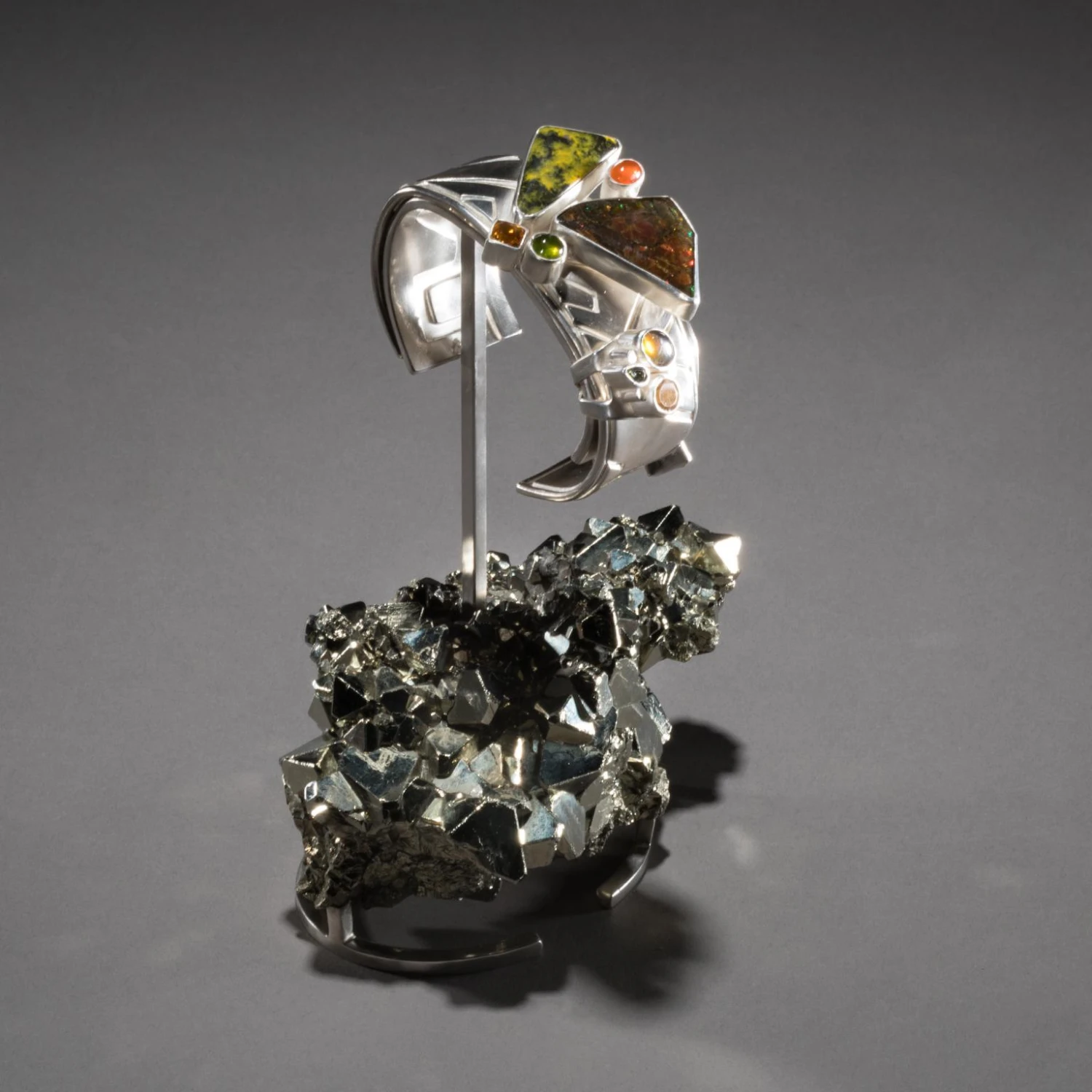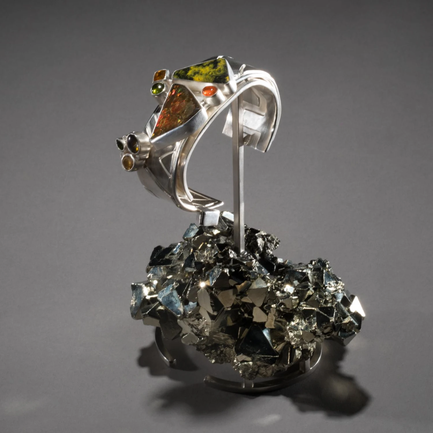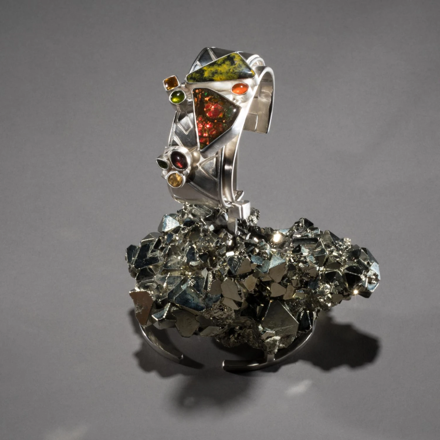 Studio Greytak’s Ammolite Cuff on Pyrite is a controlled burn. Fire plays across the iridescent surface of ammolite, contained in bands of cool silver, and intensifies in the brilliant orange fire opal beside it. Bumblebee jasper, the product of a live volcano on the Indonesian island of Java, angles toward the ammolite, heat drawn to heat. Golden citrine, the light maker, and green vesuvianite, born of another fiery eruption, break away like rising sparks. Below, the precise angles and edges of octahedral pyrite throw light in all directions. Citrine and ammolite appear in the base as well, lighting up the ever-joyful tourmaline.