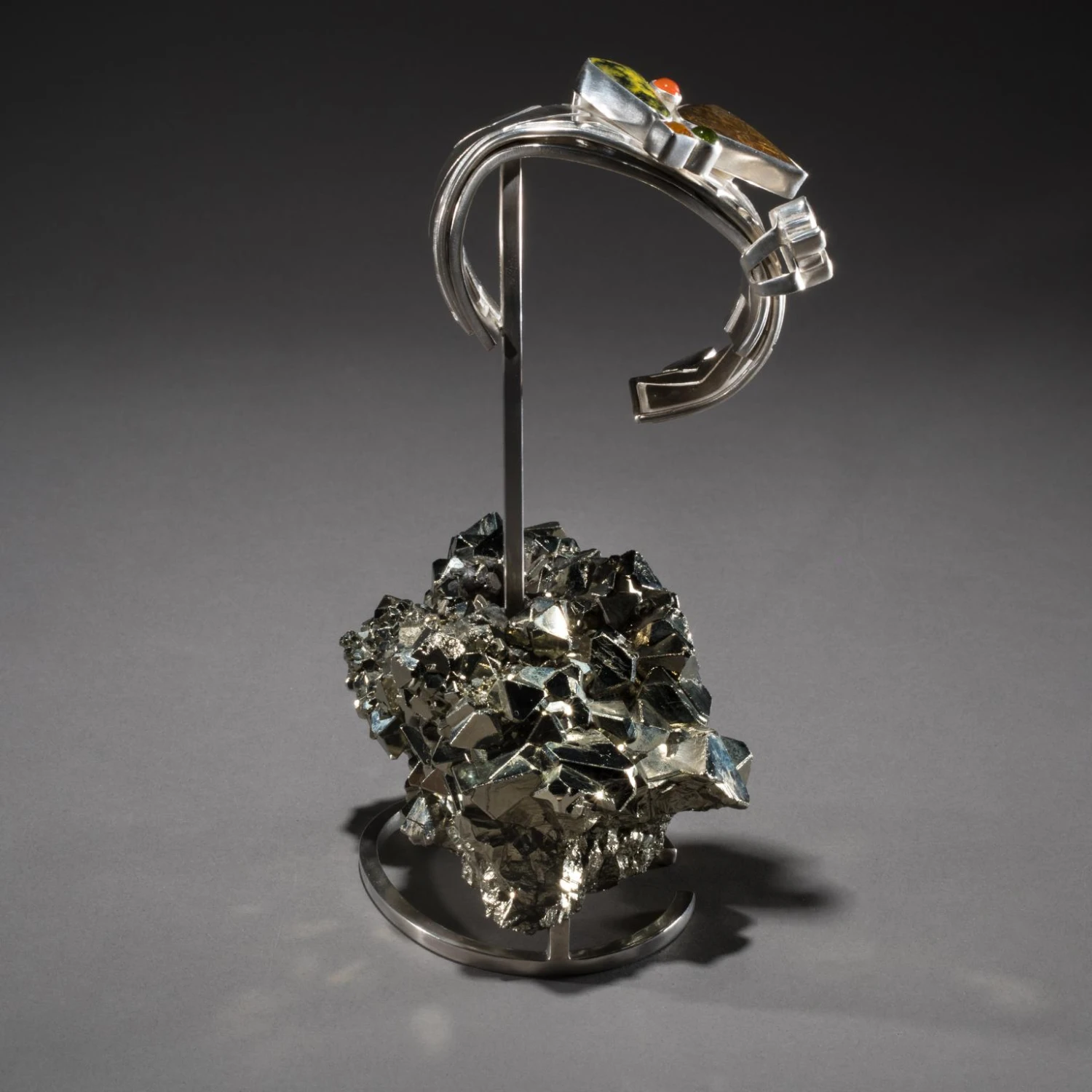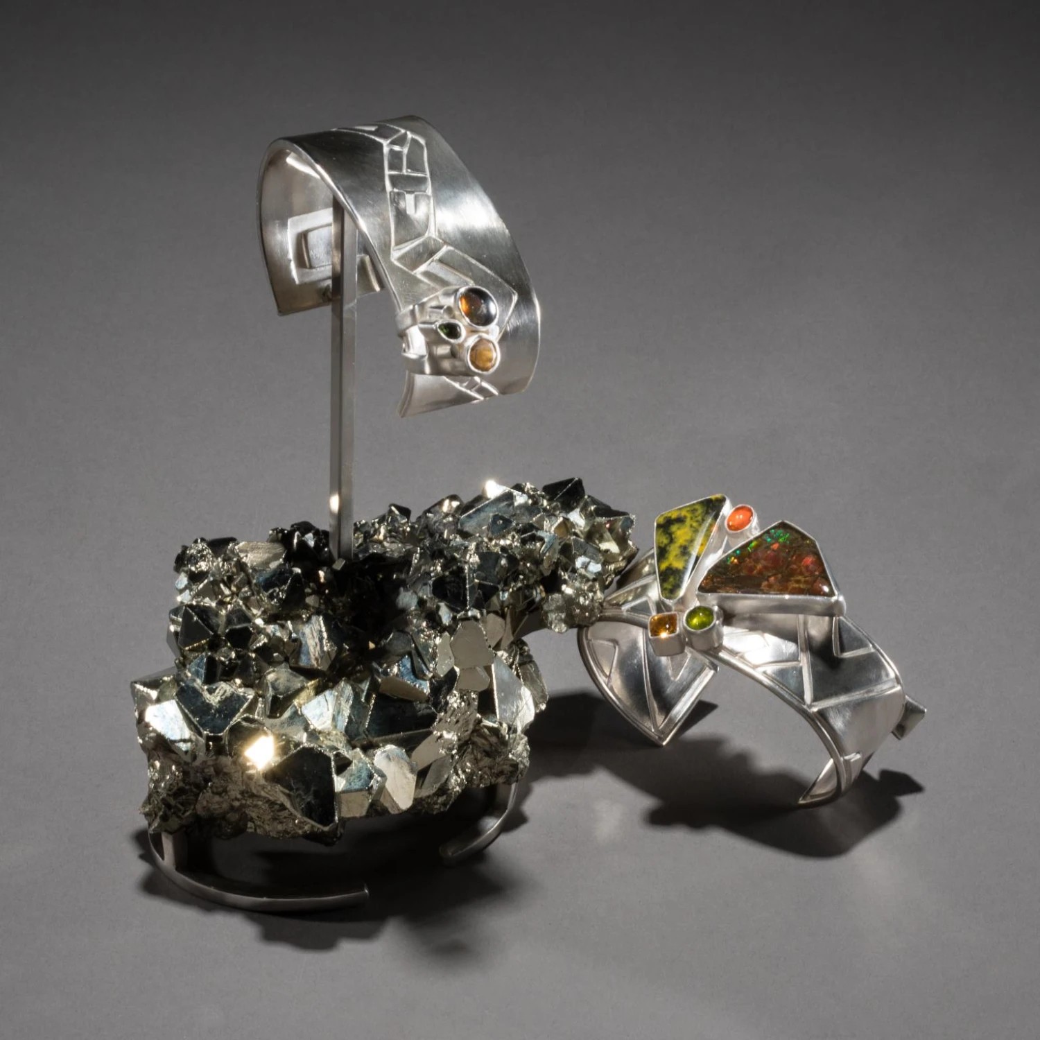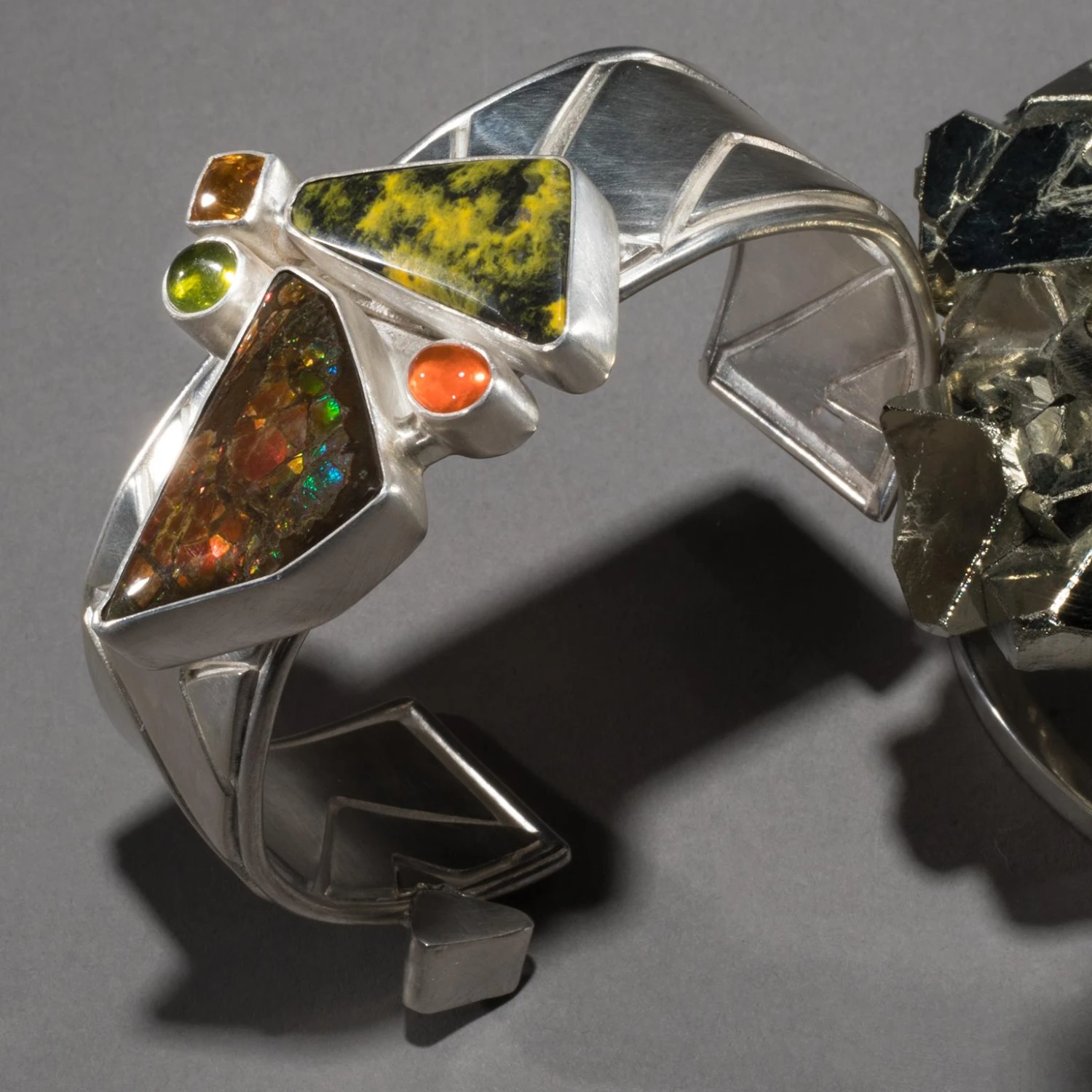 Studio Greytak’s Ammolite Cuff on Pyrite is a controlled burn. Fire plays across the iridescent surface of ammolite, contained in bands of cool silver, and intensifies in the brilliant orange fire opal beside it. Bumblebee jasper, the product of a live volcano on the Indonesian island of Java, angles toward the ammolite, heat drawn to heat. Golden citrine, the light maker, and green vesuvianite, born of another fiery eruption, break away like rising sparks. Below, the precise angles and edges of octahedral pyrite throw light in all directions. Citrine and ammolite appear in the base as well, lighting up the ever-joyful tourmaline.