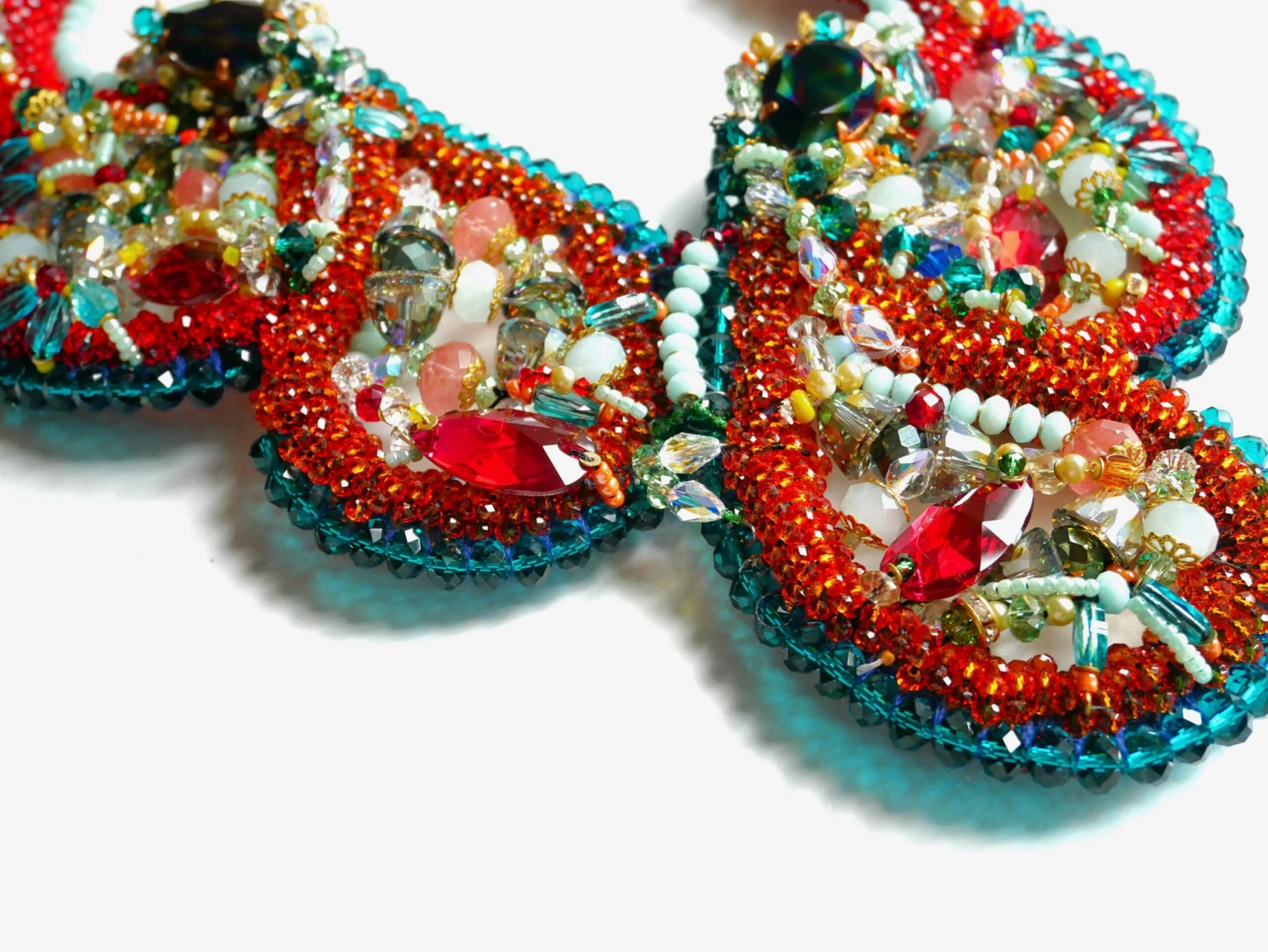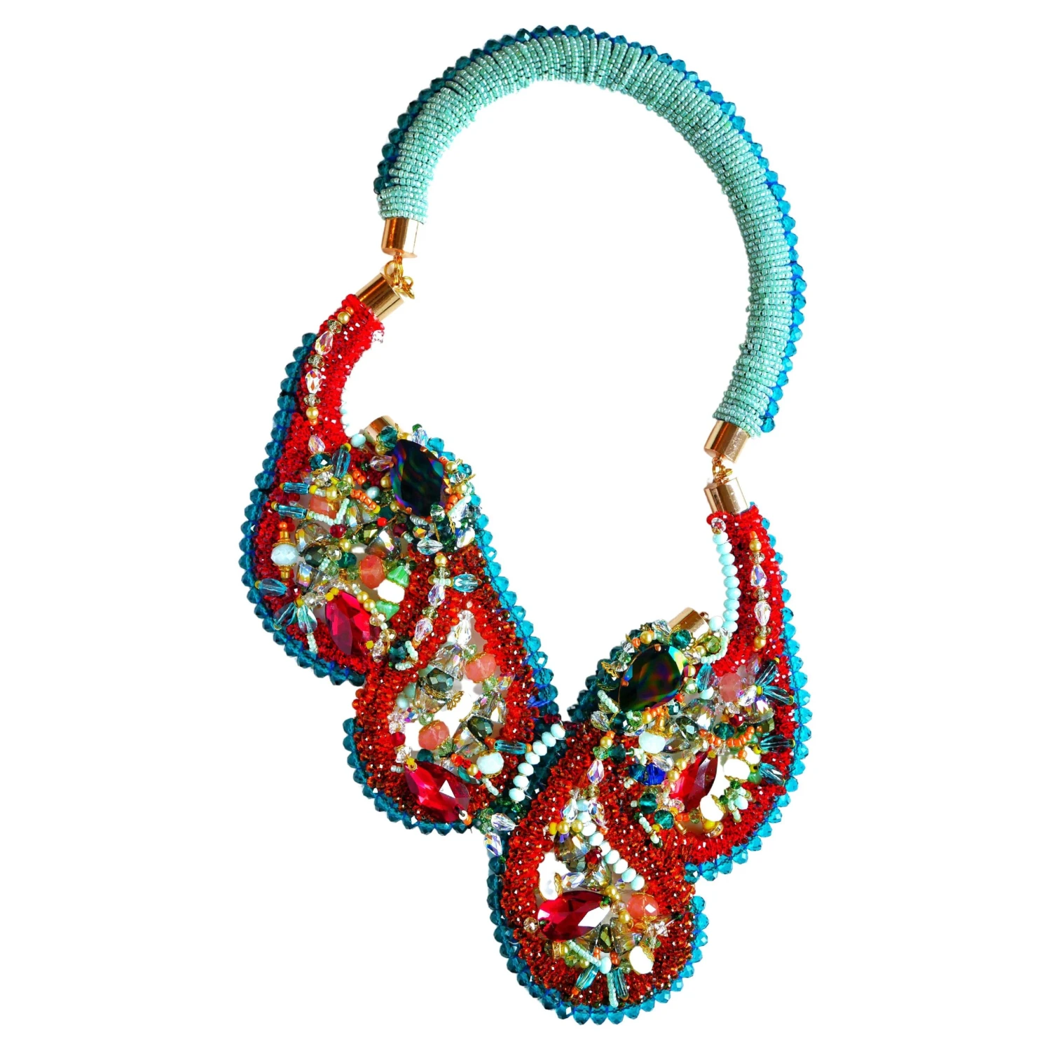 Contemporary in design, this opulent, richly beautiful in colours, stylish, and elegant necklace is secured to the side with a hook-on clasp.