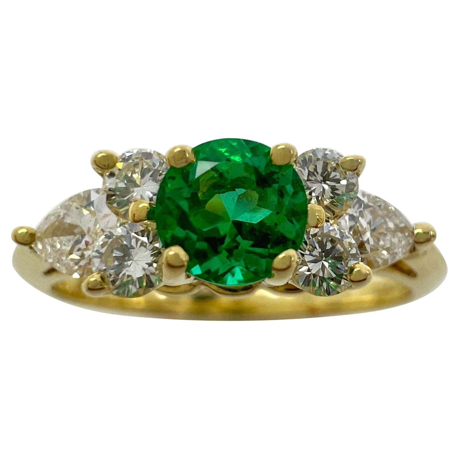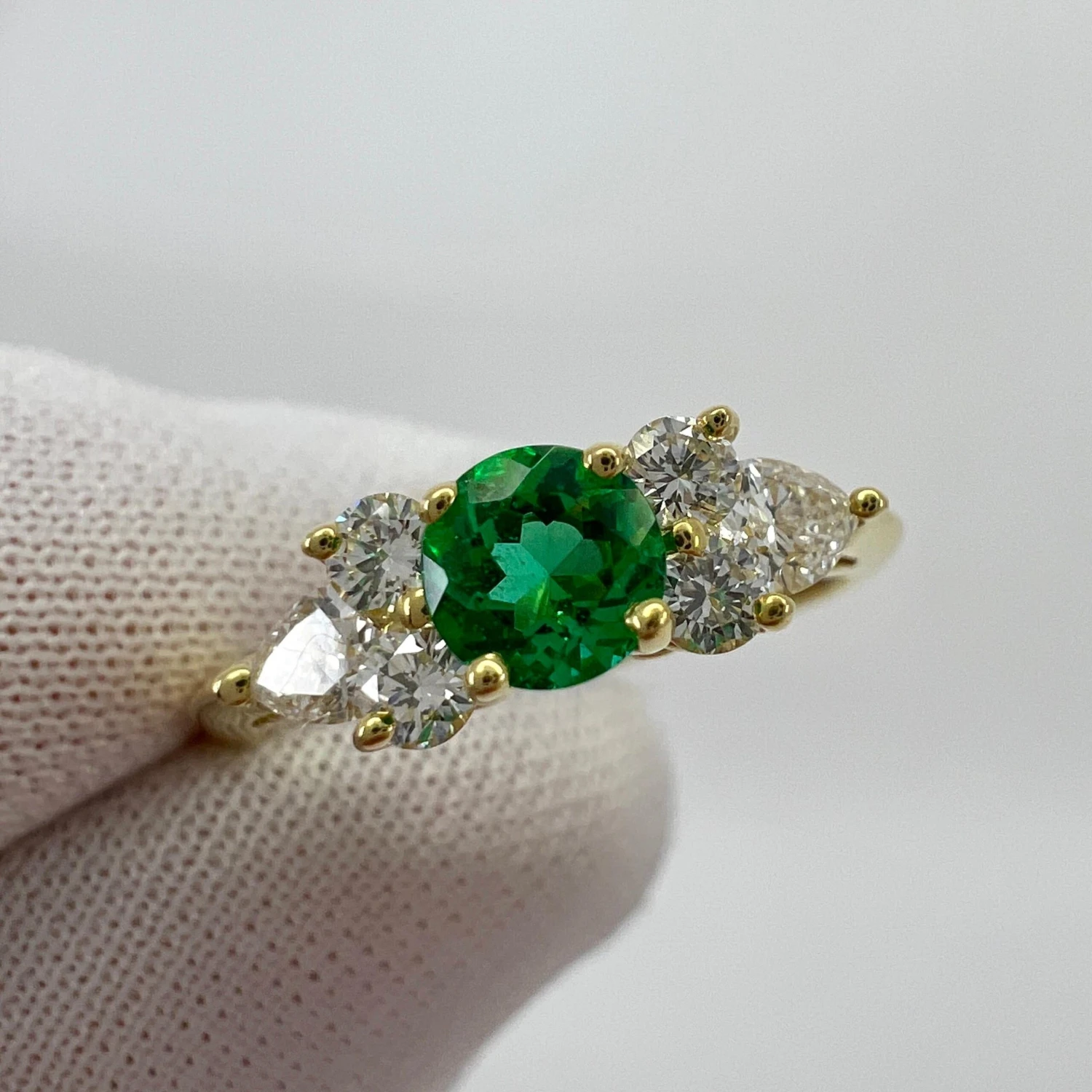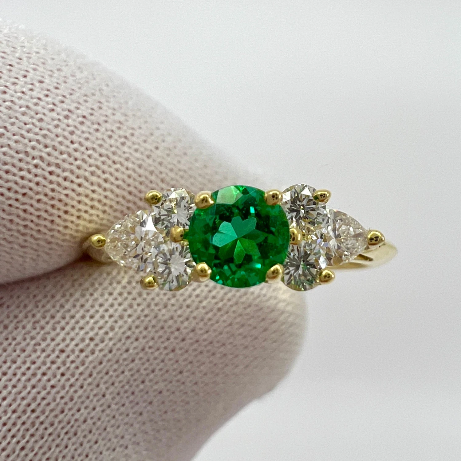 A beautifully made yellow gold cluster ring set with a stunning 4.1mm deep vivid green round cut emerald. Superb colour, clarity and cut.