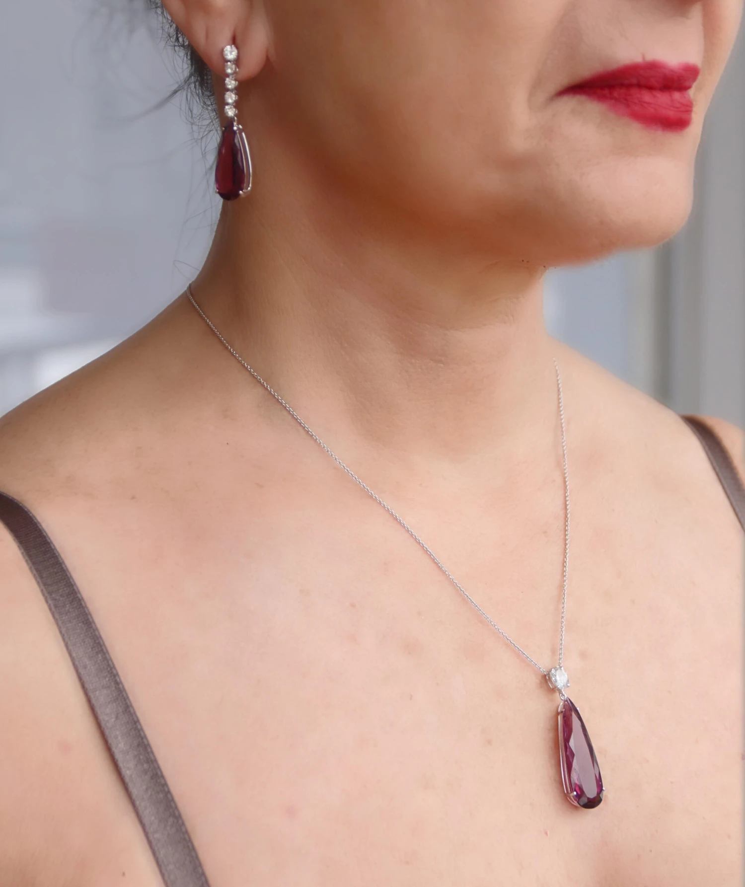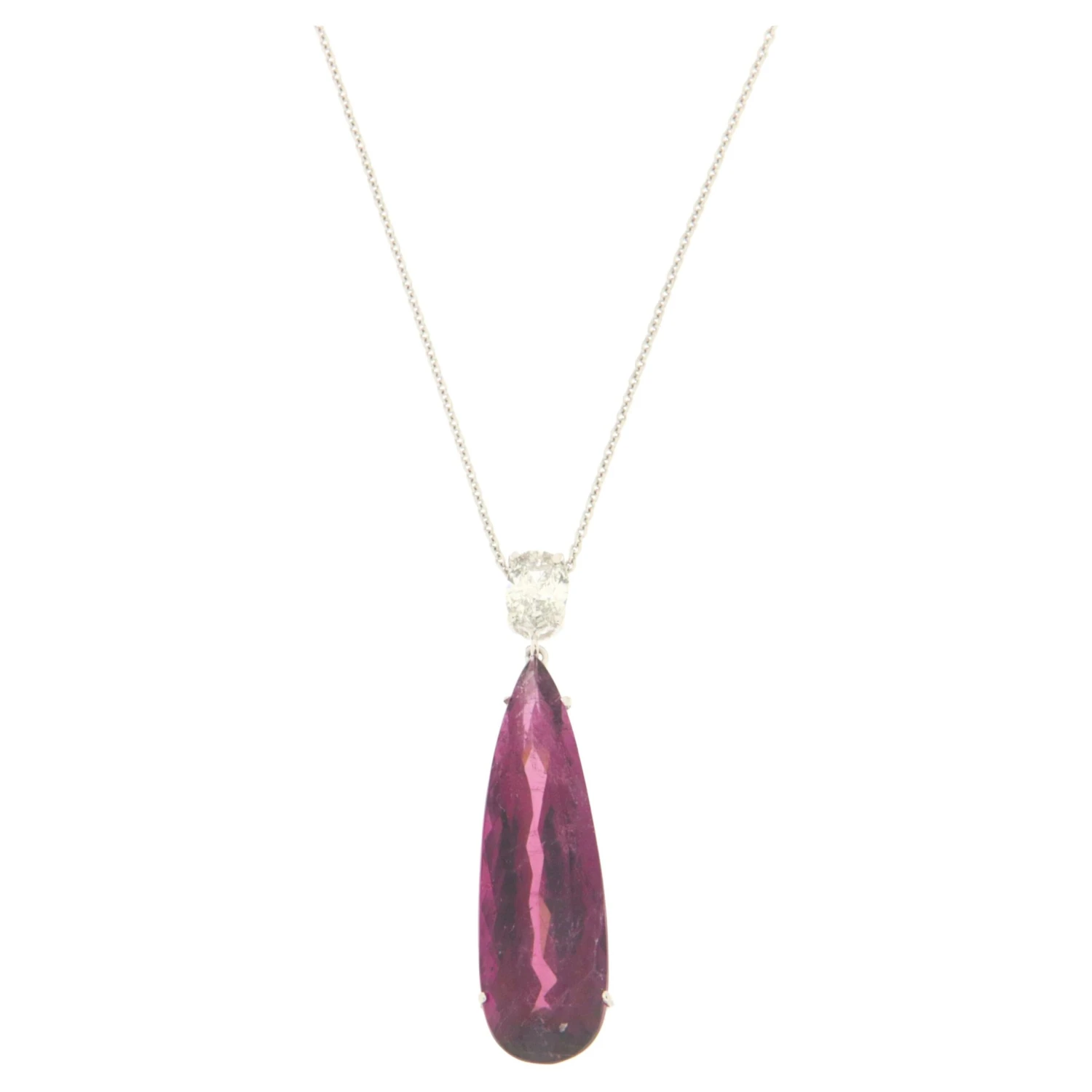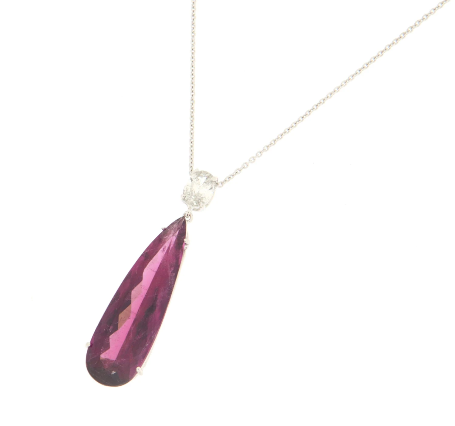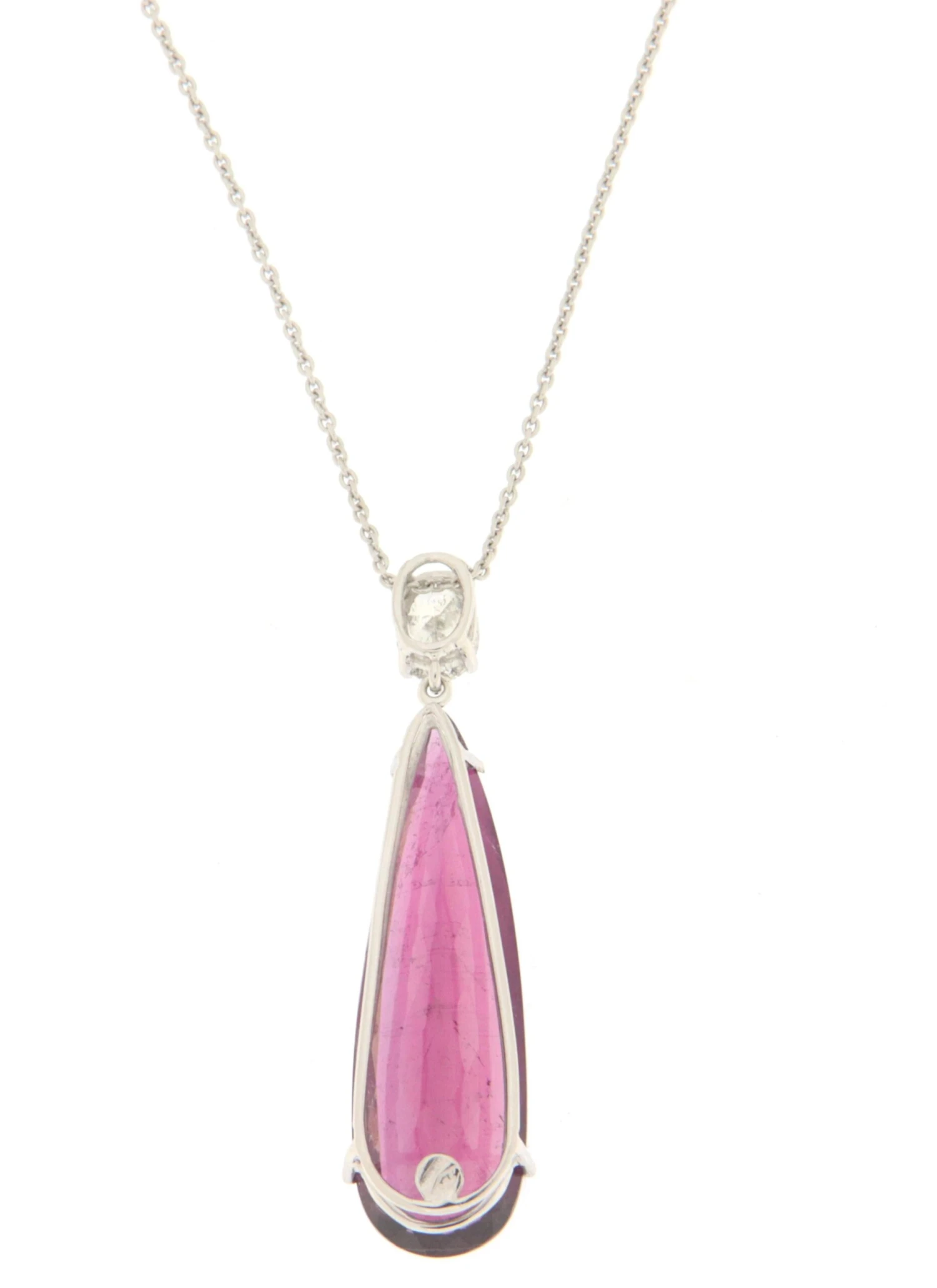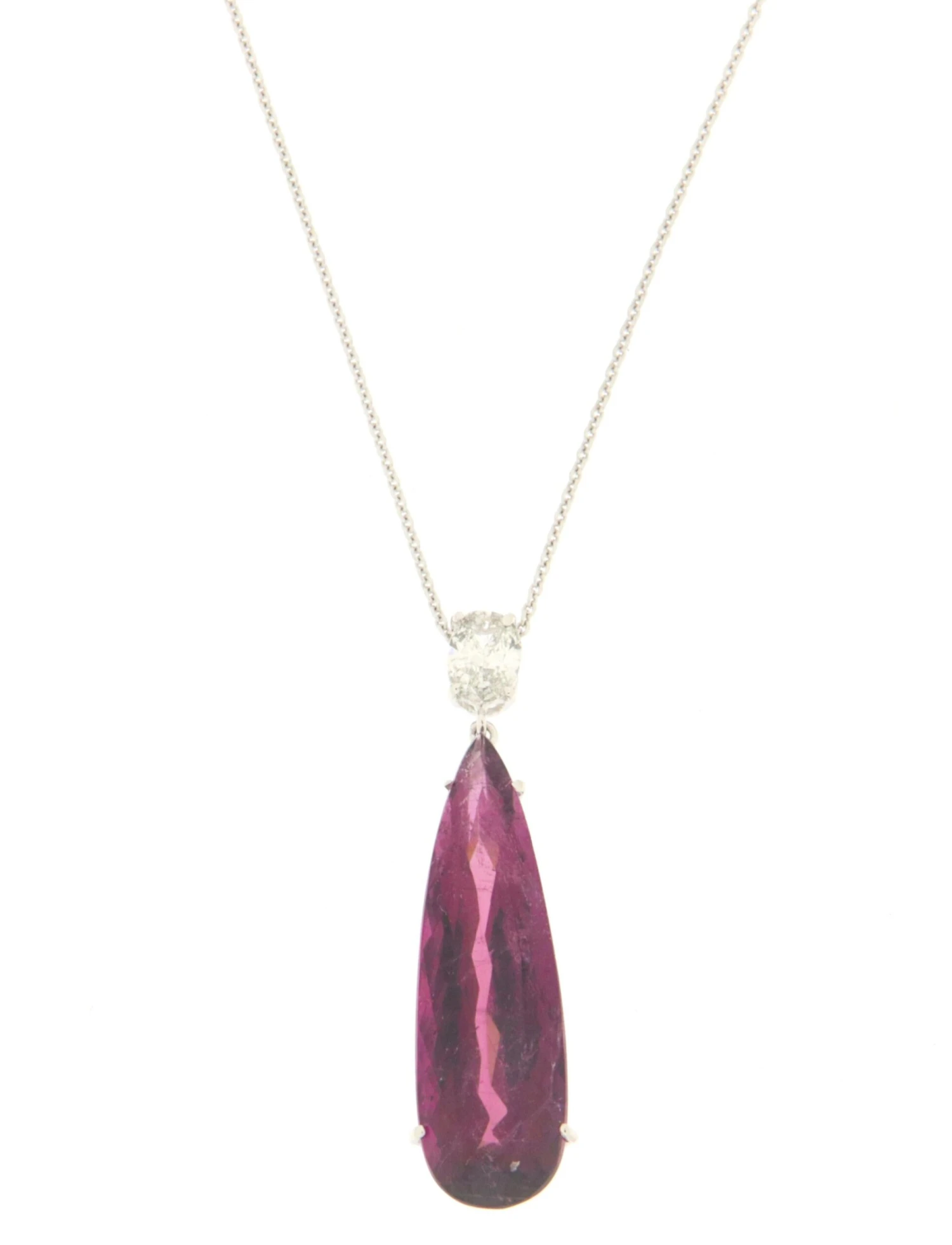 18 karat white gold pendant necklace. Handmade by our craftsmen and assembled with diamond and violet tourmaline