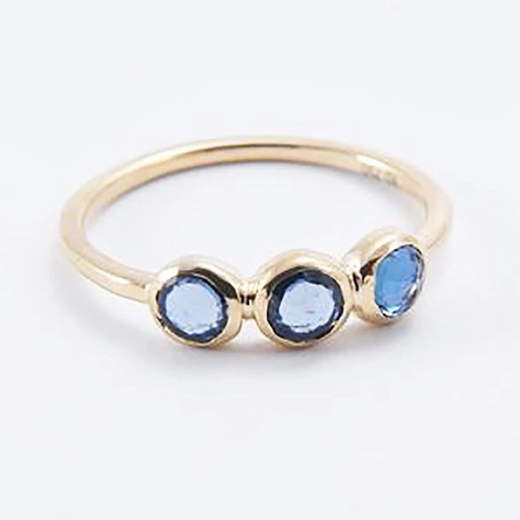 18K yellow gold band set with three bezel set 0.12” blue sapphires.