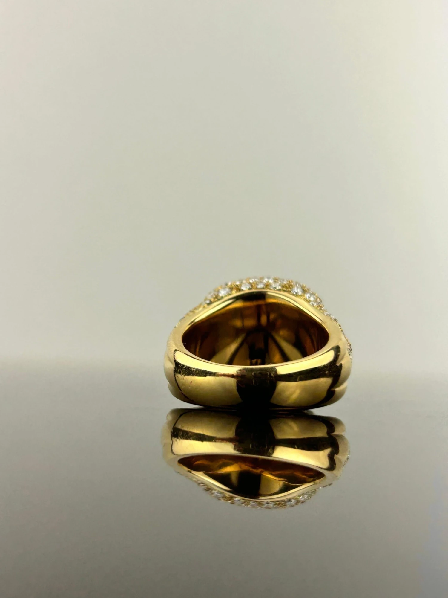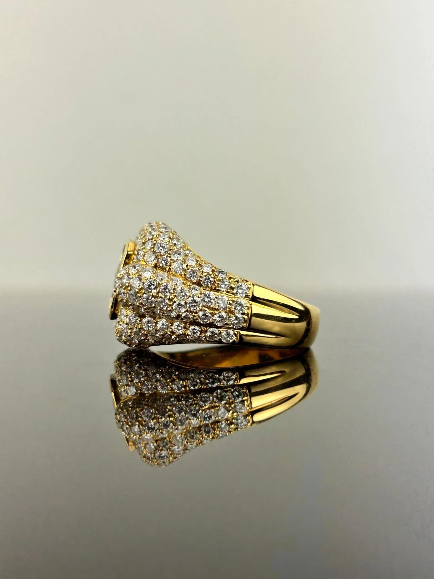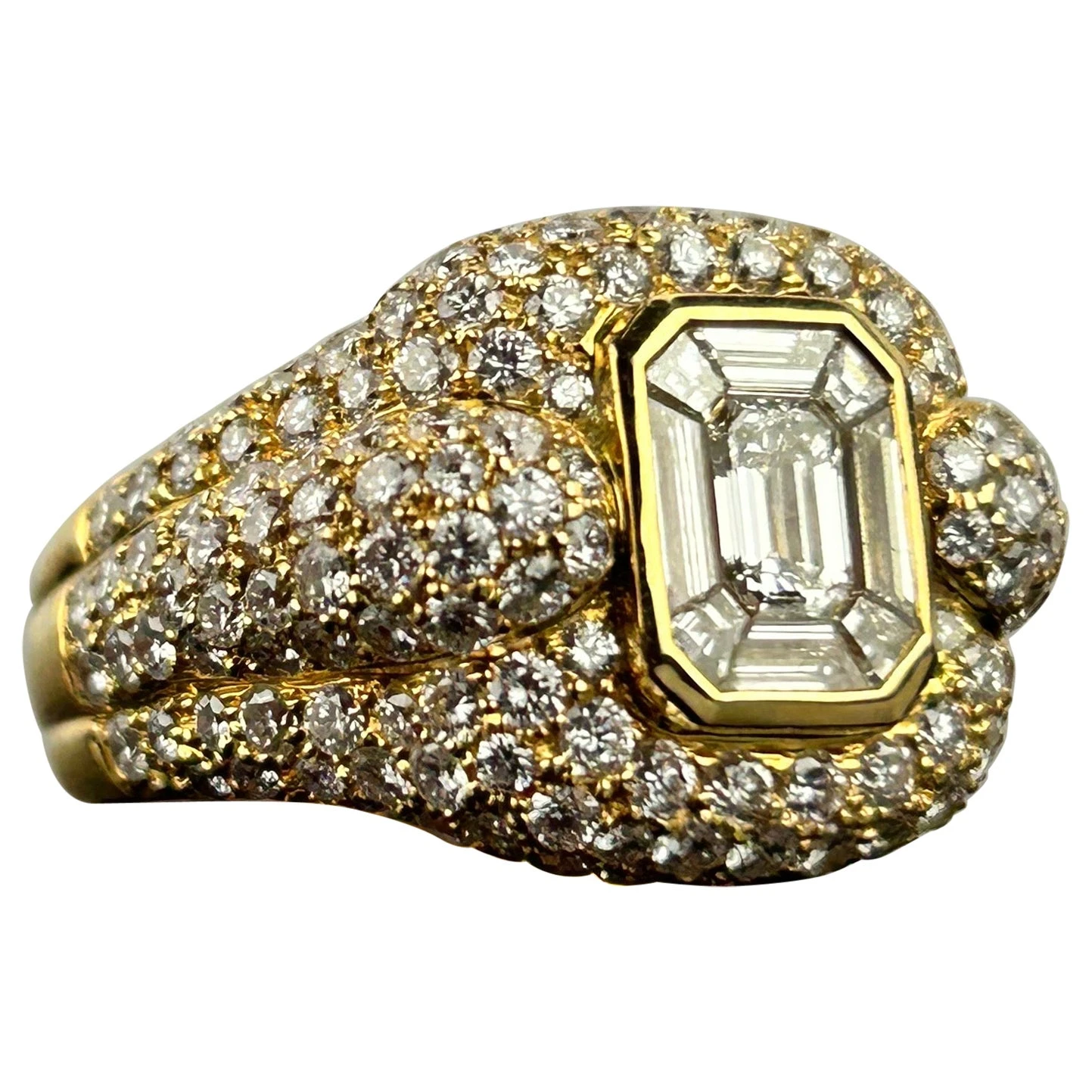 A stunning 5.13 carat VVS quality White Diamond set in solid 26 grams of 18K Yellow Gold. The ring is unisex, sized at US 9.25 , can be resized. The center is invisible set diamonds, with a center stone of 0.5 carat emerald cut diamond.