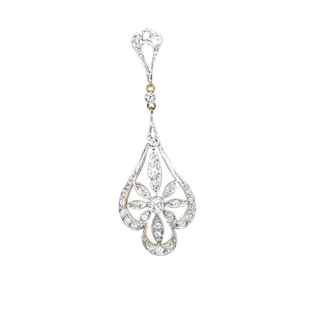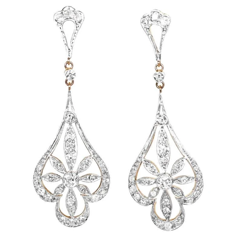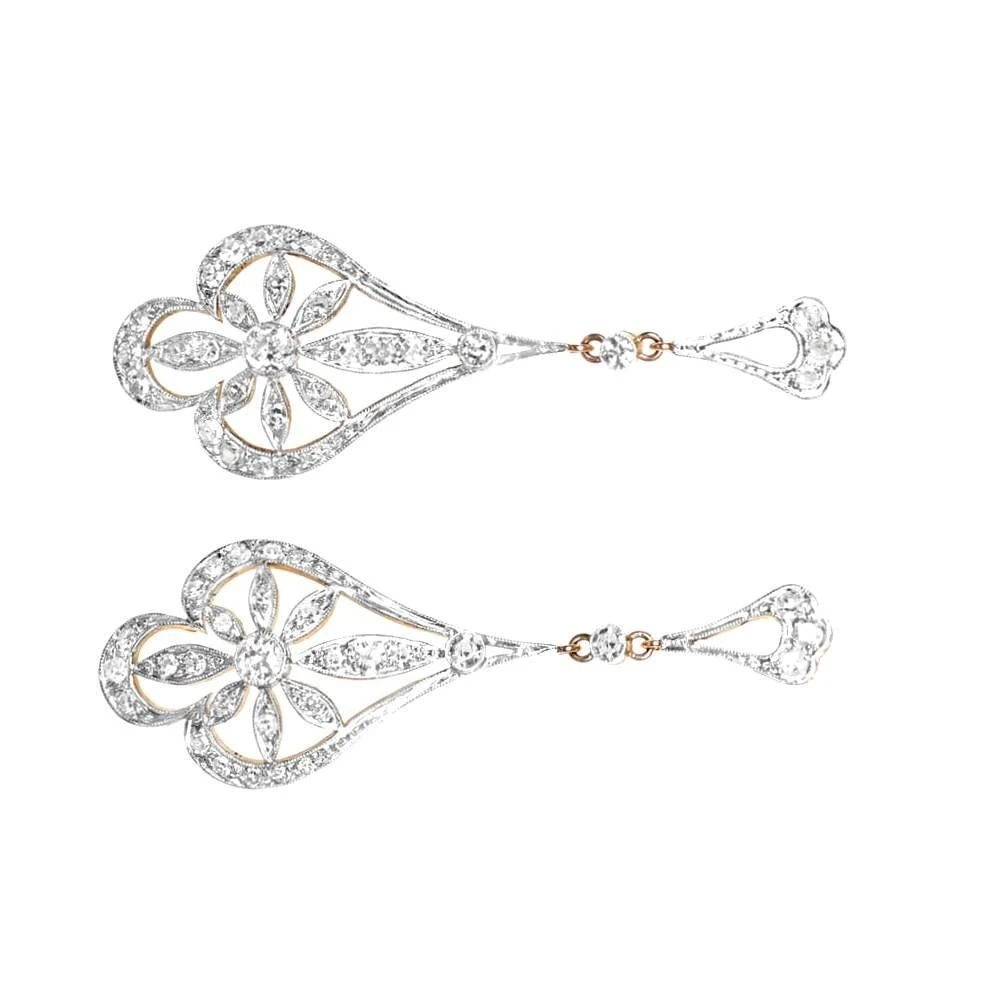 The choice of platinum and 18k yellow gold adds a luxurious touch, enhancing the overall aesthetic appeal. The contrasting metals create a harmonious blend of sophistication and warmth. The combination of the bezel setting and the meticulously designed floral motif showcases the attention to detail and artistry inherent in Edwardian-era jewelry.These earrings effortlessly capture the essence of a bygone era, evoking a sense of grace and refinement.