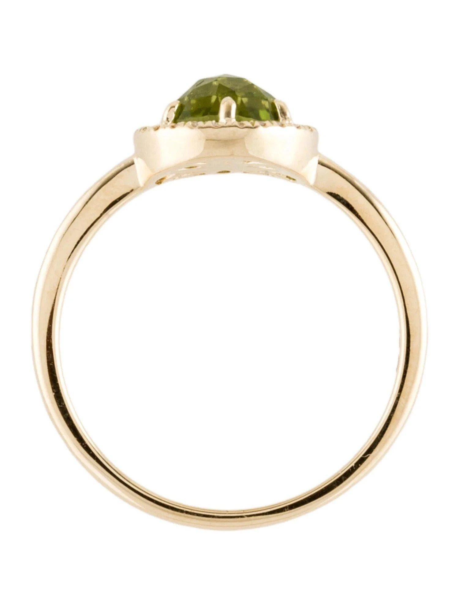 This ring features a 1.31 Carat Peridot, with a Diamond Halo comprised of 0.06 Carats of Single Cut Round White Diamonds. This ring is set in 14K Yellow Gold, and the diameter measures out at 9 MM. Ring Size is 6 1/2.