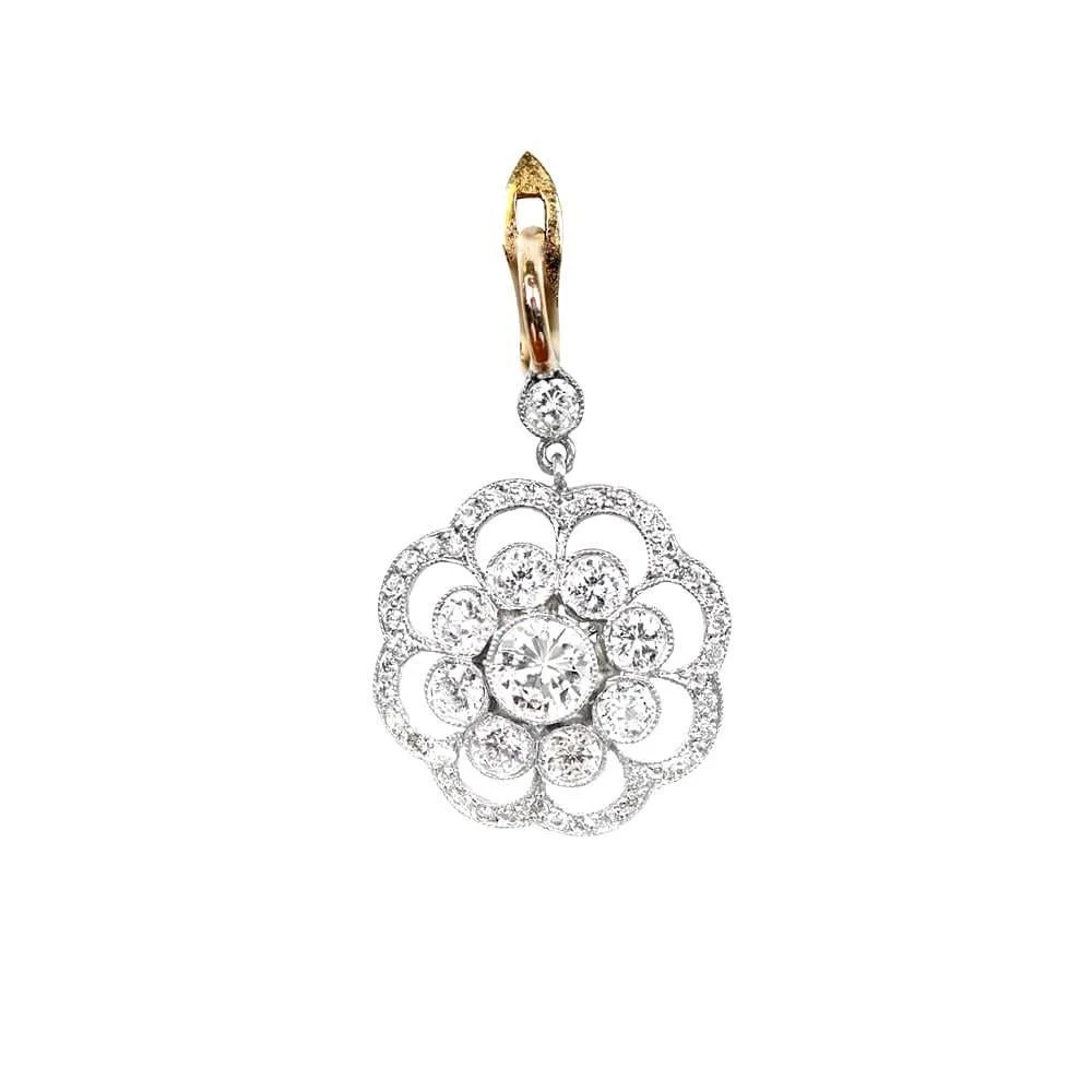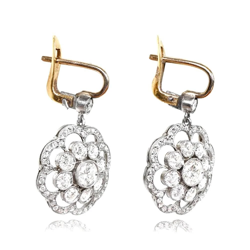 The intricate floral halo design surrounding the diamonds evokes a sense of timeless elegance and romance. Each bezel-set diamond is meticulously placed to enhance its individual brilliance, while the pave-set diamonds in the halo add a touch of glamour and visual appeal. These earrings effortlessly blend vintage charm with contemporary craftsmanship, making them a perfect accessory for both formal occasions and everyday wear.