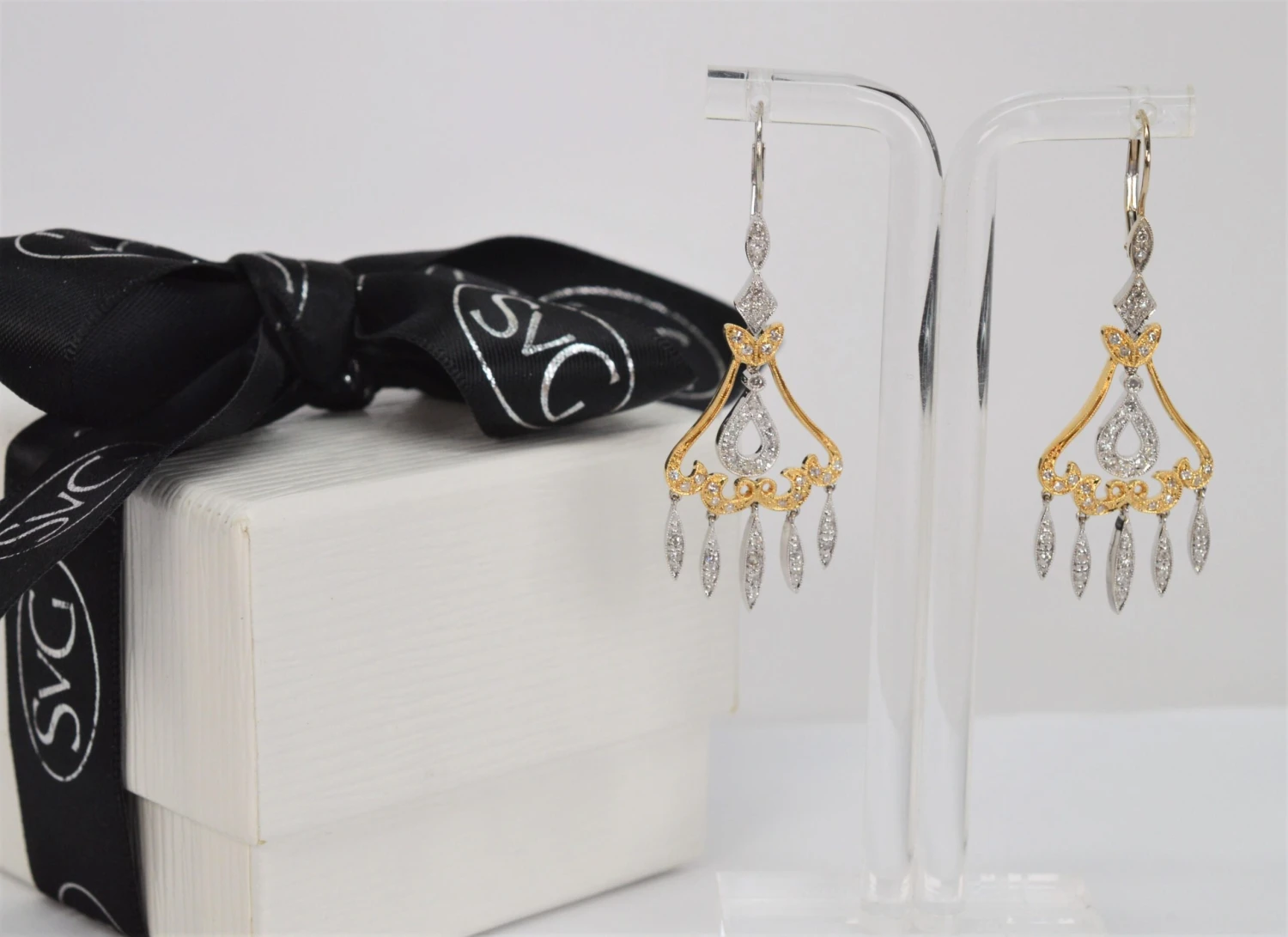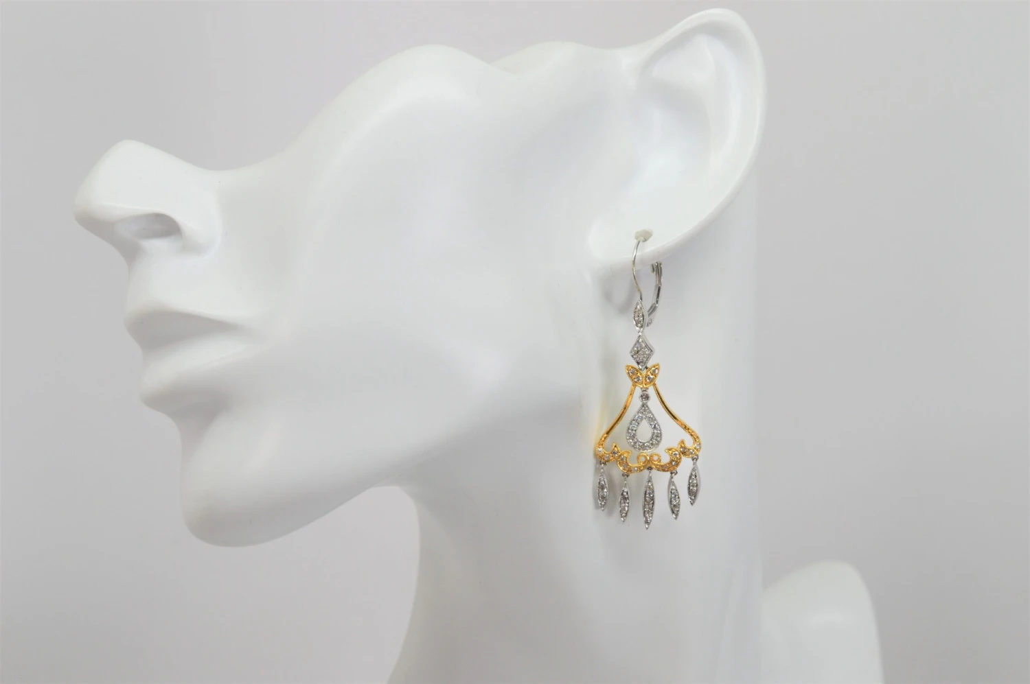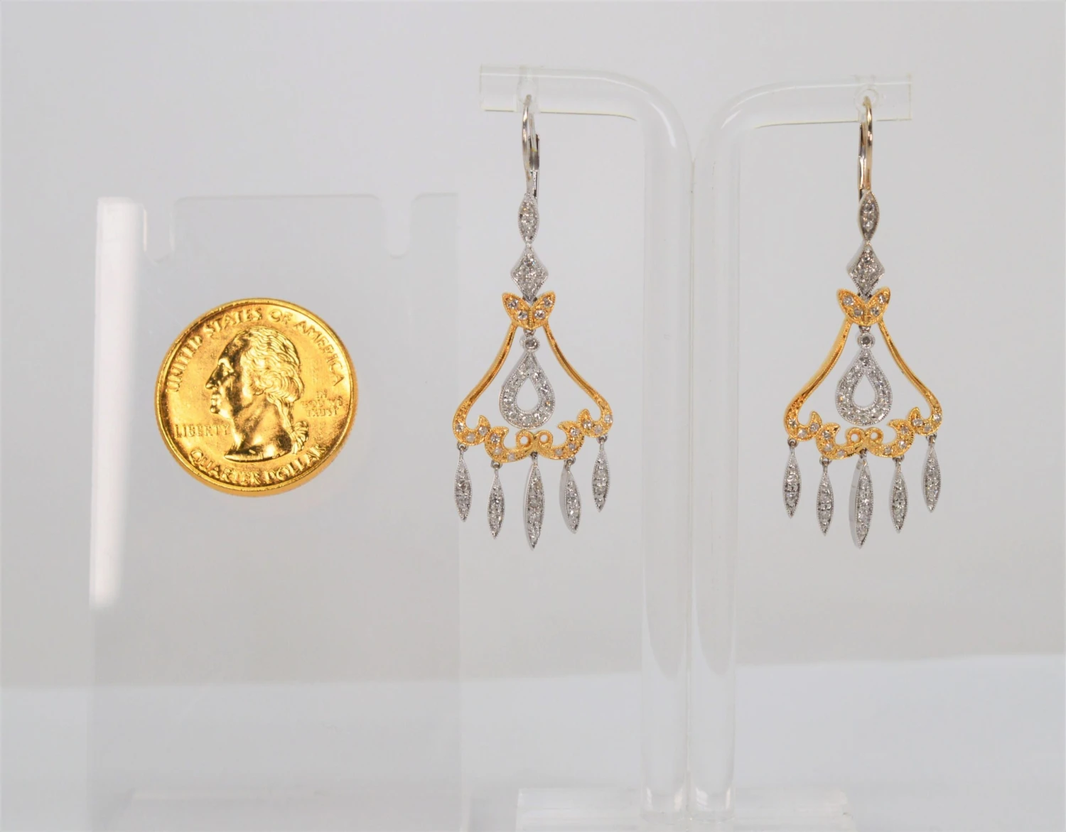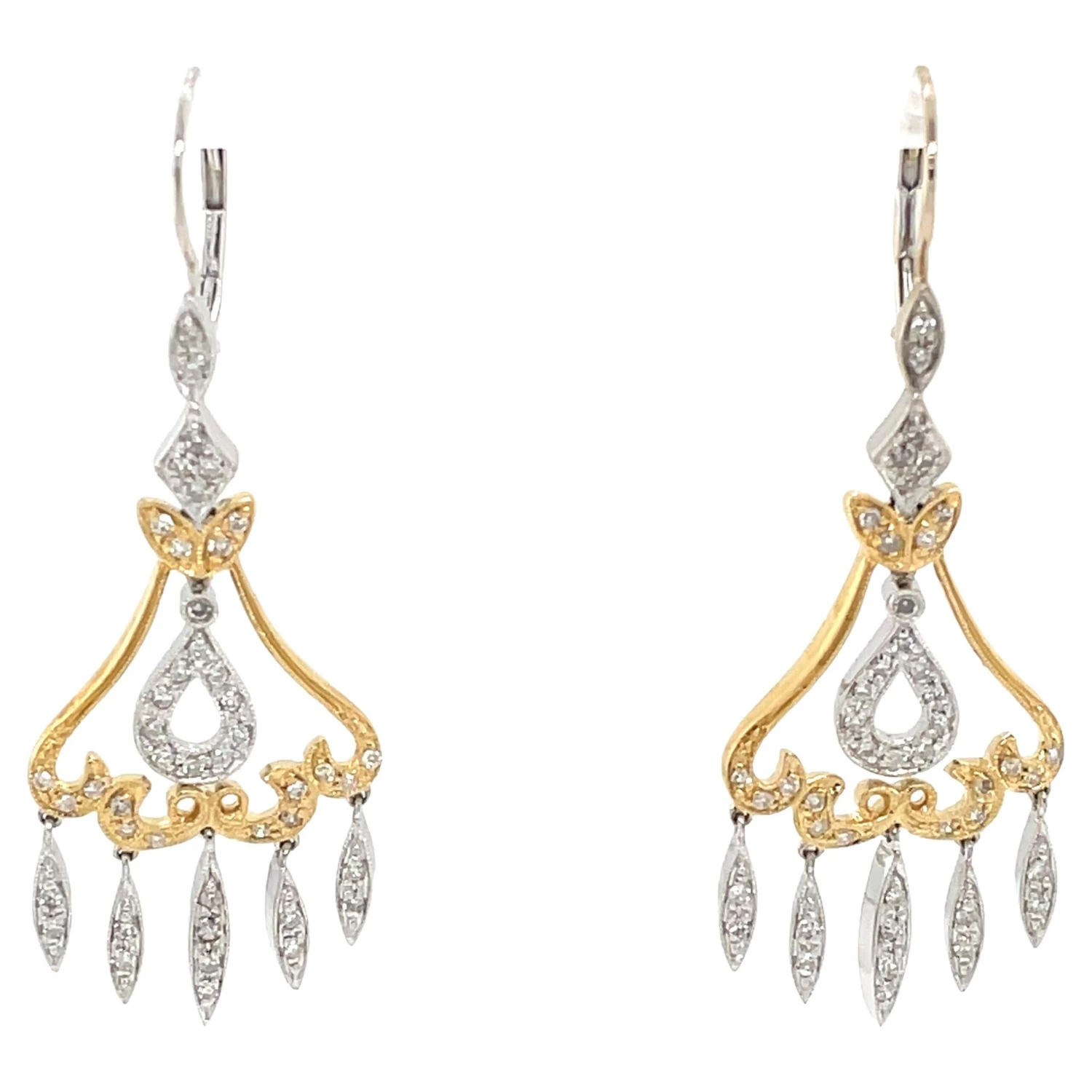Bright white diamonds light up this two tone elegant pair of 14 karat white and yellow gold chandelier earrings. Dramatic, the pair is very versatile and perfect for bridal, a formal occasion or to dress up an evening wardrobe favorite. The diamond covered marquise drop design creates alluring movement and has just the right amount of sparkle. Measuring two inches in length and approximately 3/4 inch wide, the earrings are fitted with round lever back closures. Gift Boxed.