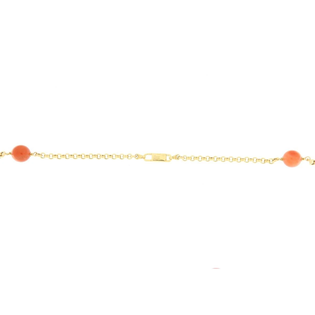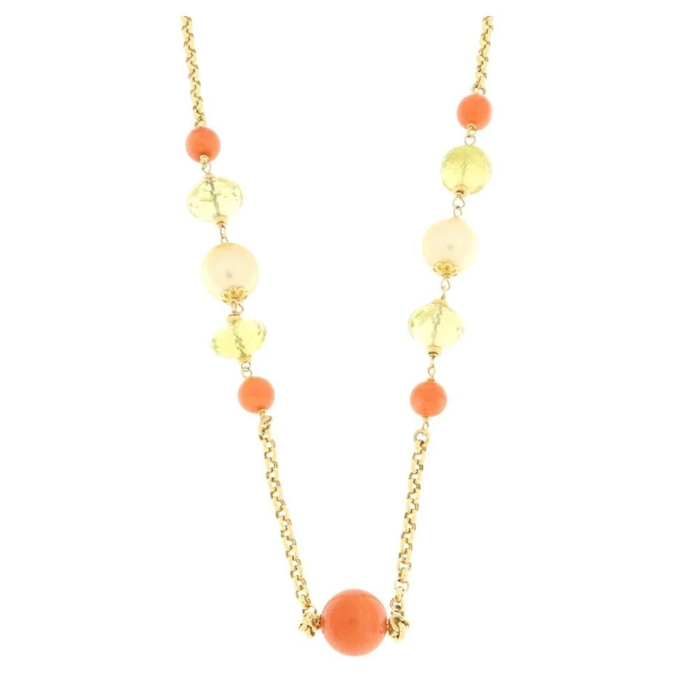 The yellow gold necklace is 95 cm. long and is interspersed with orange-colored Japanese coral beads, Australian pearls, and faceted lemon quartz rondelles. The necklace link is a rollò. The necklace can be worn either long or double twisted, thanks to the presence of a concealed lobster clasp. It can become dressy or casual depending on the outfit it is worn with.