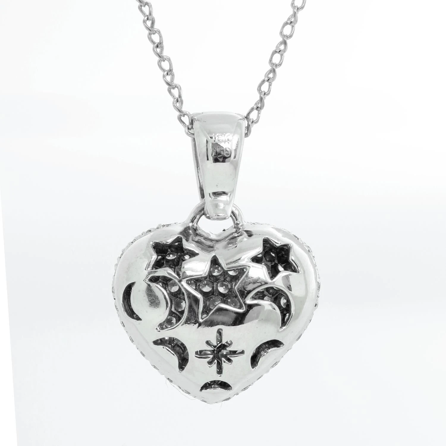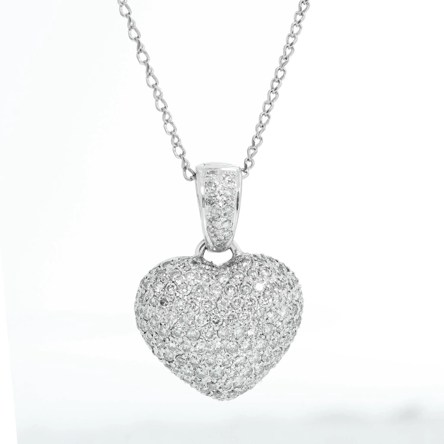 18K White Gold Pave Diamond Necklace – Beautiful Pave white gold diamond heart measuring 1 inch. on a 20 inch white gold chain. Approx. 1 cts of diamonds. Pre-owned with custom necklace box.
