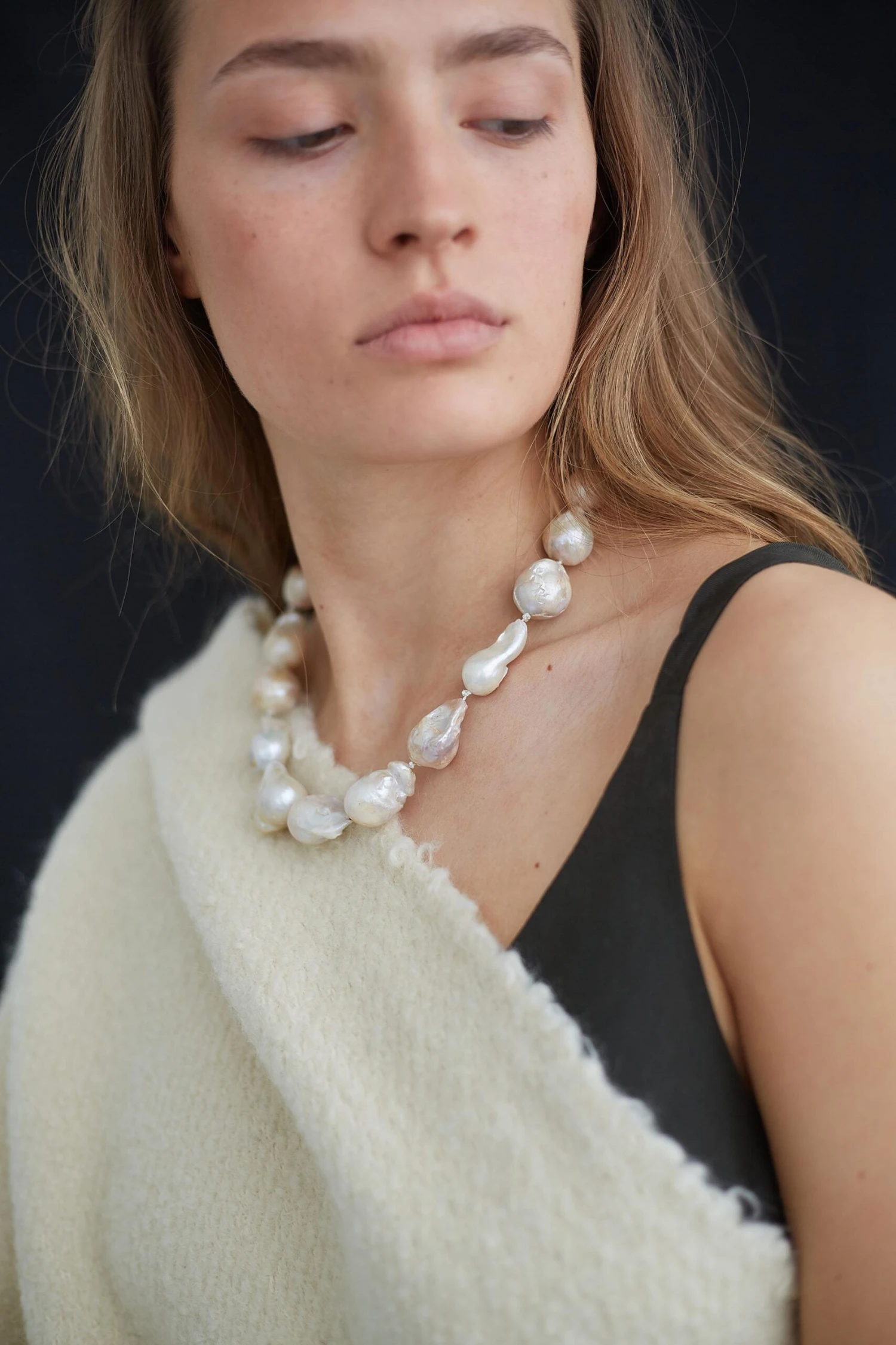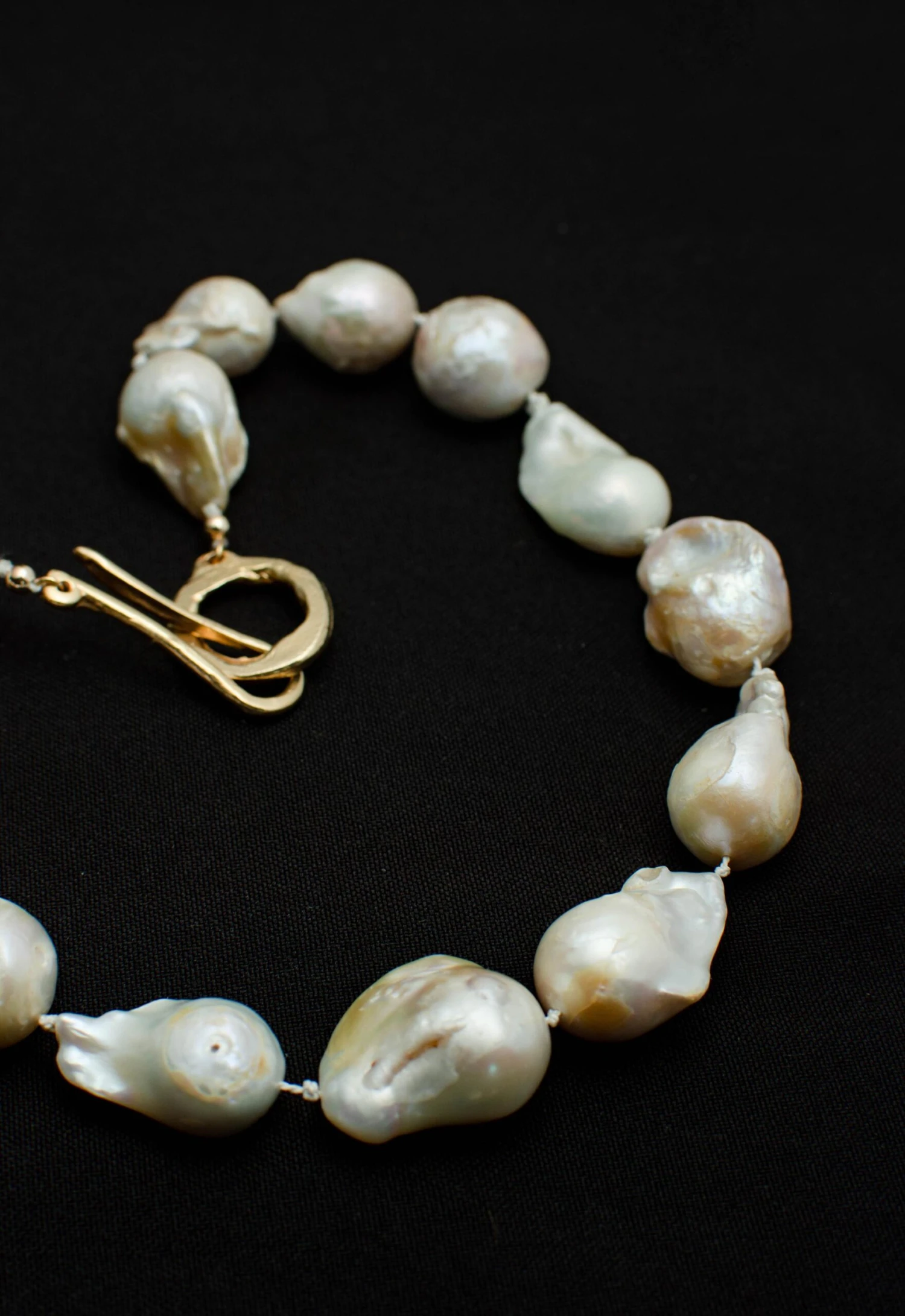 Elegant collar with stunningly irregular baroque pearls. A statement piece worn beautifully on its own . Each baroque pearl is carefully threaded on silk thread. Sterling silver 24k gold plated toggle closure at back.