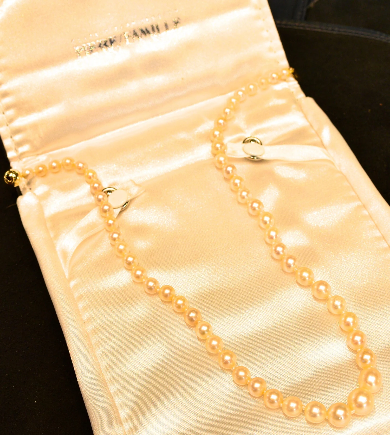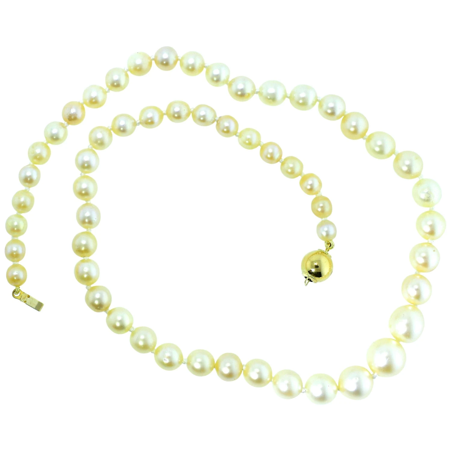 This strand is 16 inches long, finished with a yellow gold clasp. The 54 matching salt water, round pearls possess fine luster, even skins, round, and a deep nacre. They are slightly graduated and range in size from 5.25 mm. up to 9.37 mm. These fine pearls are matched well in their white color. They are strung on silk and knotted between each pearl.