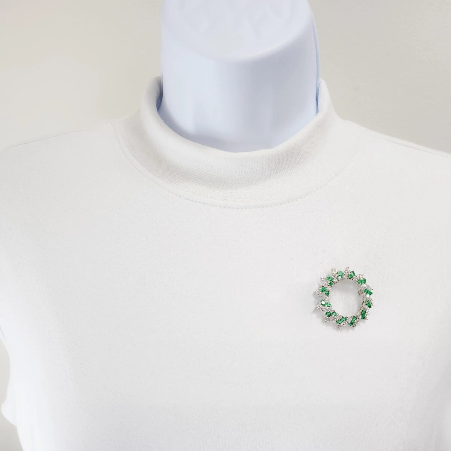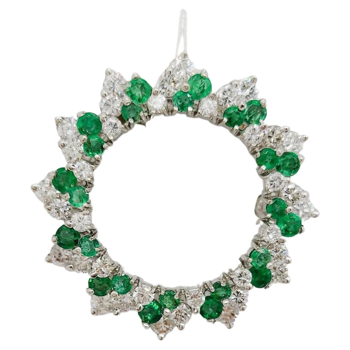 Beautiful bright green round and white diamond round brooch. Handmade in 14k white gold.
