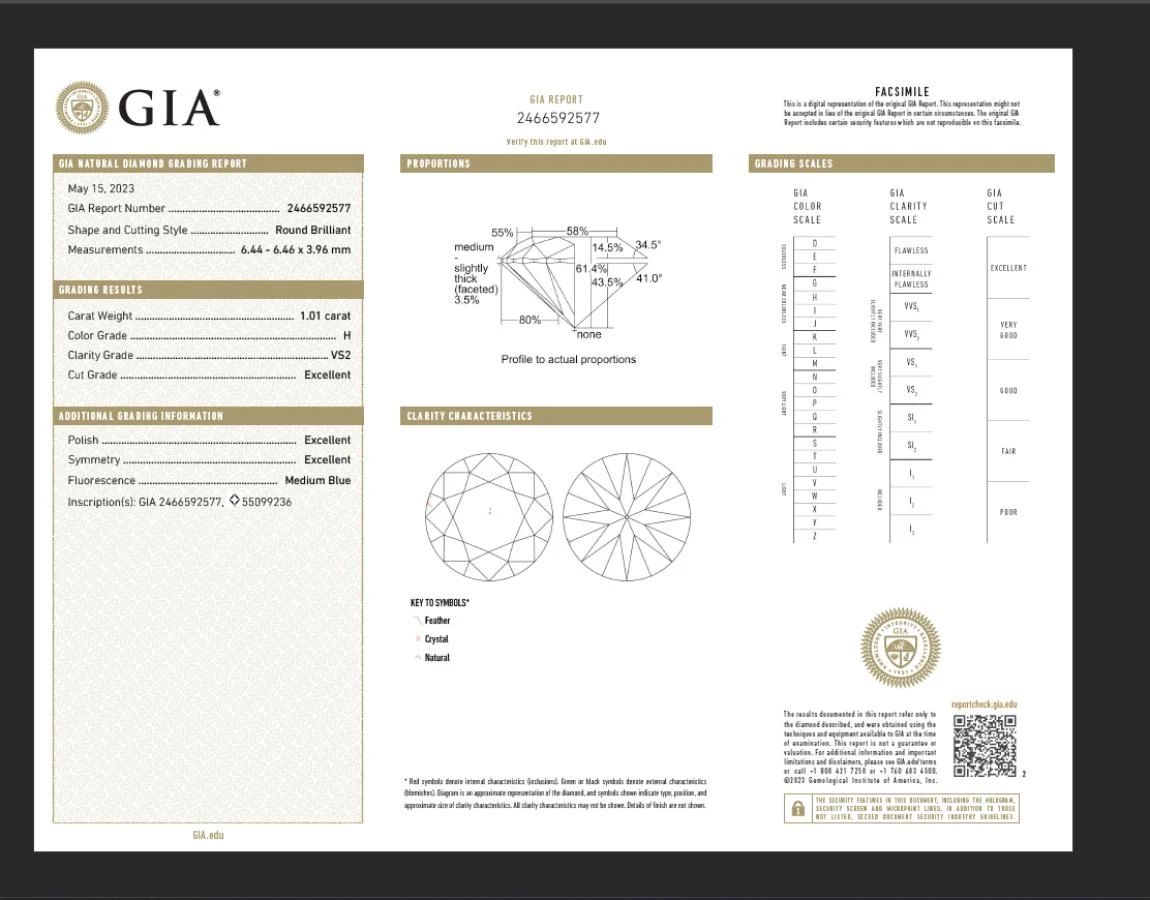 With its 1.01-carat weight, this diamond commands attention with its impressive size and presence. The exquisite Round Brilliant cut shape maximizes its scintillation, allowing the gem to burst into a dazzling display of fire and brilliance. Every facet has been carefully angled and polished to optimize the diamond’s light performance, ensuring an unrivaled sparkle that will catch the eye from across the room.
