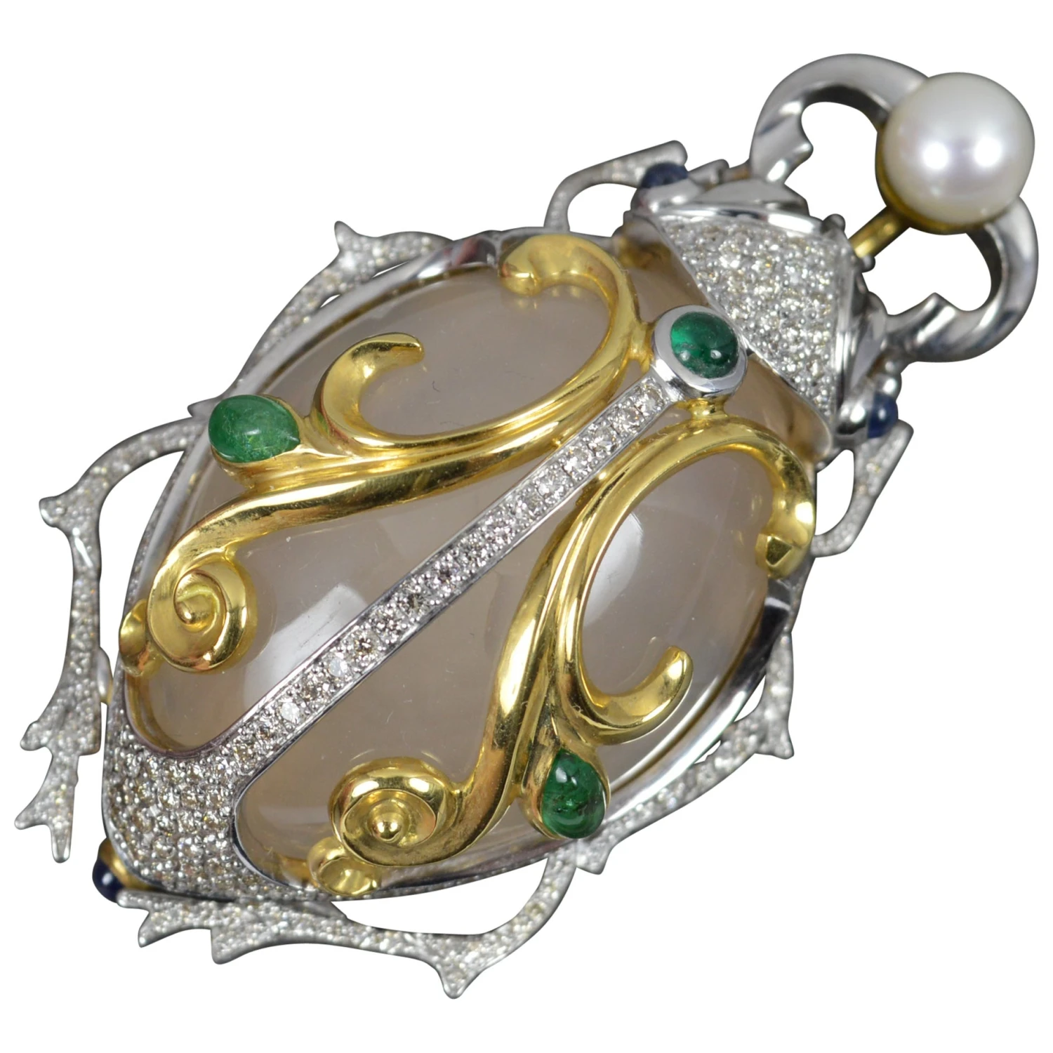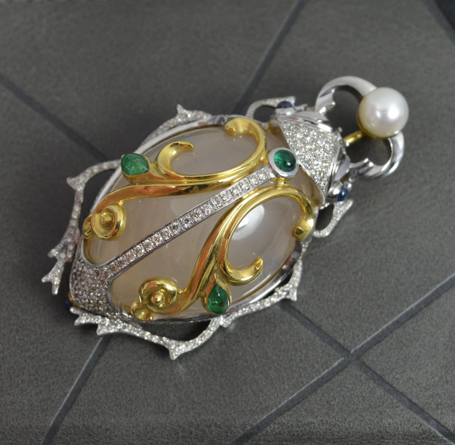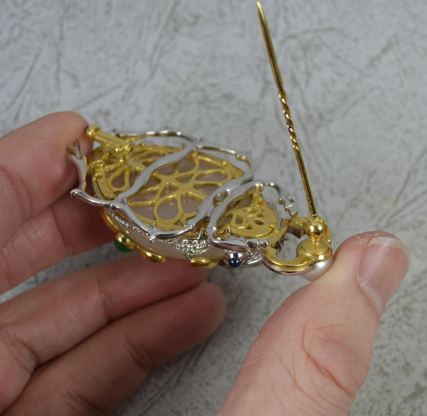 Complete with sapphire cabochons to the eyes and base of pin and round / pear shaped emerald cabochons to the body.
