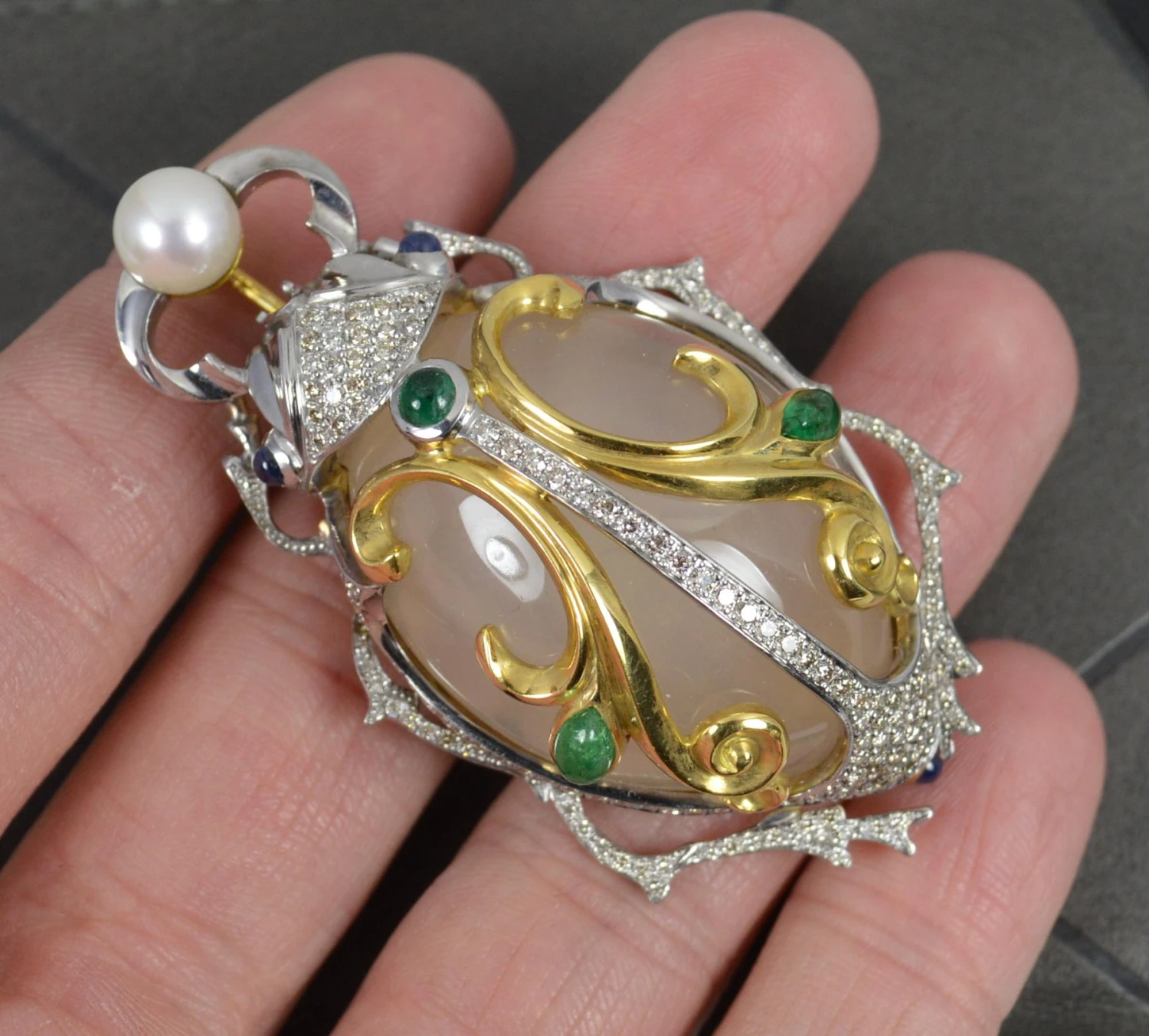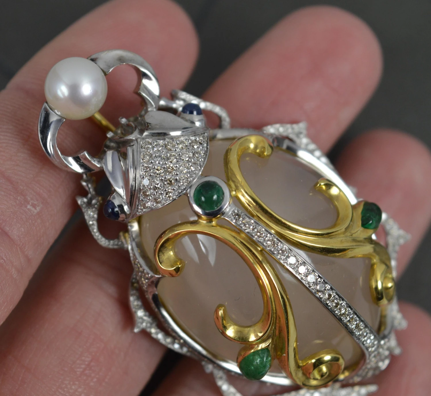Designed with a pearl to top. The head, body and legs all pave set with many round brilliant cut, vs clarity diamonds, over 2cts.